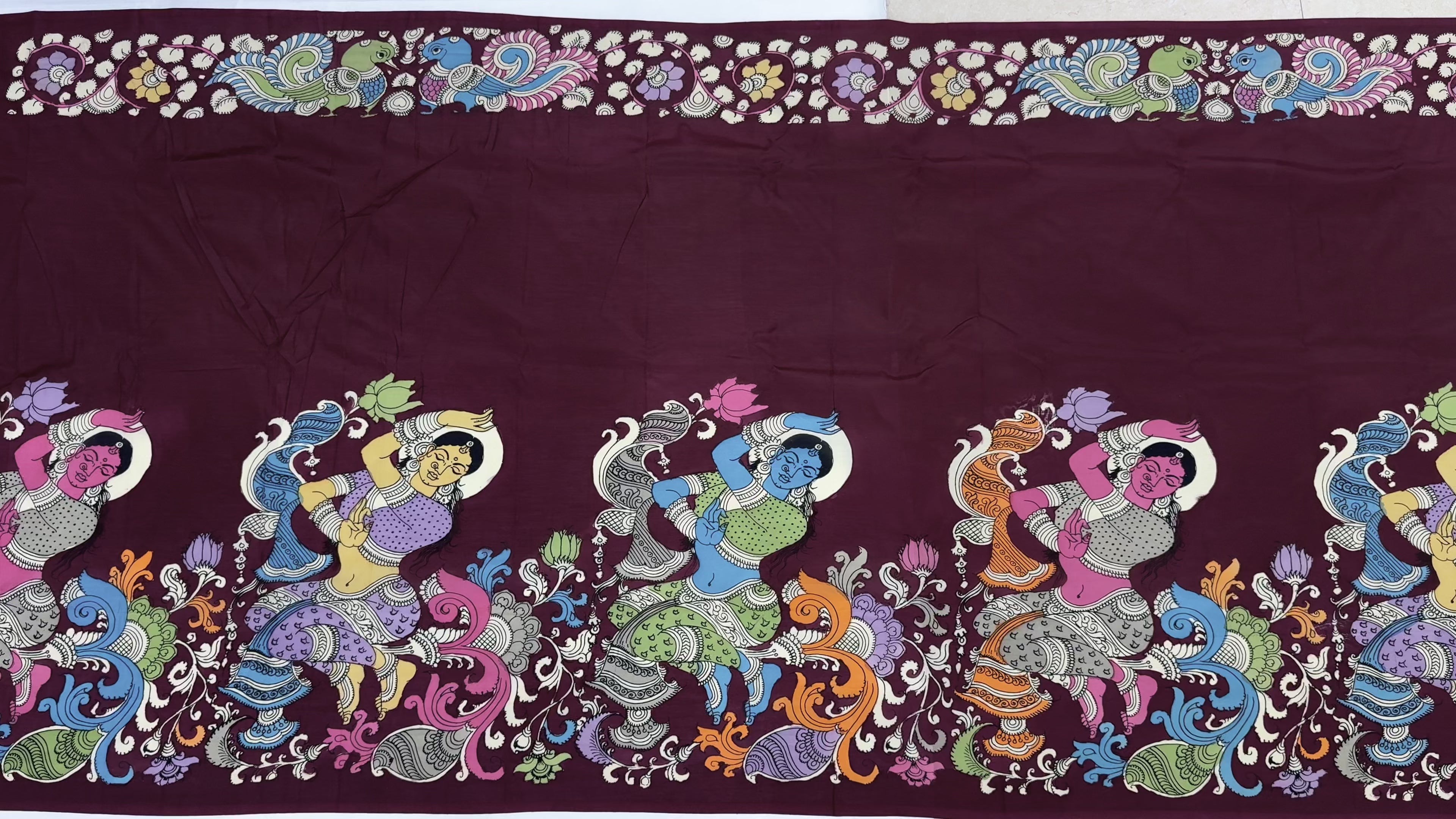 Burgundy Mangalagiri Silk Pen Kalamkari Saree with Handpainted Mythological Motifs, Width 110 Cms, Origin: Sri Kalahasthi, India, 5.5 Mtrs with Blouse Piece-D22865