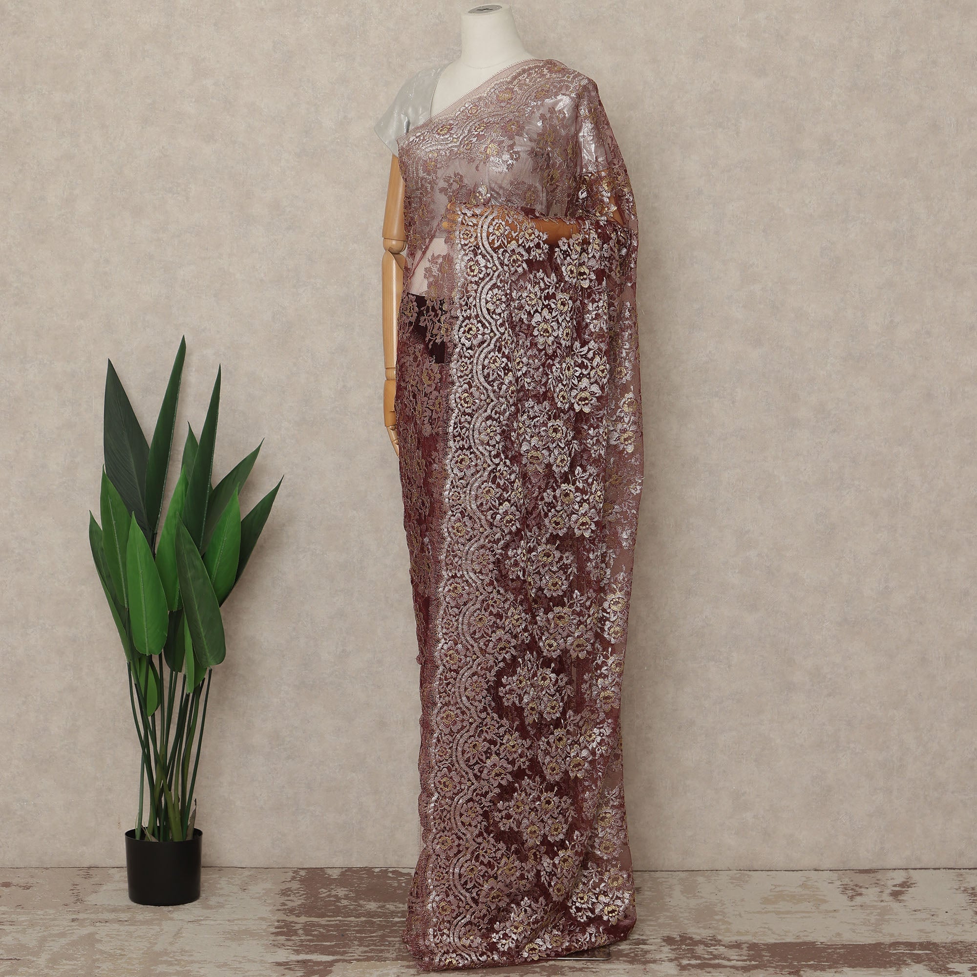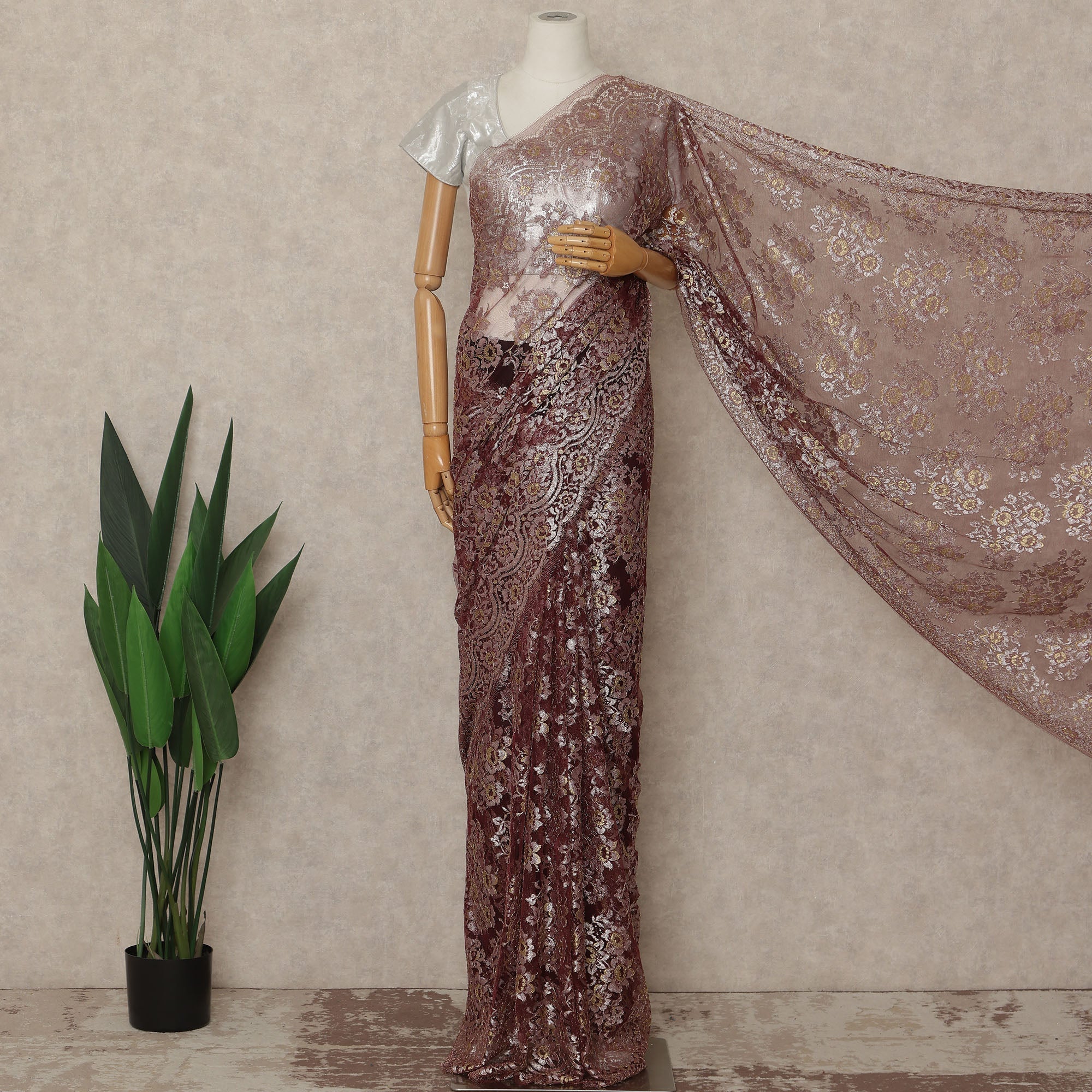 This burgundy wine premium French metallic Chantilly saree lace fabric is ideal for designers, boutiques, and women who seek rich elegance with a luxurious finish. Crafted in France, the intricate floral net pattern is enhanced with a refined metallic sheen that brings depth, warmth, and sophistication to sarees and couture drapes. Supplied as a single continuous piece of approximately 5.5 meters with a generous 110 cms width, it supports seamless draping, graceful pleats, and versatile styling for weddings, evening events, and festive occasions. Lightweight yet visually opulent, this lace offers comfort while maintaining a premium designer appeal. Blouse fabric is not included, allowing full creative customization.