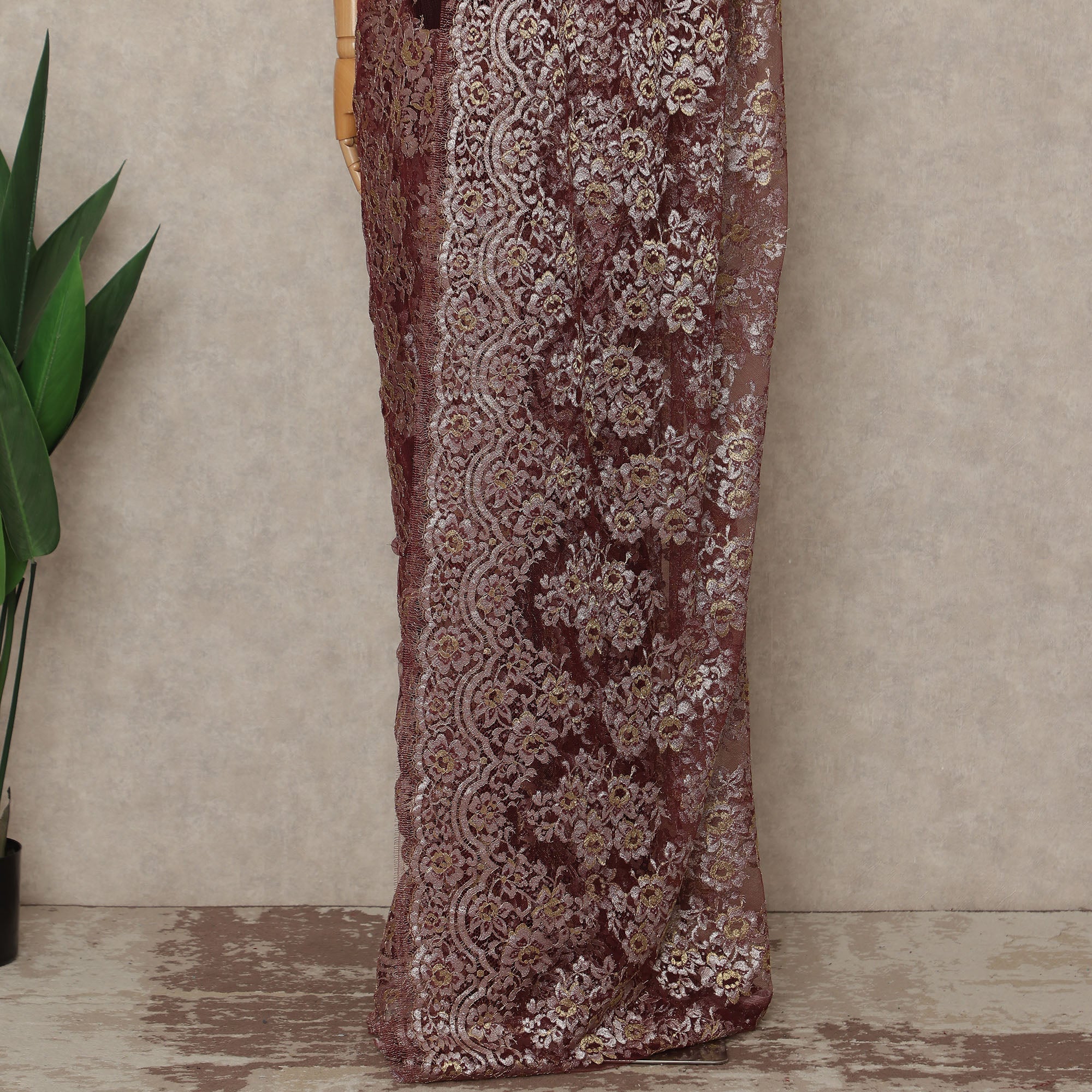 Burgundy Wine Premium French Metallic Chantilly Saree Lace Fabric 110 Cms Width 5.5 Meters Piece Elegant Floral Net Lace From France For Designer Sarees And Couture Draping-D27674
