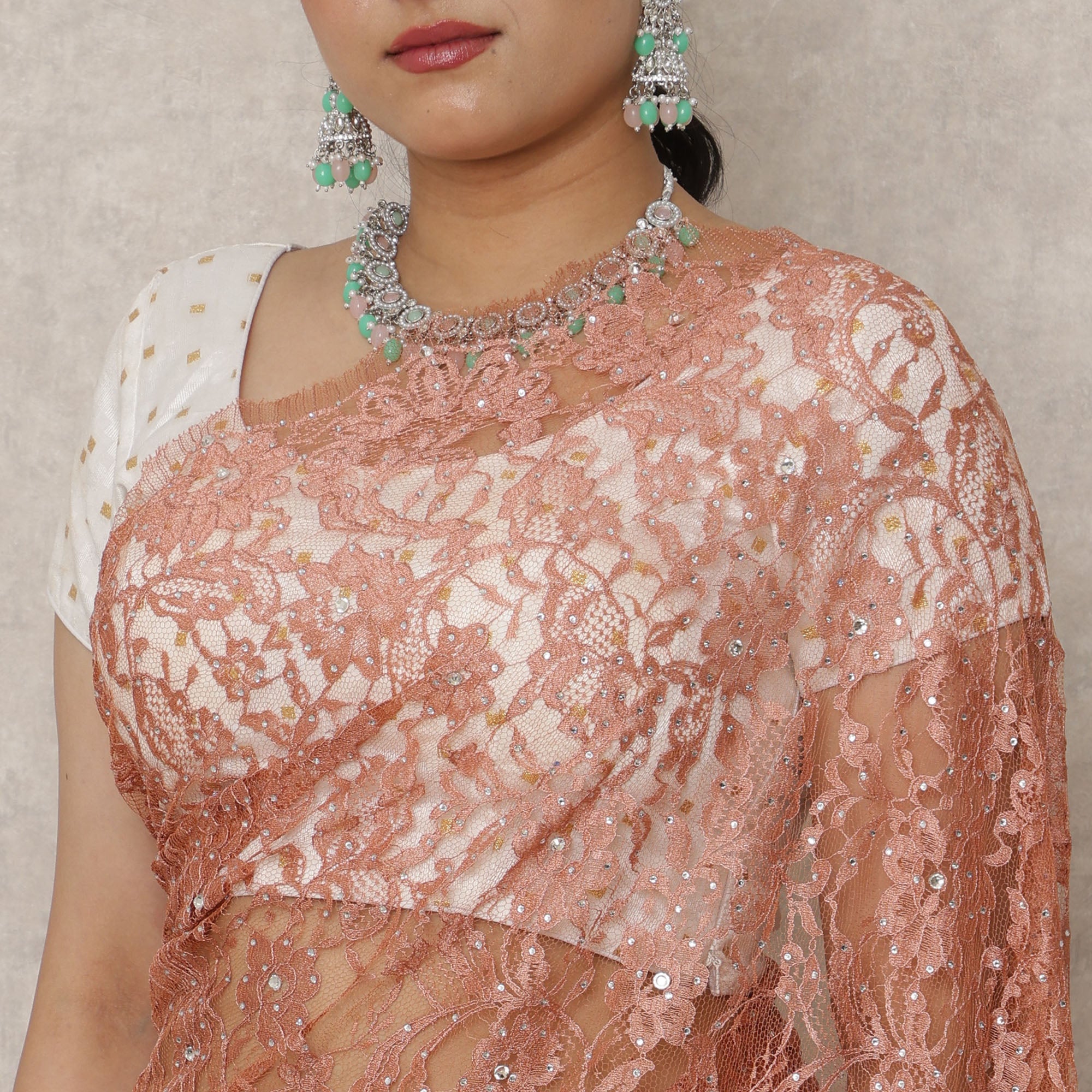 Exude understated elegance with this Burnt Coral saree, finely crafted from luxurious French Chantilly lace and enhanced with shimmering stone work that adds just the right touch of festive sparkle. The warm burnt coral hue lends a sophisticated yet earthy charm, perfect for occasions ranging from intimate weddings to cultural soirées. This premium saree, measuring approximately 5.5 meters in length and 110 cm in width, offers a fluid and flattering drape that adapts beautifully to both traditional and contemporary styling. The floral lace detailing imparts a delicate texture, while the lightweight fabric ensures effortless wear through long celebrations. Blouse piece is not included, giving you the freedom to pair it with embroidered, contrast, or metallic blouses for a customized look. Made in France with artisanal precision, this saree fuses ethnic grace with haute couture sensibility. Buy online now and shop online to make this timeless ensemble a treasured part of your wardrobe.