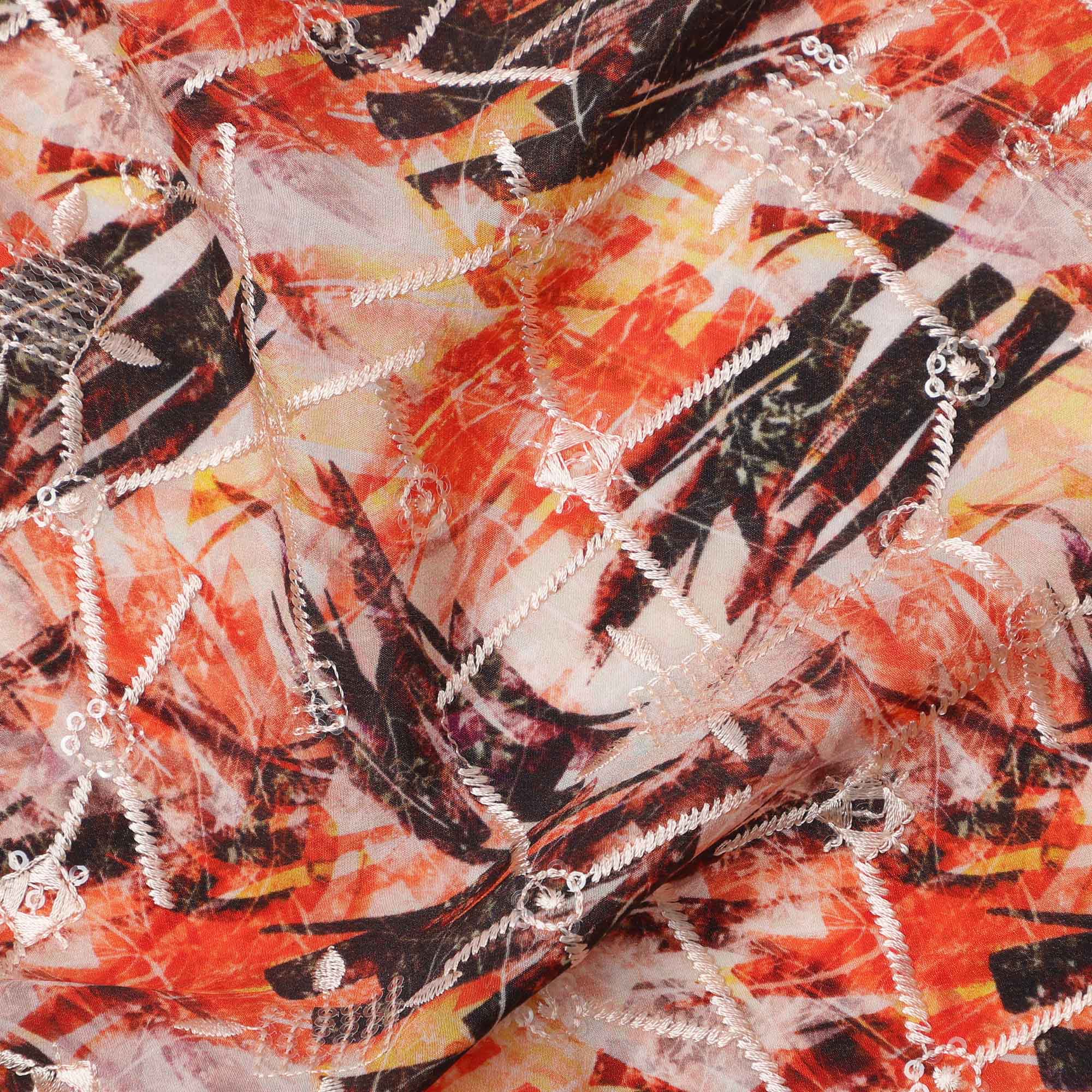 Unleash bold creativity with this burnt orange and black abstract brushstroke digital print viscose crepe fabric that blends fiery vibrance... Read more Read more