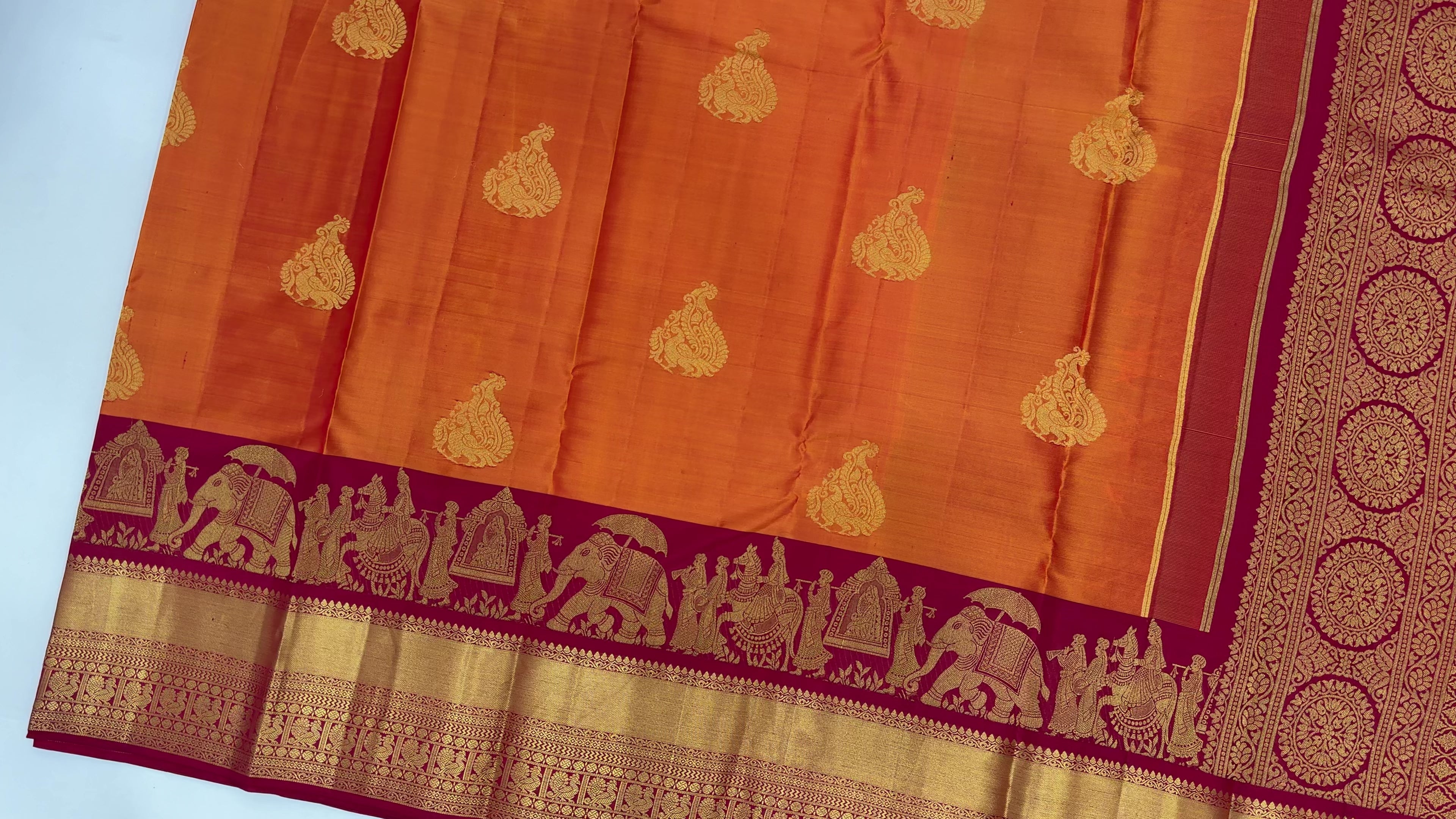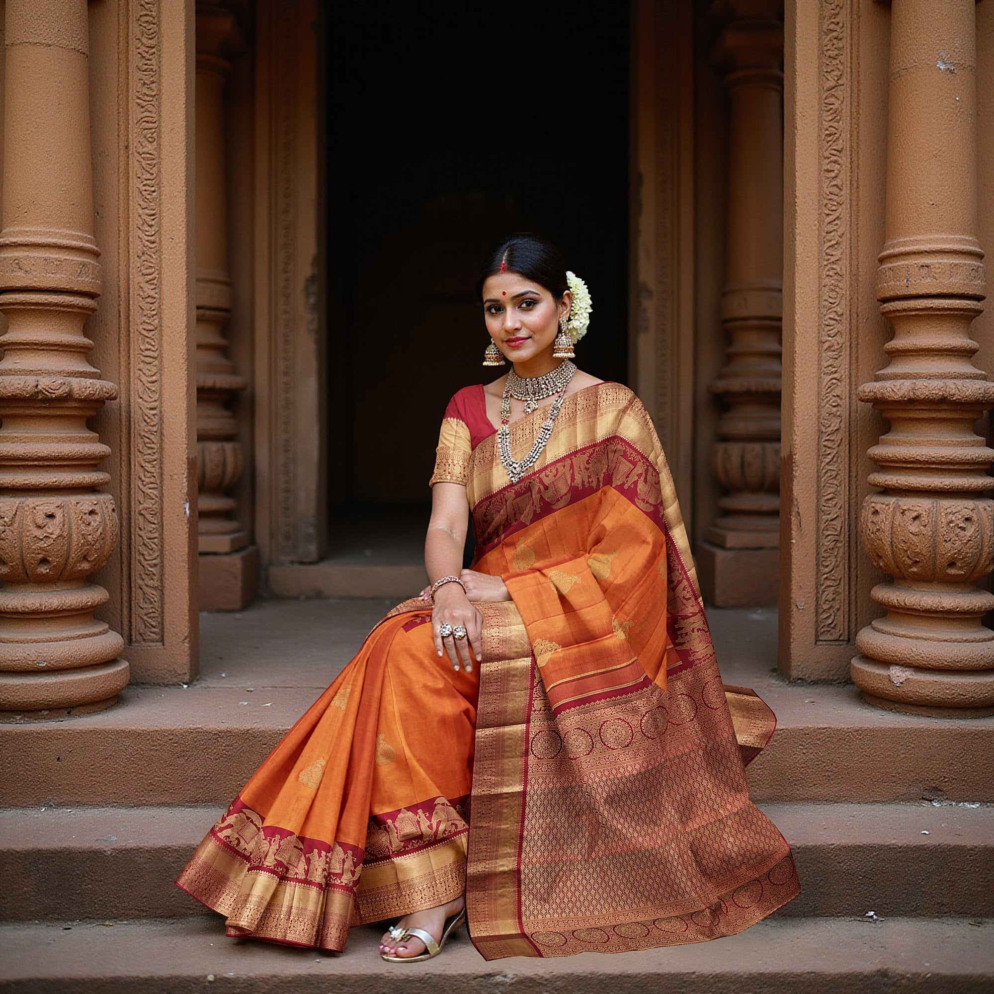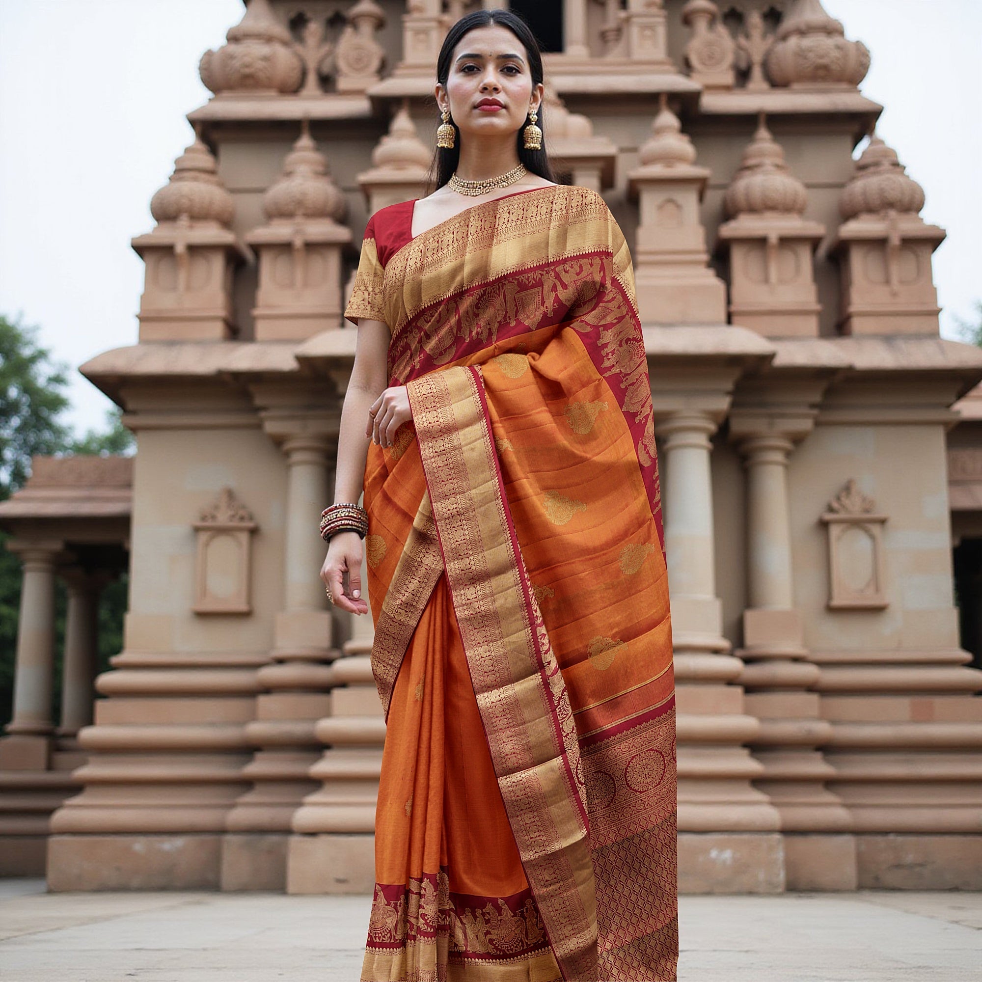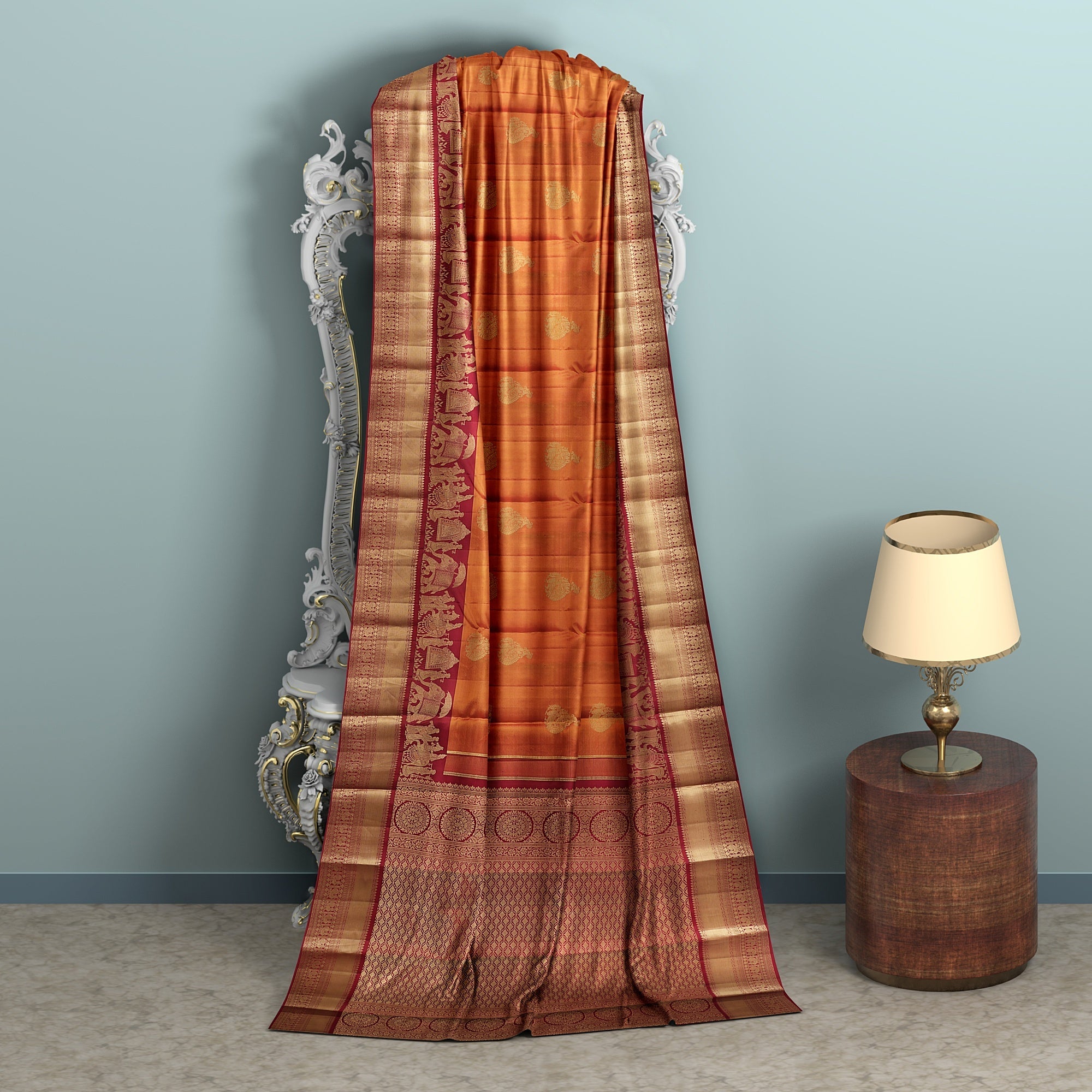 A tribute to the sacred hues of South Indian rituals, this burnt orange and maroon Kanjeevaram pure silk bridal saree is a radiant expression of culture and artistry. The golden leaf buttas scattered across the rich orange body evoke motifs seen in mural paintings and divine scrolls preserved in temple archives. Its intricately woven maroon border, adorned with traditional temple motifs, frames the saree like a ceremonial archway, while the pallu dazzles with circular zari patterns crafted with regal symmetry. Made from the finest Regal Fabrics, each saree takes 48 hours of devoted handloom craftsmanship by expert weavers to reach this level of intricacy and finish. With its lustrous drape and unmatched grace, this saree—complete with a coordinated blouse piece—is perfect for bridal ceremonies. Shop online to own a masterpiece woven in tradition and elegance.