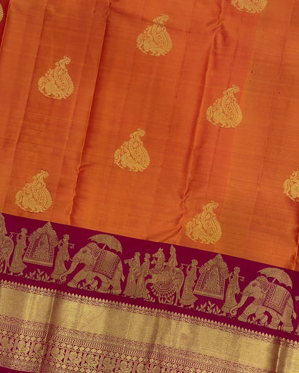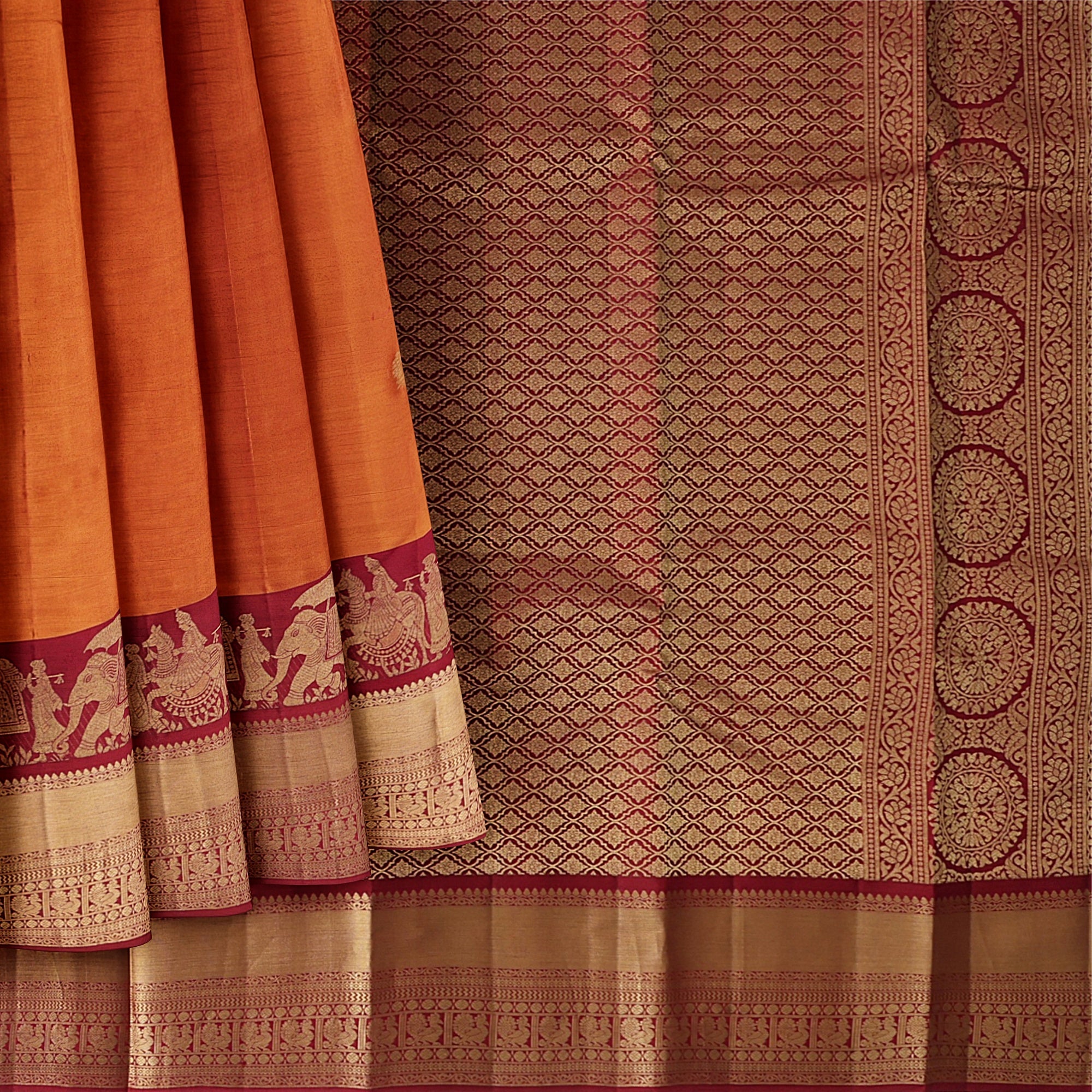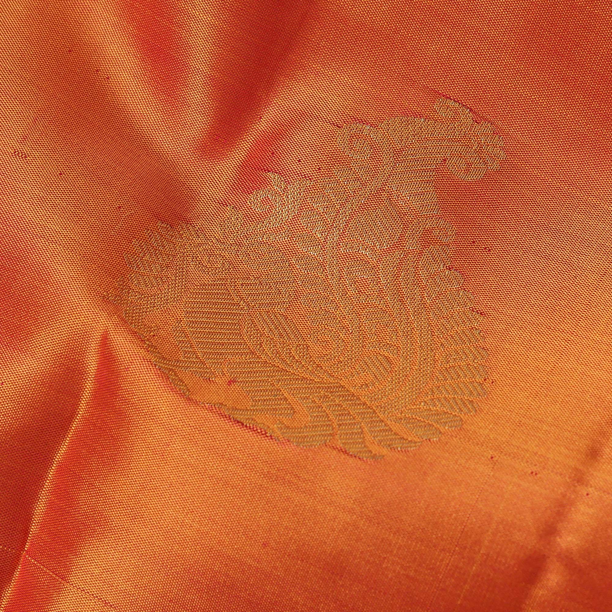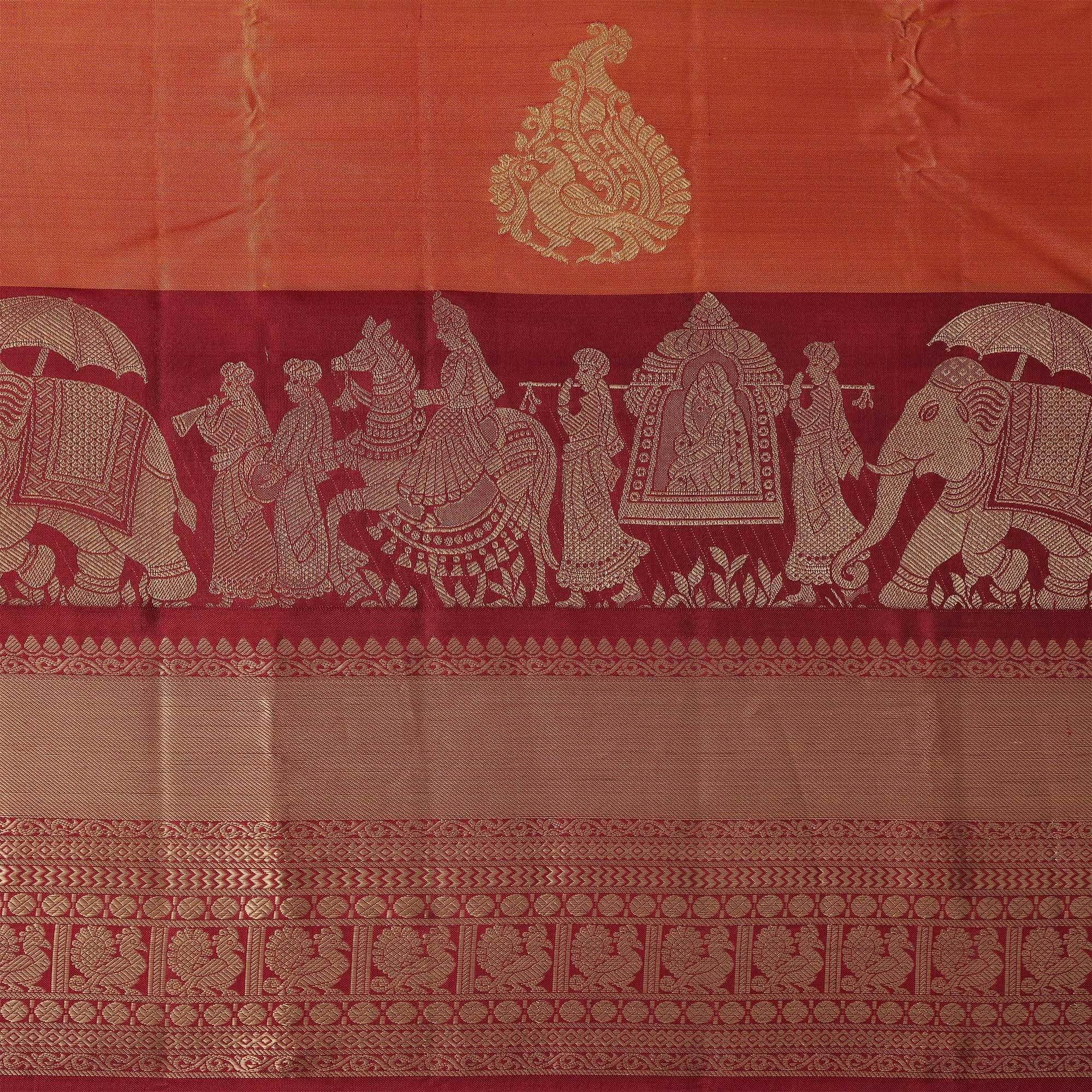 A tribute to the sacred hues of South Indian rituals, this burnt orange and maroon Kanjeevaram pure silk bridal saree is a radiant expression of culture and artistry. The golden leaf buttas scattered across the rich orange body evoke motifs seen in mural paintings and divine scrolls preserved in temple archives. Its intricately woven maroon border, adorned with traditional temple motifs, frames the saree like a ceremonial archway, while the pallu dazzles with circular zari patterns crafted with regal symmetry. Made from the finest Regal Fabrics, each saree takes 48 hours of devoted handloom craftsmanship by expert weavers to reach this level of intricacy and finish. With its lustrous drape and unmatched grace, this saree—complete with a coordinated blouse piece—is perfect for bridal ceremonies. Shop online to own a masterpiece woven in tradition and elegance.