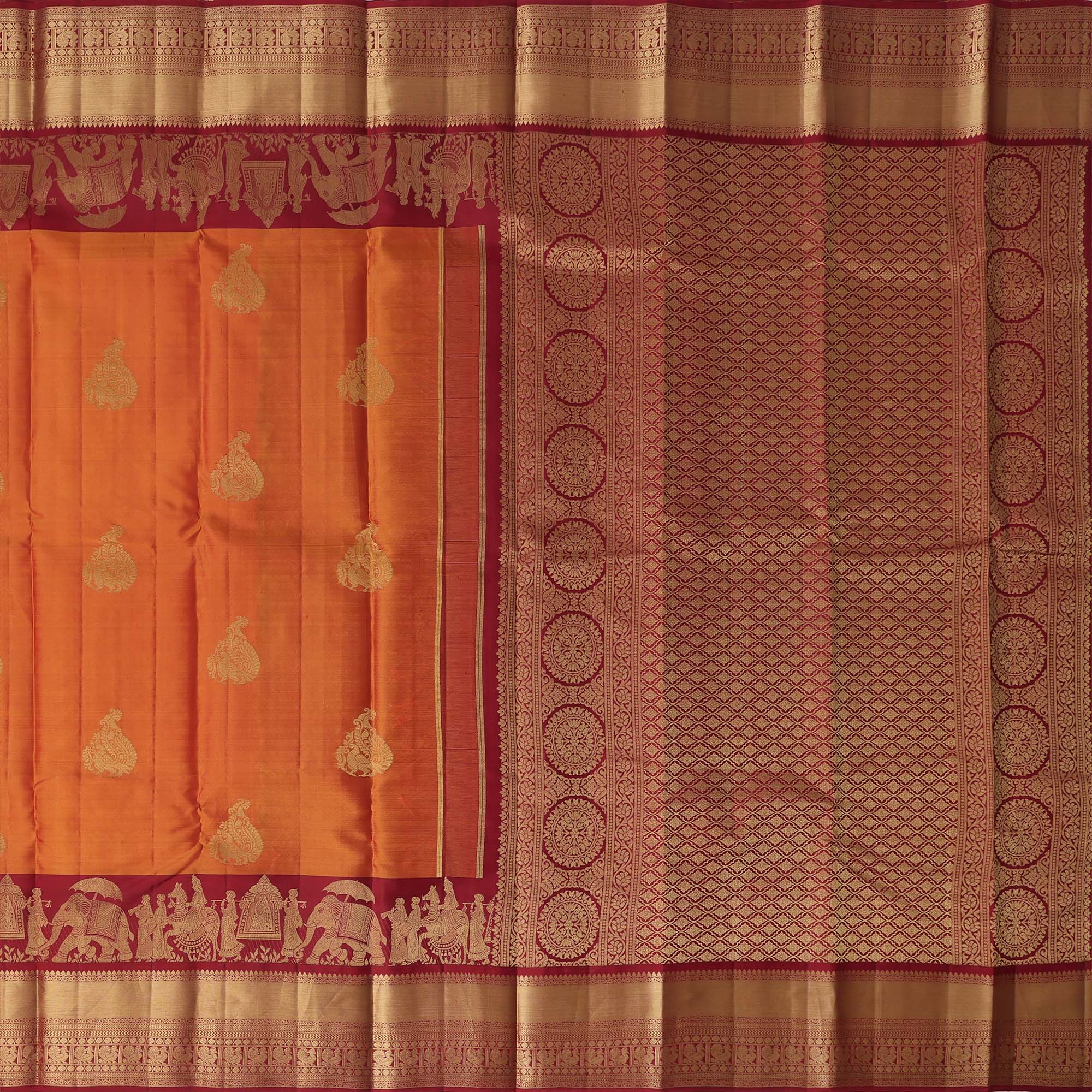 Burnt Orange and Maroon Gold Leaf Butta Kanjeevaram Pure Silk Bridal Saree, Temple Motif Border with Circular Zari Pallu, 110 cm Width, Made in India-D22762