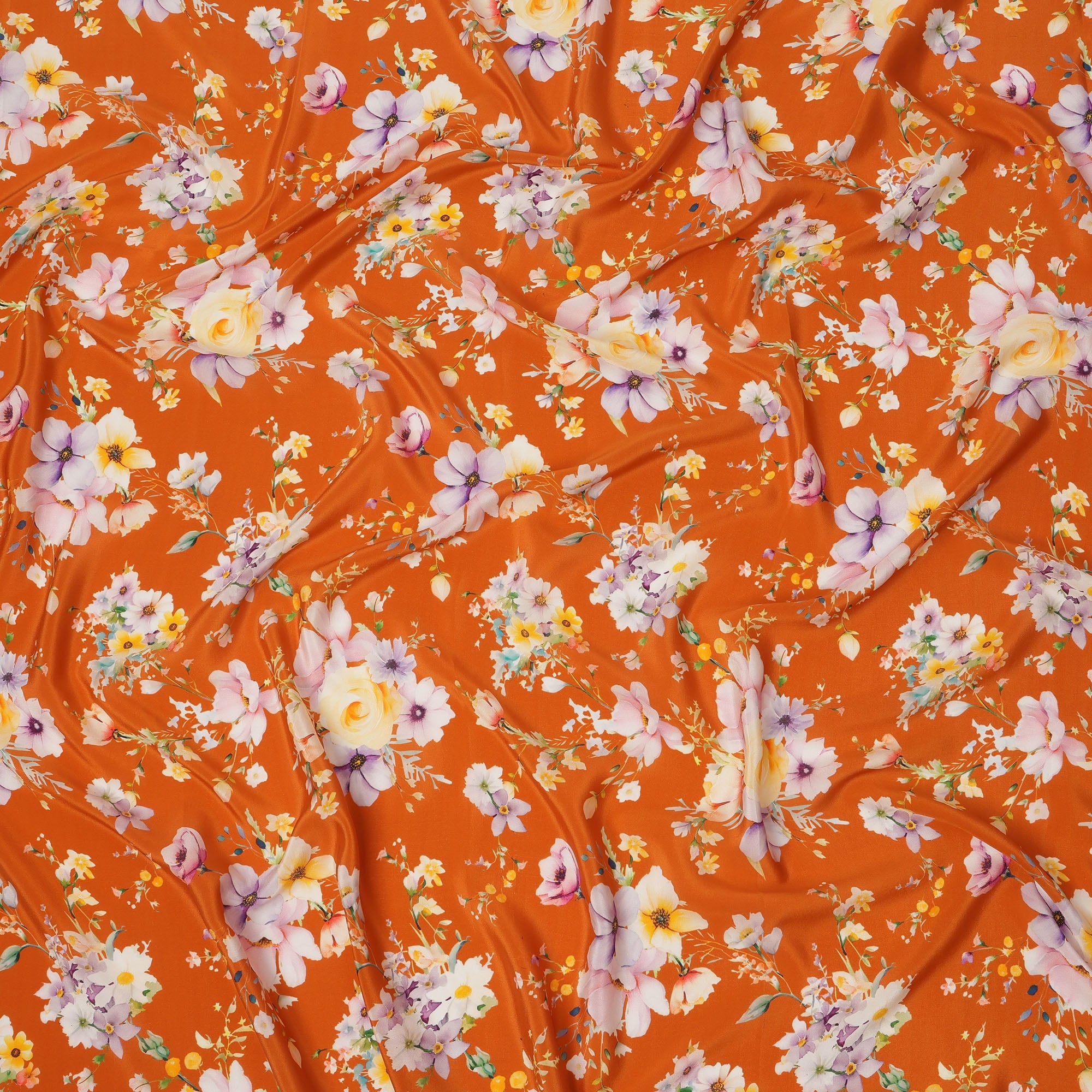 Burnt Orange Base Multicolor Pastel Blossom Printed Pure Silk Crepe Fabric, 110 Cms Width, Made in India-D23969