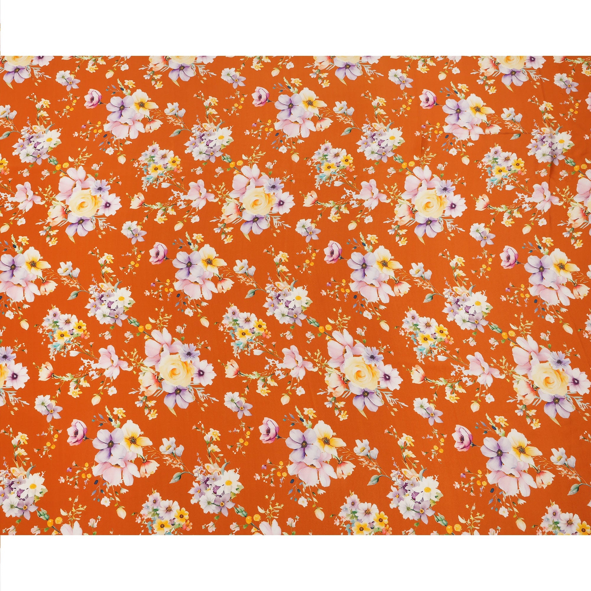 Burnt orange base with digitally printed pastel floral blossoms in lavender, yellow, and ivory
