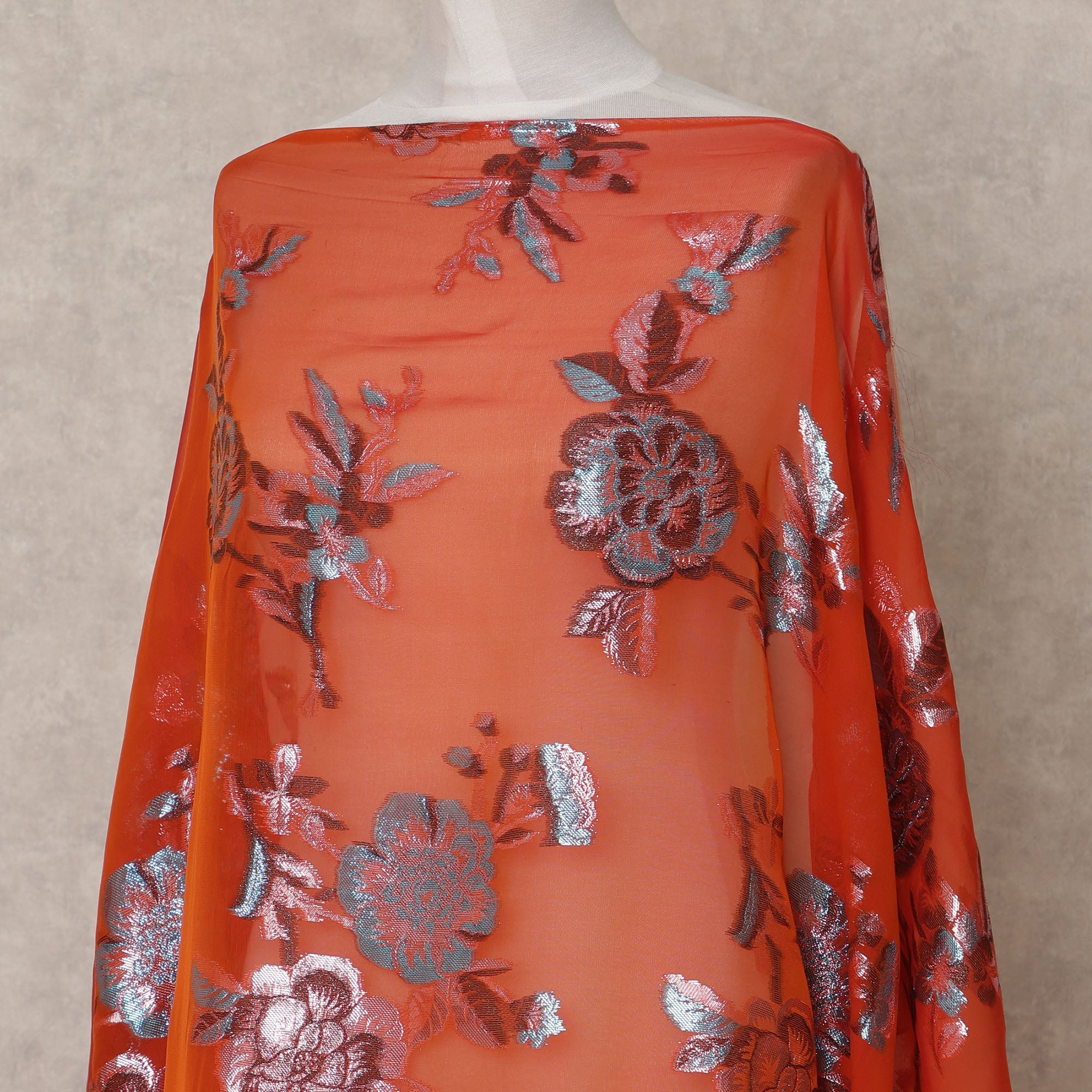 Burnt orange chiffon base with shimmering rose gold and blue floral lurex embroidery