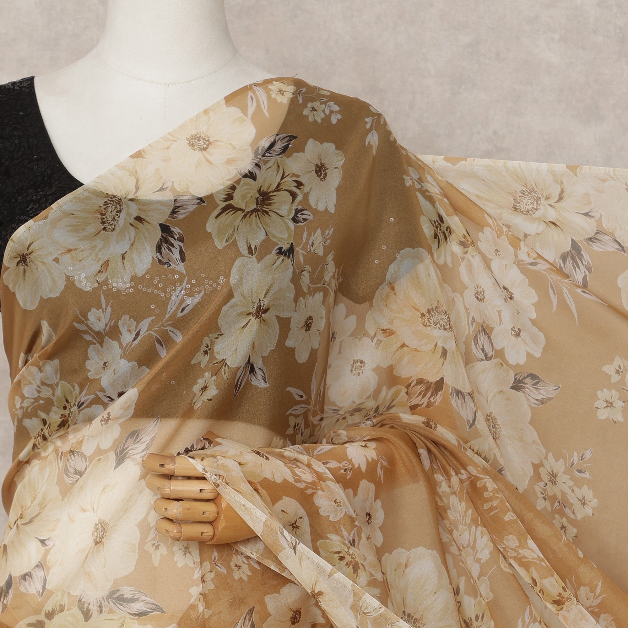 Caramel Brown Premium Pure Silk Chiffon Floral Printed Saree, 5.5 Mtrs Length, 110 Cms Width, Made in India-D24237