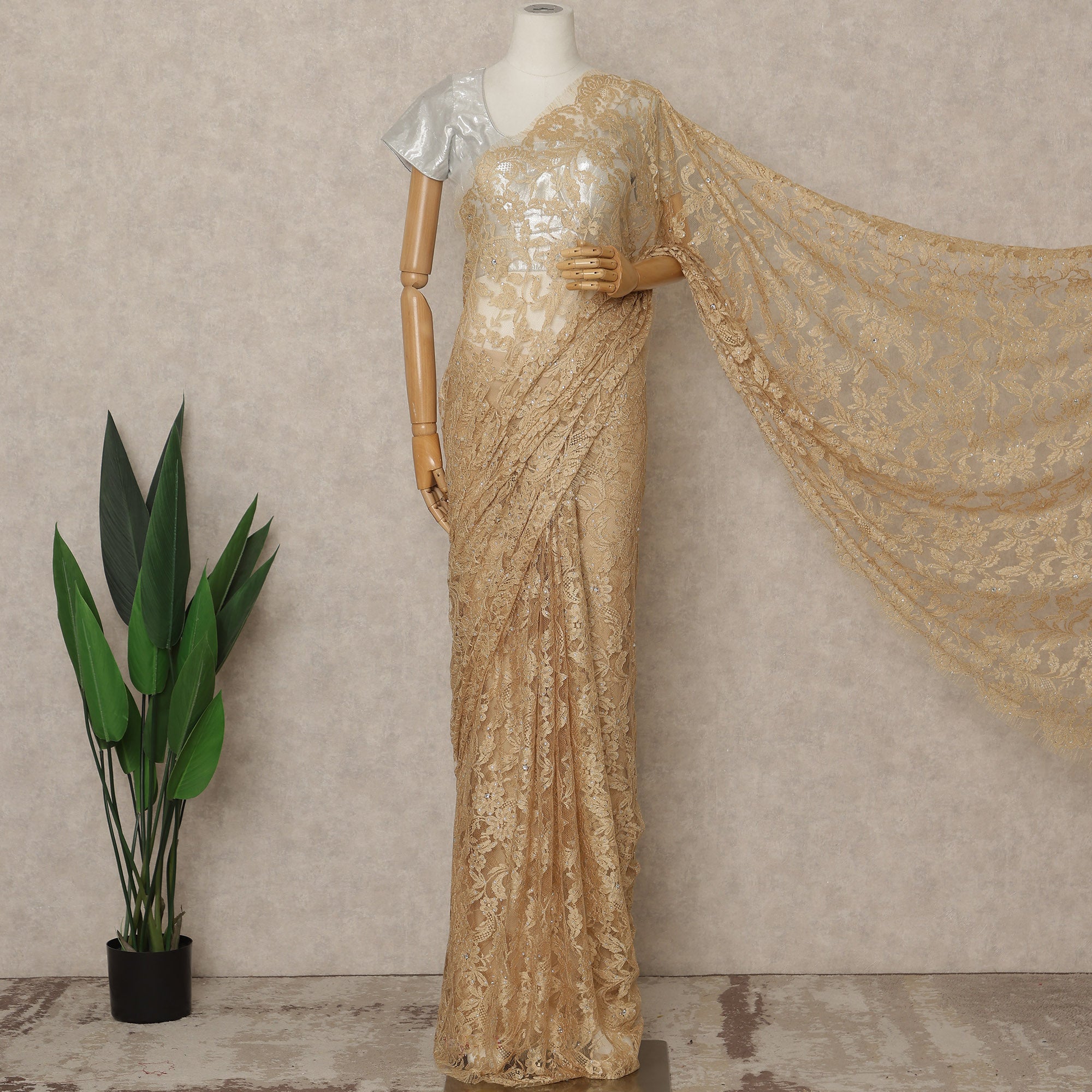 Champagne Beige Premium French Chantilly Saree Lace with Stone Work 5.5 Mtrs Length, Width 110 Cms and Made in France-D27158