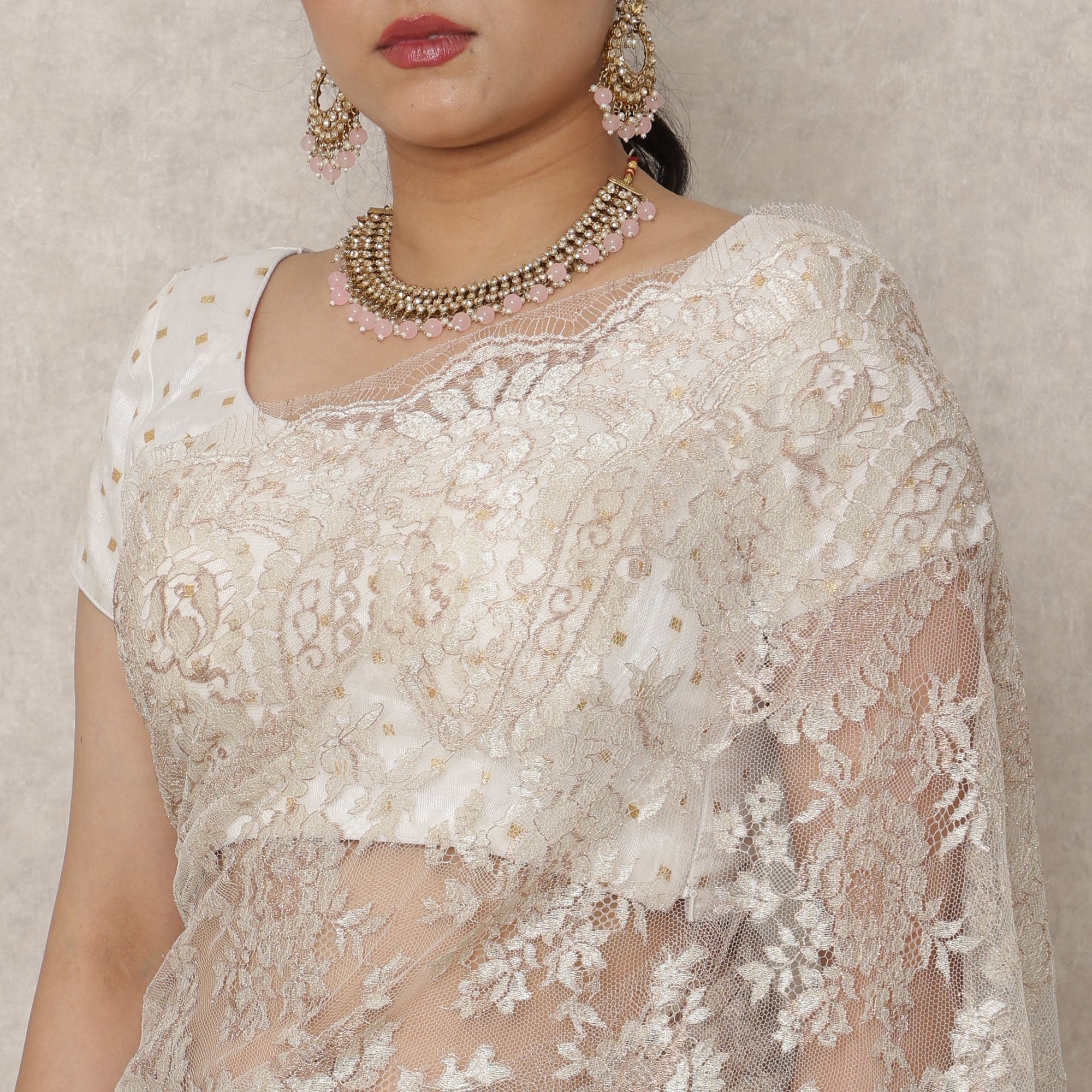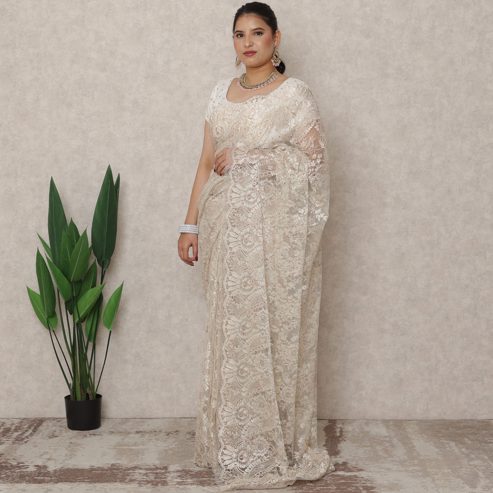 Elevate your ethnic wardrobe with this exquisite Champagne Beige saree, woven from the finest French Metallic Chantilly lace for an ethereal and sophisticated appeal. Measuring approximately 5.5 meters in length and 110 cms in width, this saree offers luxurious draping with just the right volume and fall. The soft metallic sheen woven into the lace creates a radiant shimmer, perfect for evening events, festive gatherings, or intimate weddings. The intricate floral lace pattern highlights the delicate artistry of French craftsmanship, while the elegant champagne beige tone enhances its versatility for various skin tones and blouse pairings. Designed for women who love refined elegance with a hint of glamour, this saree is a timeless piece to own. Blouse not included. Shop online now and indulge in a saree that perfectly blends tradition with high-end couture elegance.