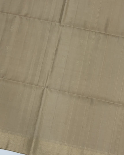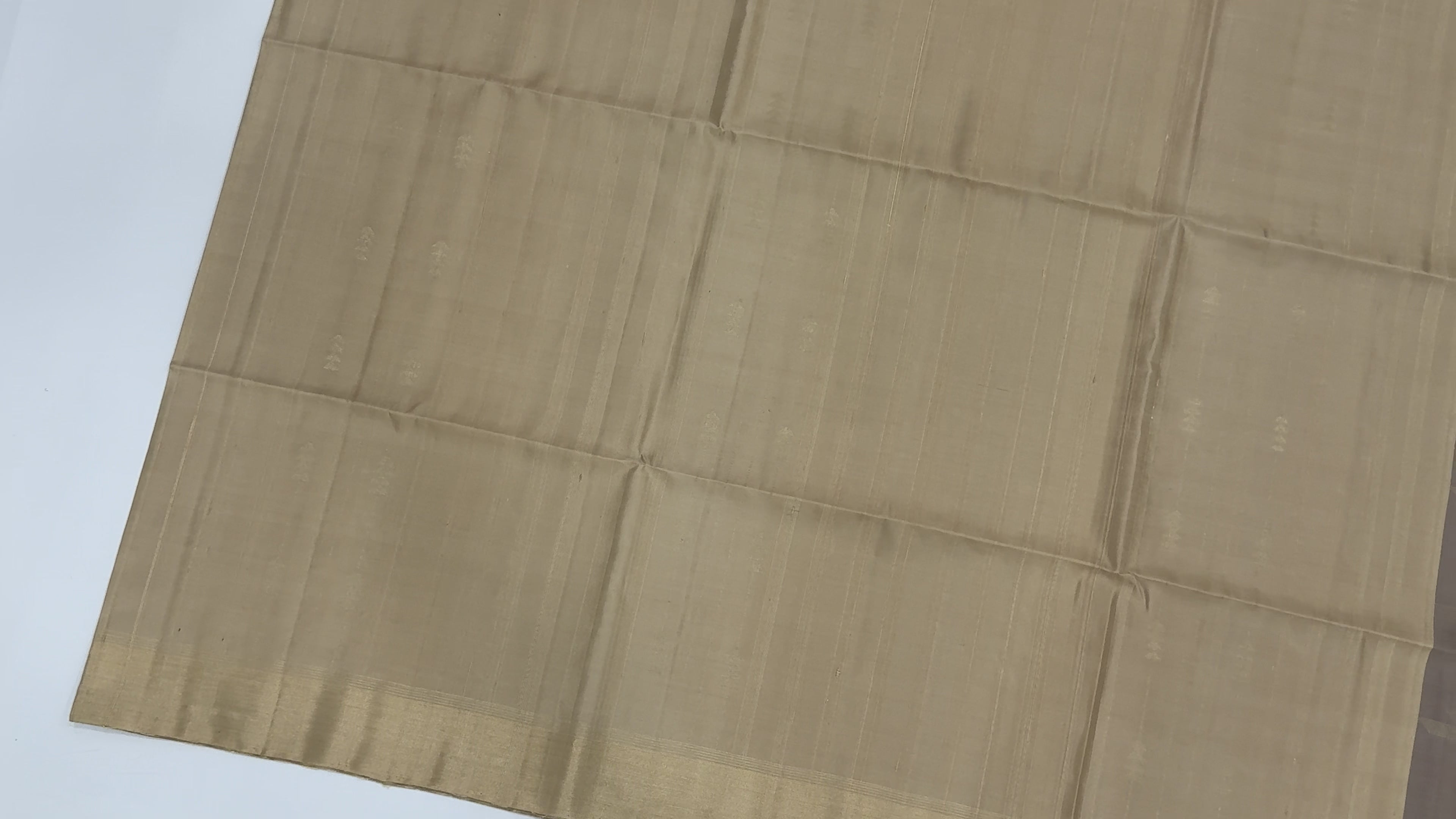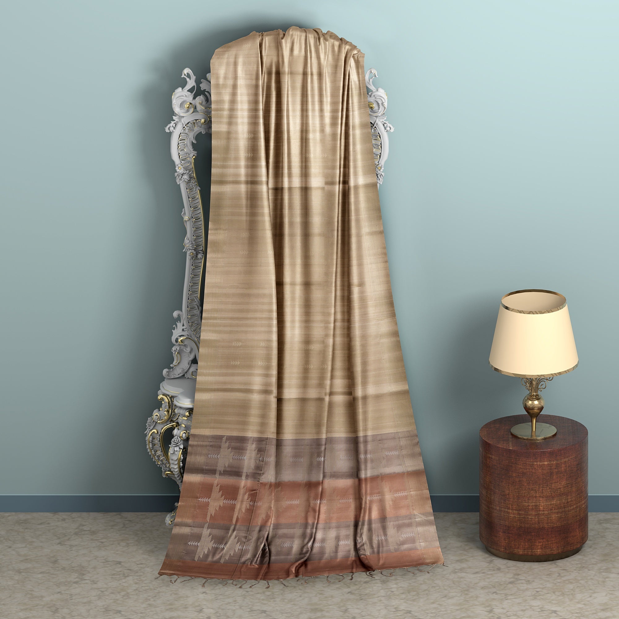 Evoking the gentle glow of dusk settling over temple stone carvings, this Champagne Beige Soft Silk Saree embodies quiet elegance. The body is woven in a calm beige tone with fine arrow-like motifs whispering through its silk surface, reminiscent of ancient mural brushstrokes. The pallu subtly shifts into rustic shades of bronze and terracotta, creating a palette as grounded as it is graceful. Crafted over 36 hours of dedicated hand weaving, every inch of this saree speaks of heritage, patience, and artisan skill. Drape this for weddings or evening rituals, and let tradition speak through modern grace. Shop online for timeless beauty in pure silk.