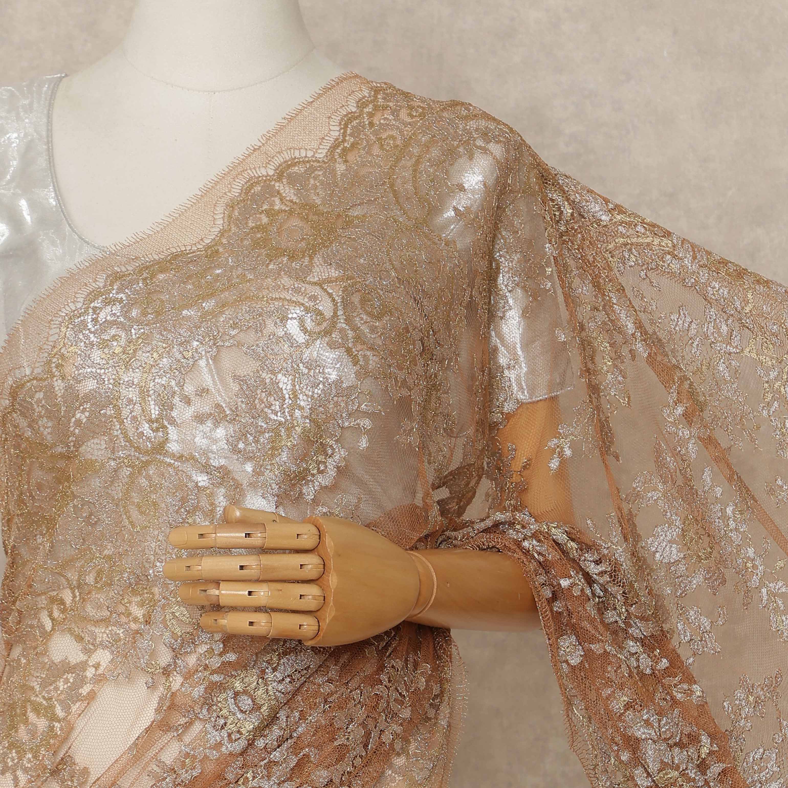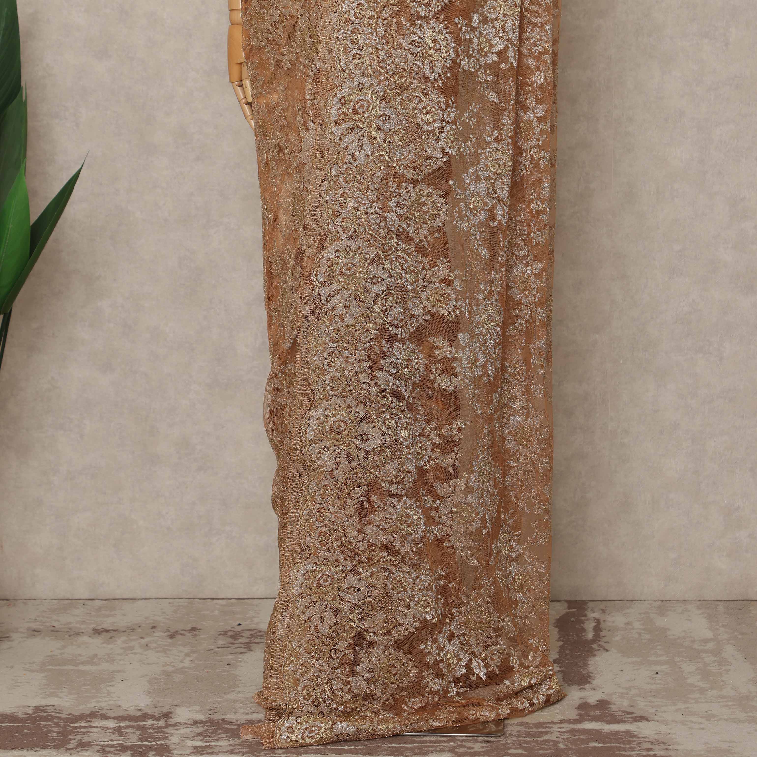 Champagne Copper Premium French Metallic Chantilly Saree Lace 5.5 Mtrs Length 110 Cms Width Designer Net Fabric Made In France, Blouse Not Included-D28127