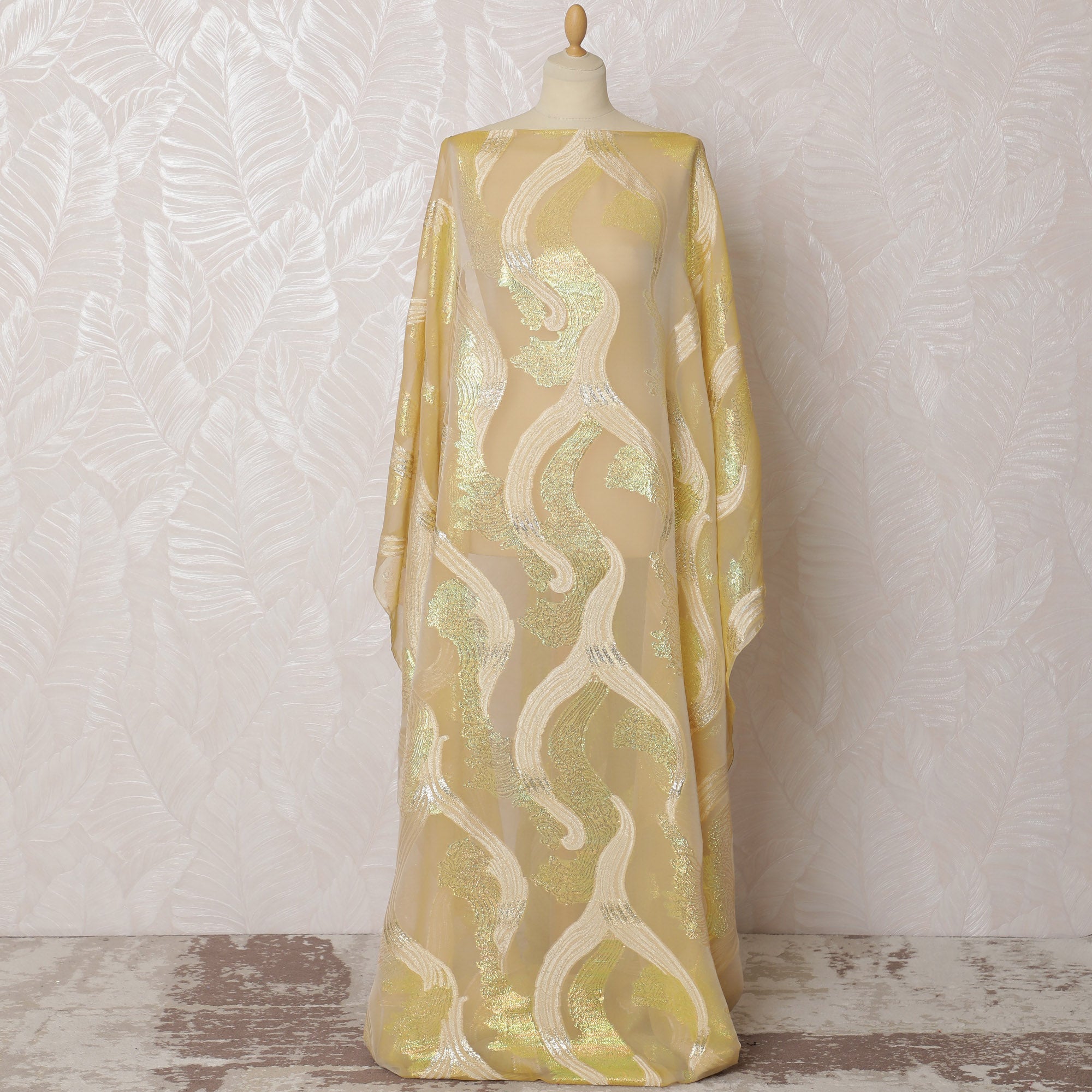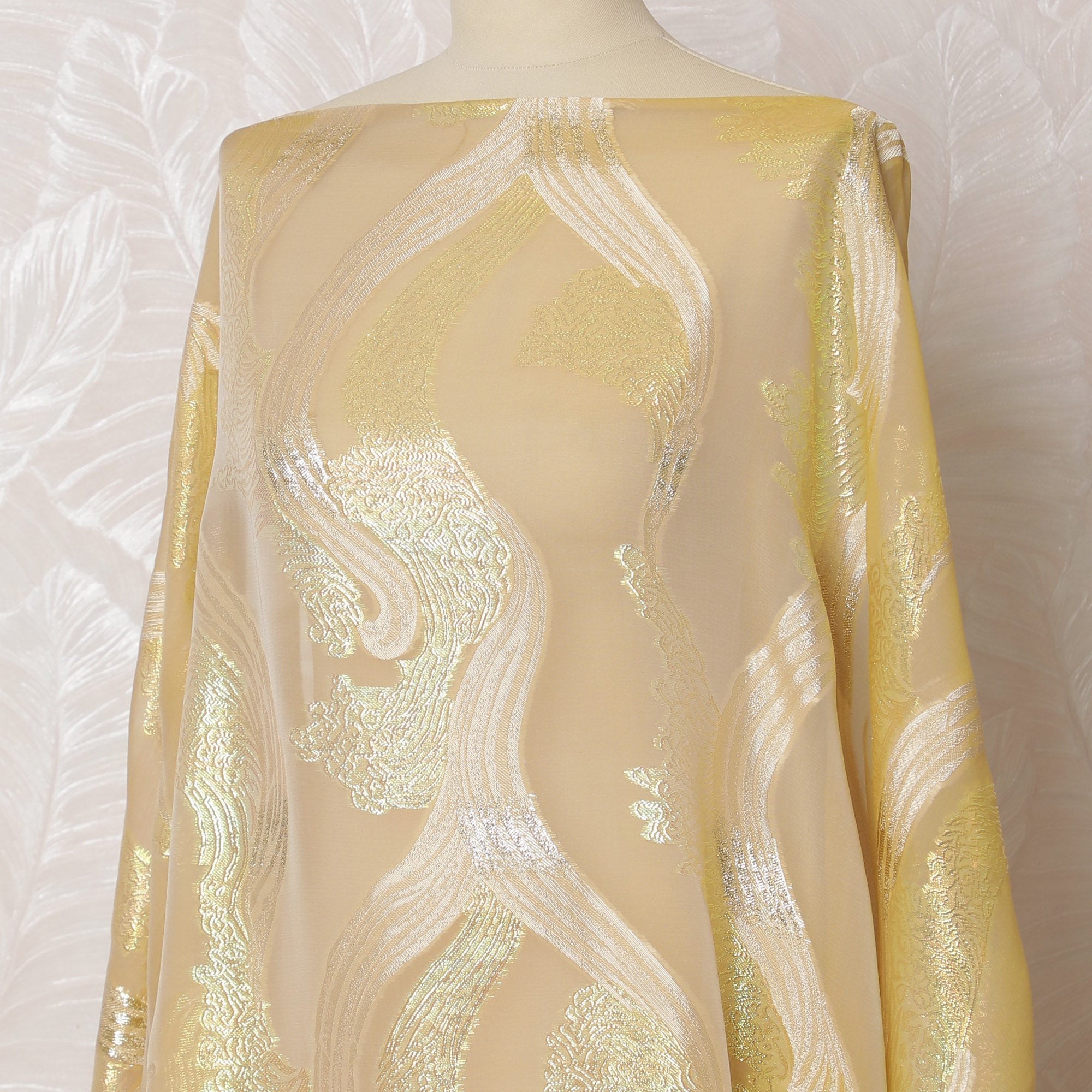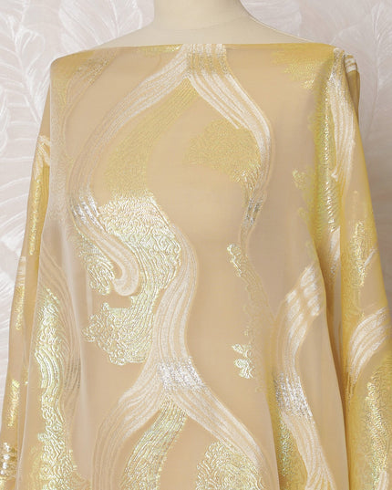 Revel in the opulent charm of our Champagne Gold French silk chiffon fabric, delicately woven with shimmering silver lurex patterns.... Read more Read more