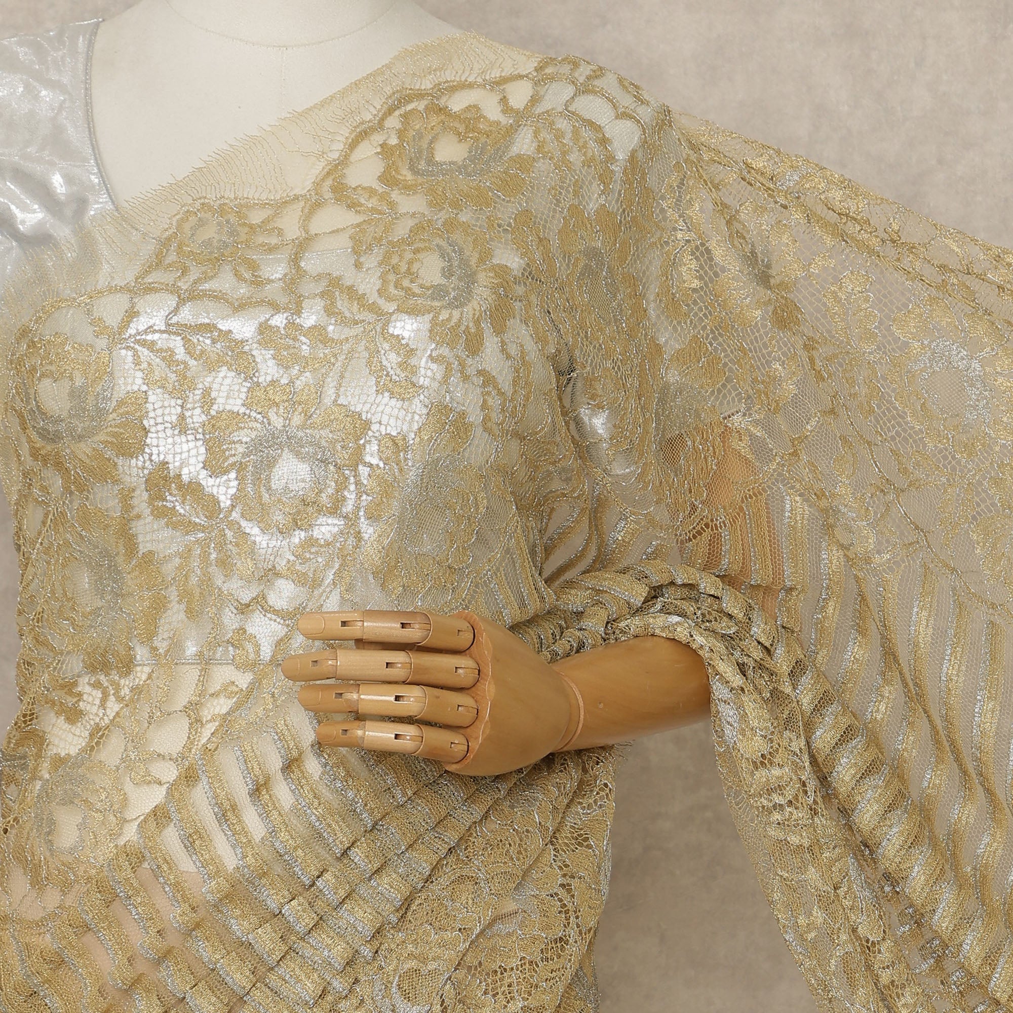 Elegant champagne gold metallic Chantilly lace saree fabric with intricate woven detailing.