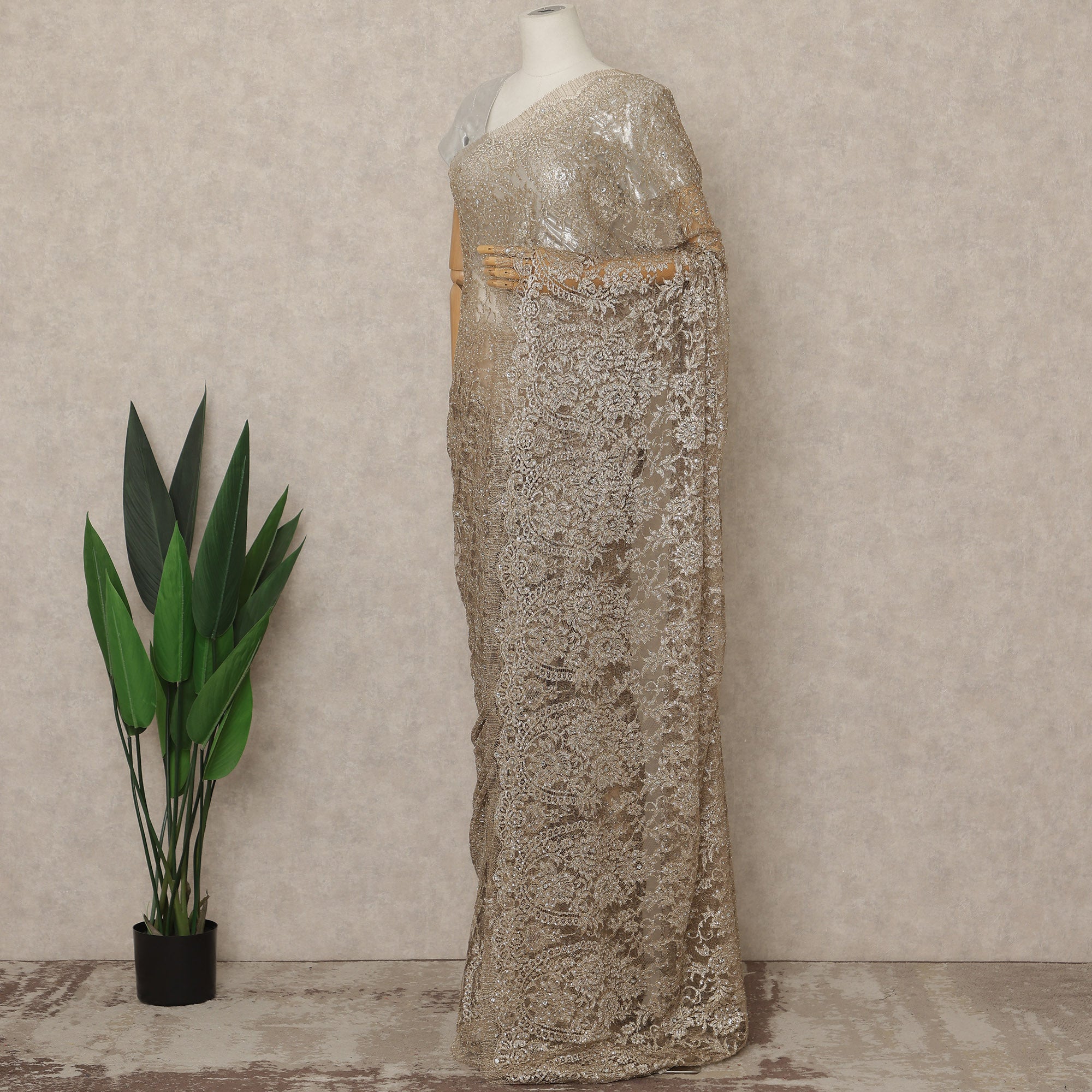 Premium champagne gold metallic Chantilly lace saree fabric with refined stone work.