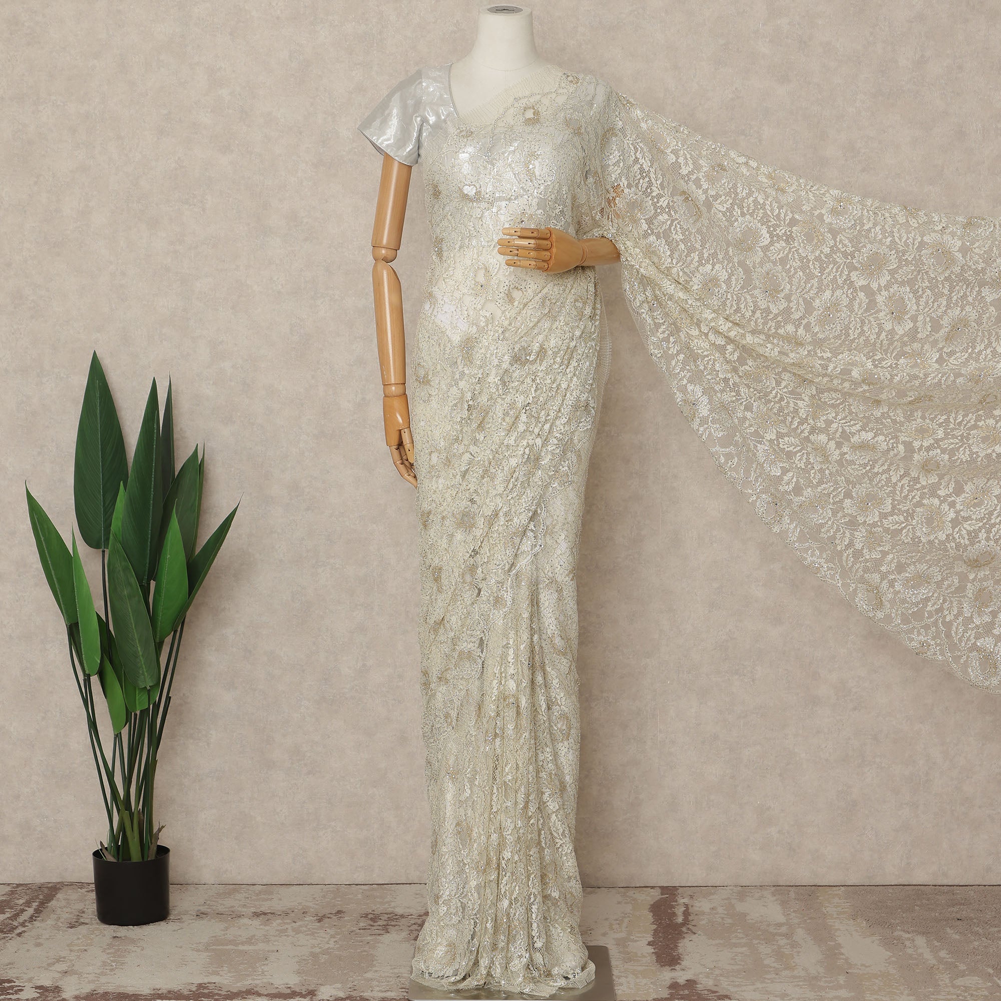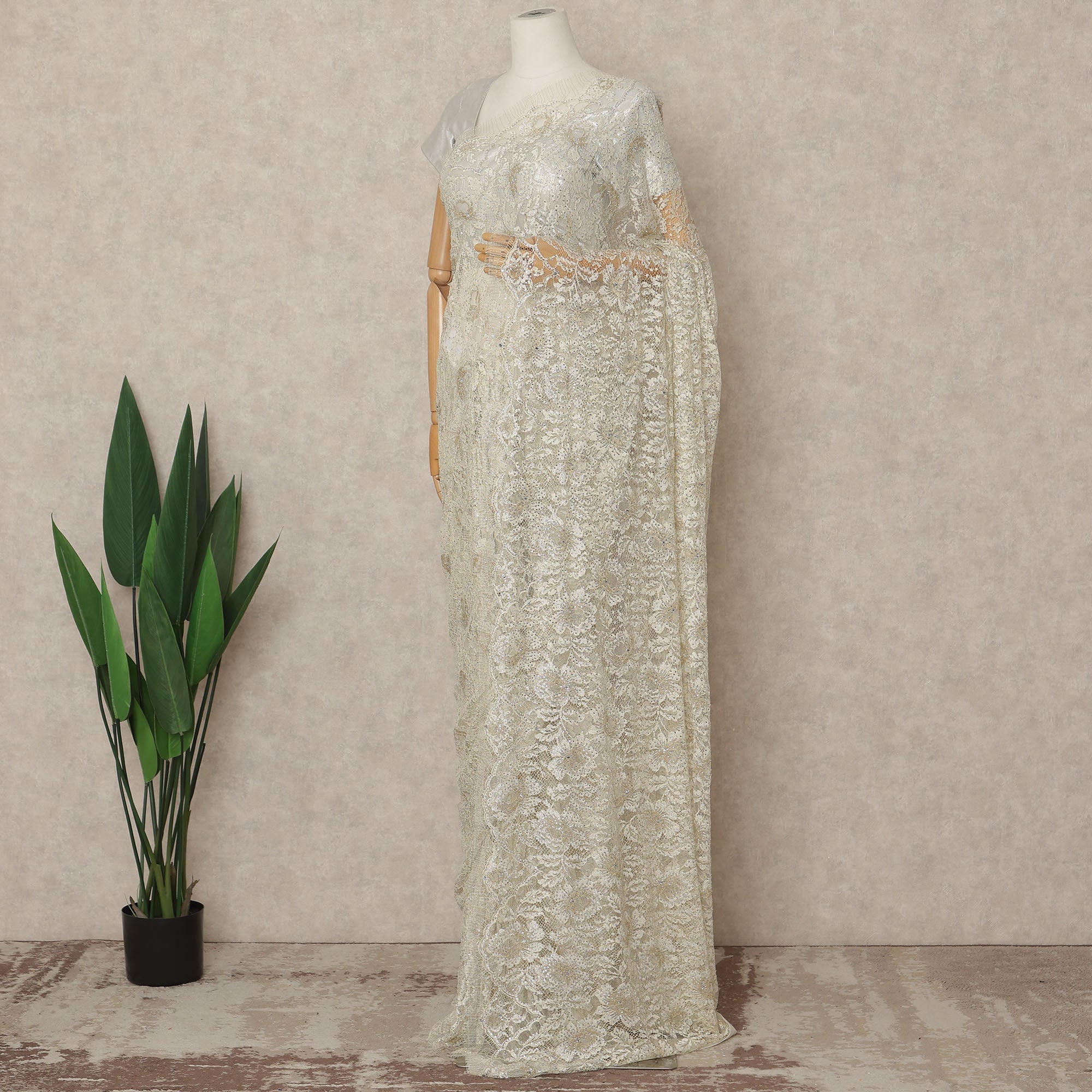 This champagne gold premium French metallic Chantilly saree lace with stonework is a refined statement of elegance and luxury. Crafted on a delicate sheer net base, it showcases intricate Chantilly floral patterns highlighted with metallic threadwork and finely embedded stones that create a soft, radiant shimmer. The sophisticated champagne gold tone offers a timeless appeal, making it perfect for bridal wear, receptions, festive celebrations, and grand evening occasions. Designed and crafted in France, this lace reflects superior artistry and premium quality. Measuring approximately 5.5 meters in length and 110 cms in width, it provides generous fabric for a graceful, flowing saree drape with exquisite detailing throughout. Blouse not included.