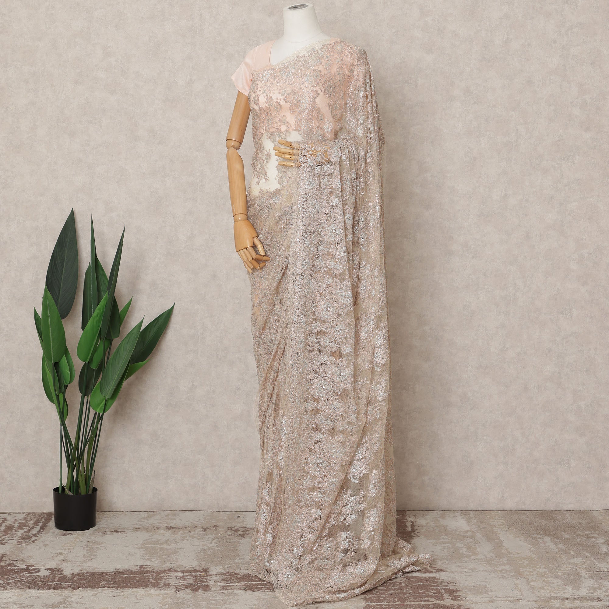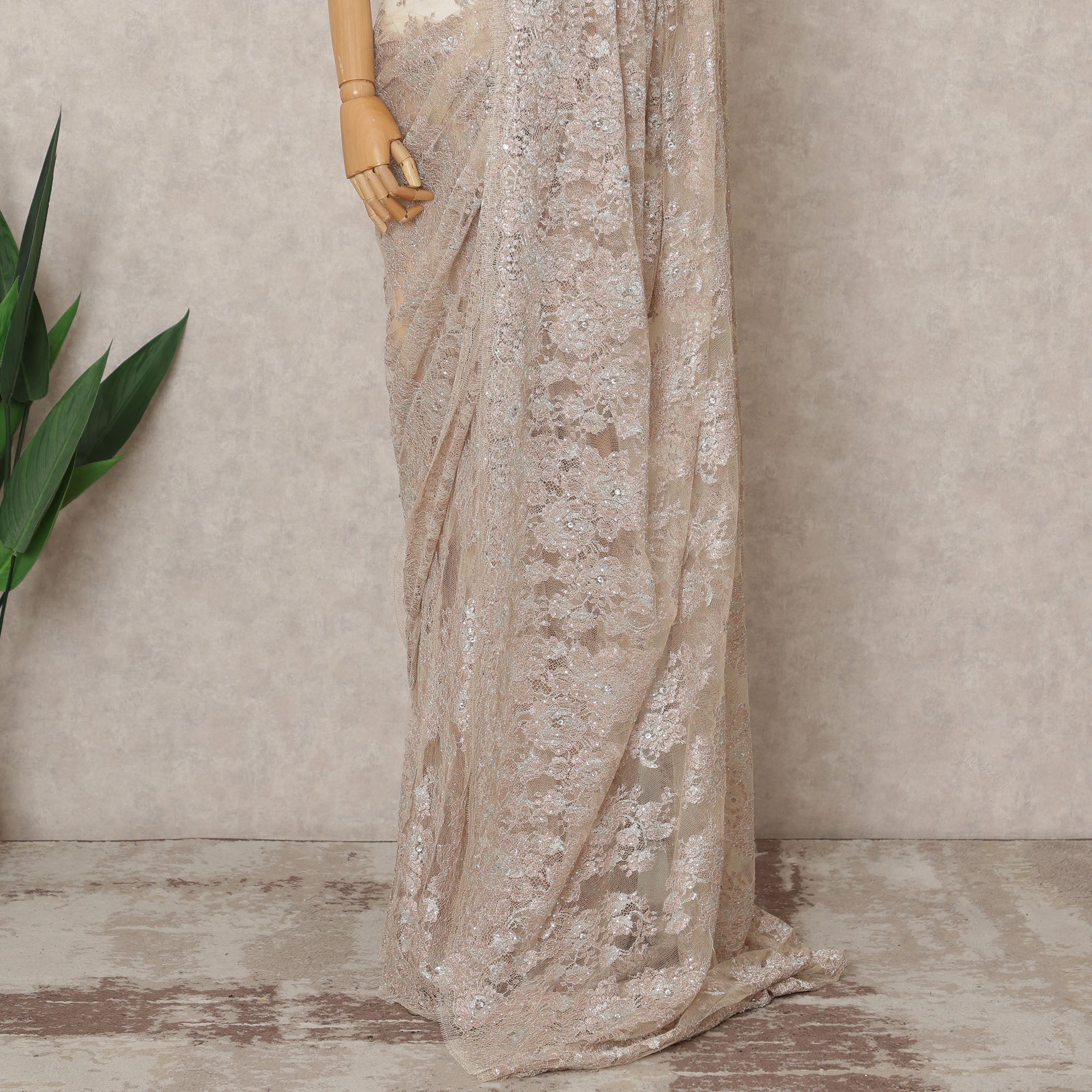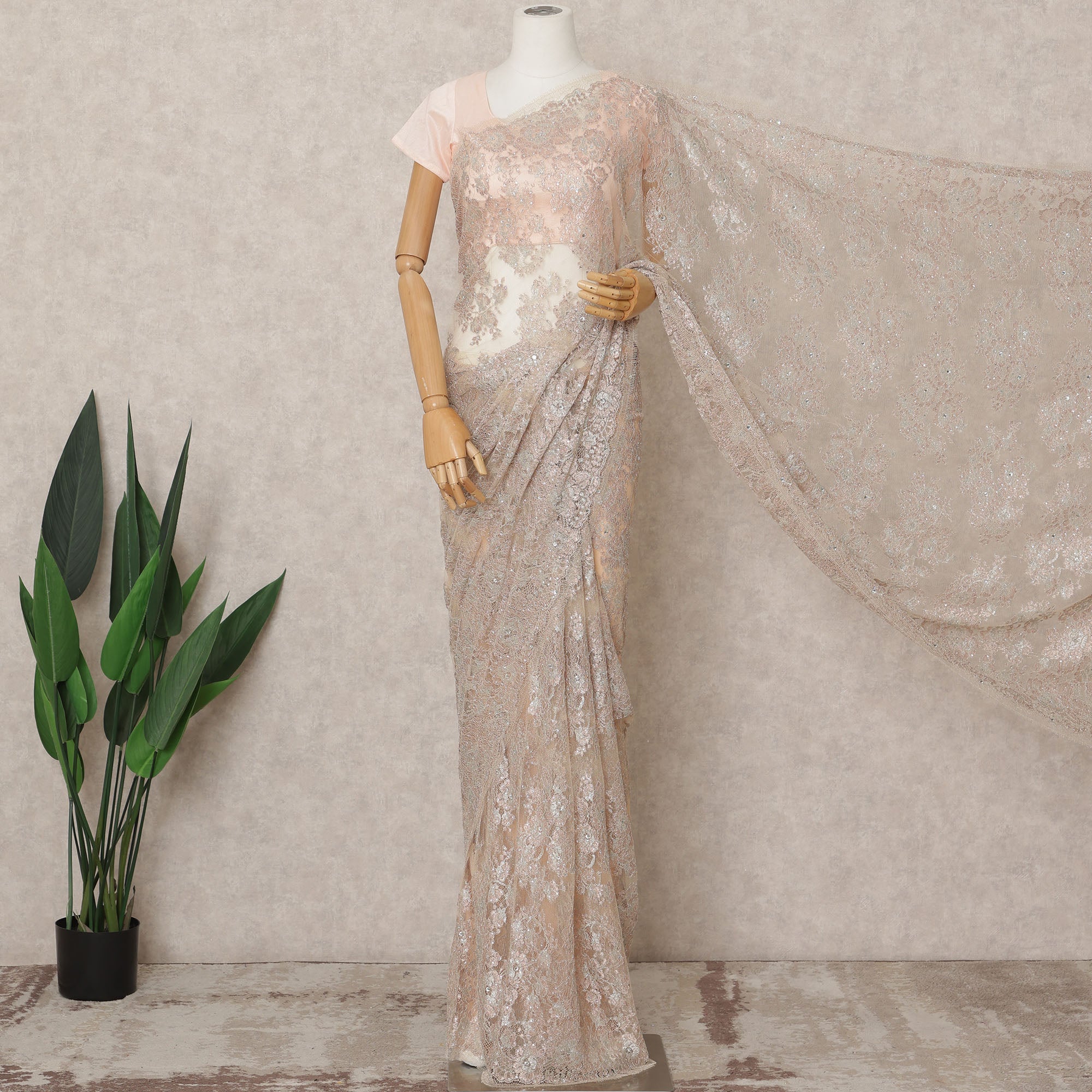 Champagne Gold Premium Metallic Chantilly Lace Saree with Stone Work, 5.5 Meters Length, 110 Cms Width, Made in France-D23866