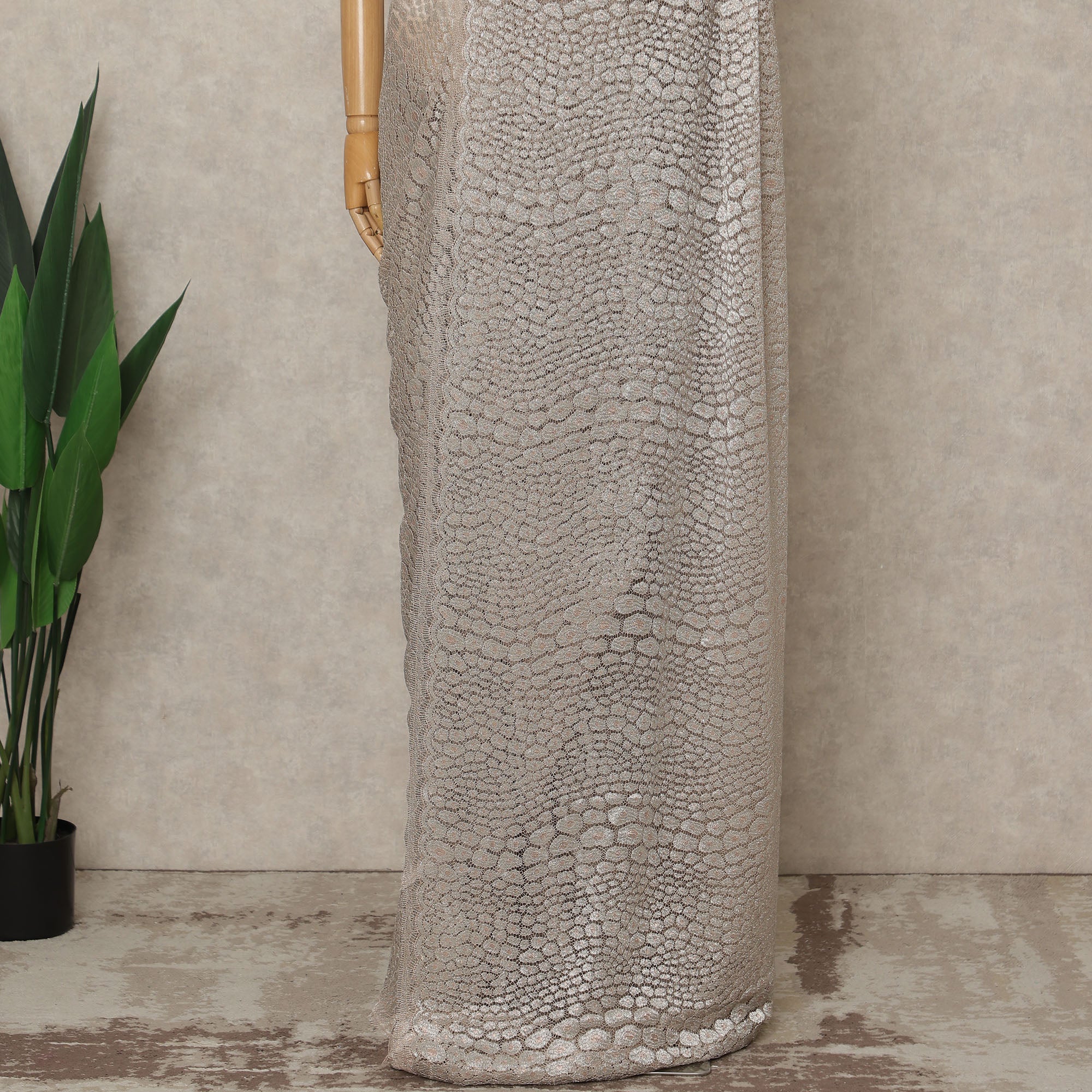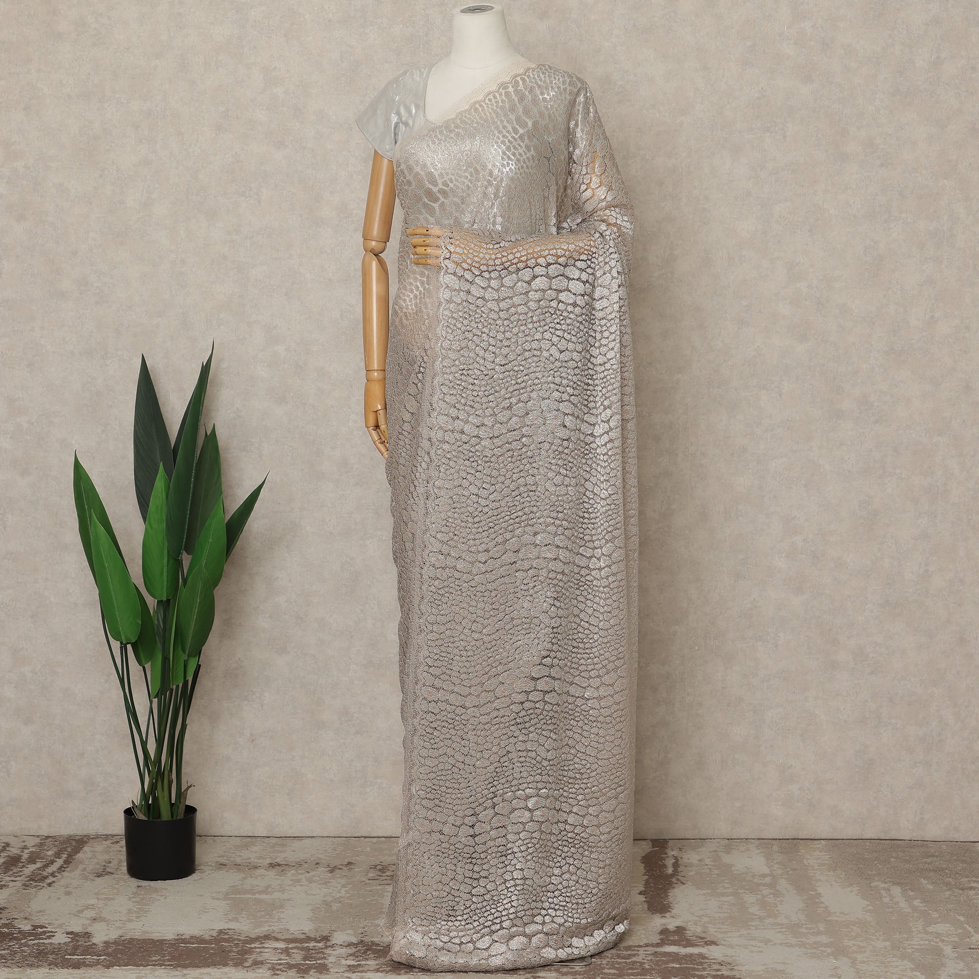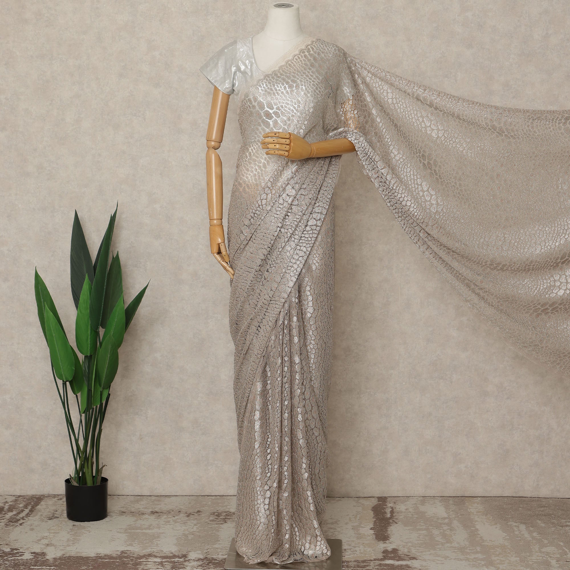 Elevate your wardrobe with the timeless sophistication of this Champagne Peach Premium French Metallic Chantilly Lace Saree, exquisitely crafted in France and admired for its shimmering metallic sheen and refined lace artistry; the soft champagne-gold tone beautifully enhances the intricate Chantilly pattern, giving the saree a luxurious radiance that makes it perfect for weddings, receptions, cocktail evenings, festive occasions, and grand celebrations; woven with superior Regal Fabrics craftsmanship, this saree drapes effortlessly with a feather-light fall, offering comfort and fluid movement while creating an ethereal silhouette; measuring 5.5 meters in length and 110 cms in width, it provides generous scope for versatile draping styles, and with the blouse not included, you have complete creative freedom to pair it with contrasting or complementing fabrics to customize your ensemble; ideal for those who love to shop online for exclusive luxury sarees, this masterpiece represents the finesse of authentic French lace paired with modern metallic glamour; for best maintenance, dry clean only and store safely to preserve its lustrous shine, delicate texture, and intricate detailing.