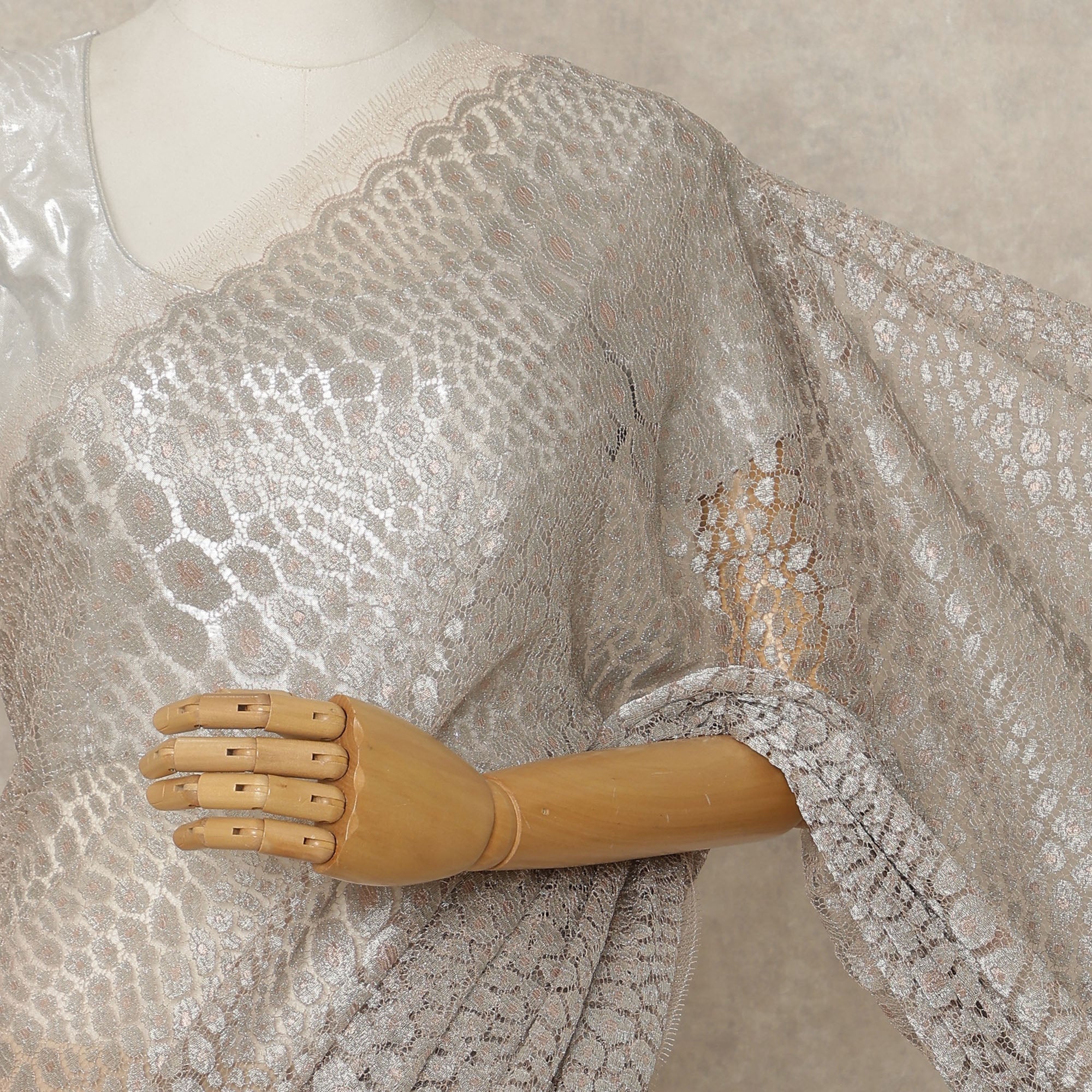 Champagne Peach Premium French Metallic Chantilly Lace Saree, 5.5 Mtrs Length, 110 Cms Width, Crafted in France-Blouse Not Included-D26686