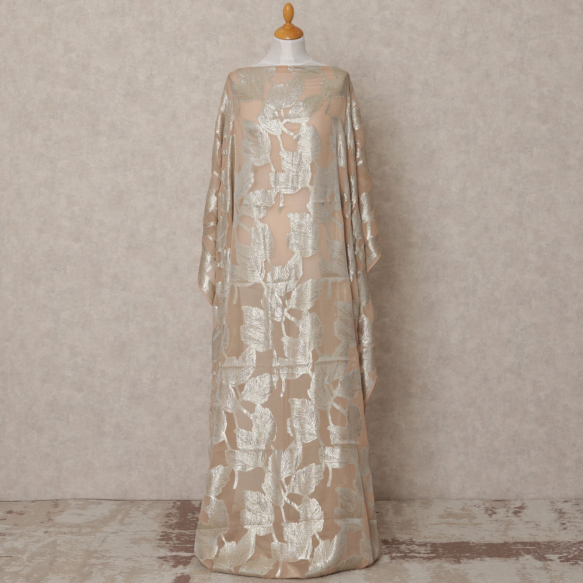 Champagne Peach Somali Chiffon Dirac with Silver Metallic Leaf Lurex Design, 3.5 Mtrs, Width 140 Cms, Made in South Korea-D24031