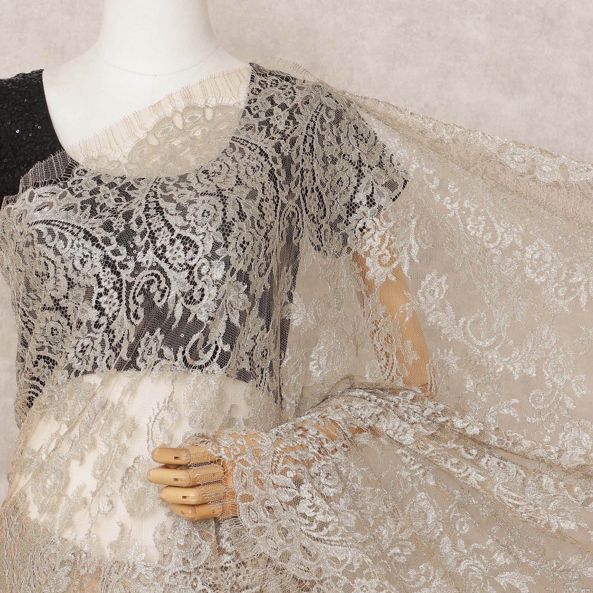 Champagne Premium French Metallic Chantilly Saree Lace Fabric, Approx. 5.5 Mtrs, Width 110 Cms, Made in France-D24078