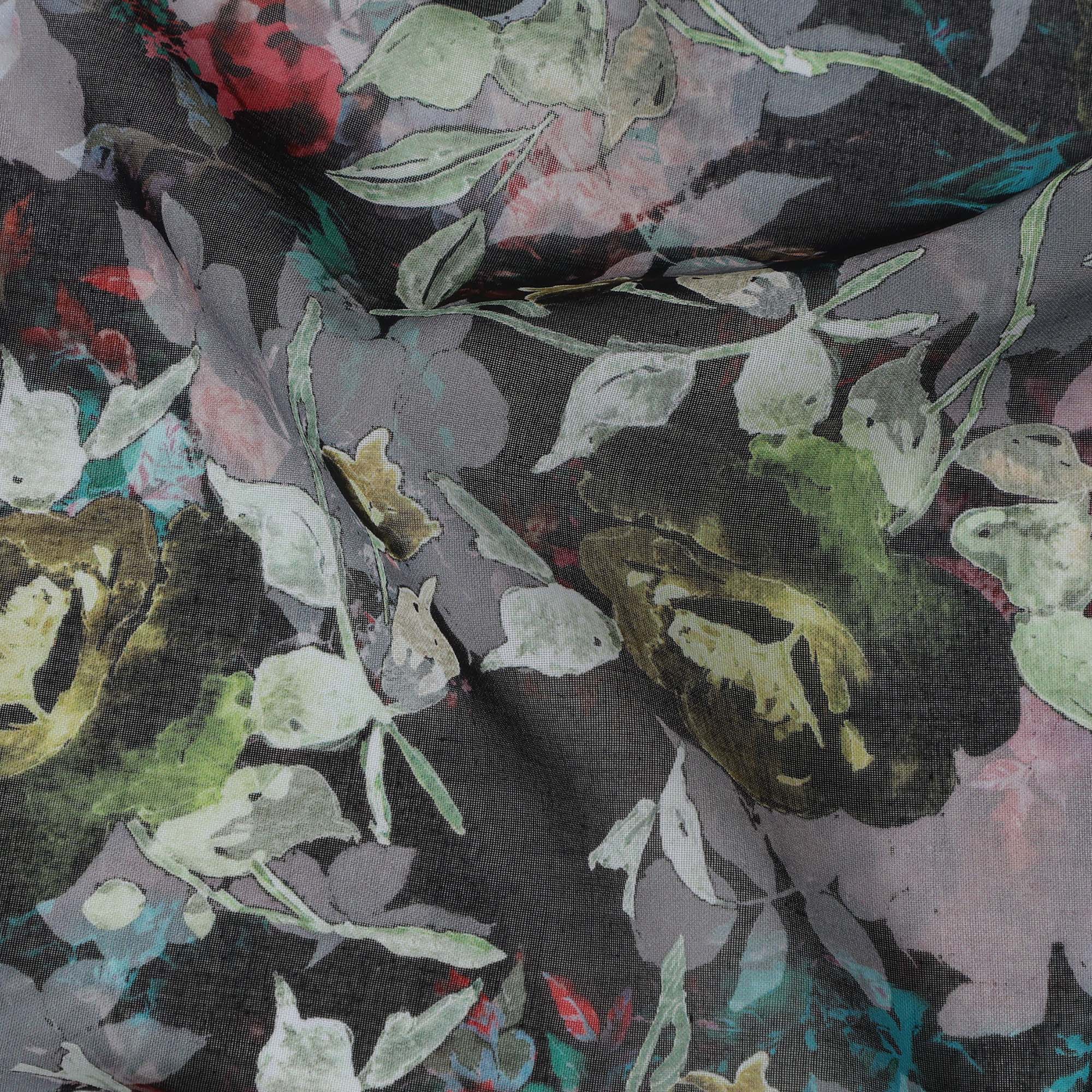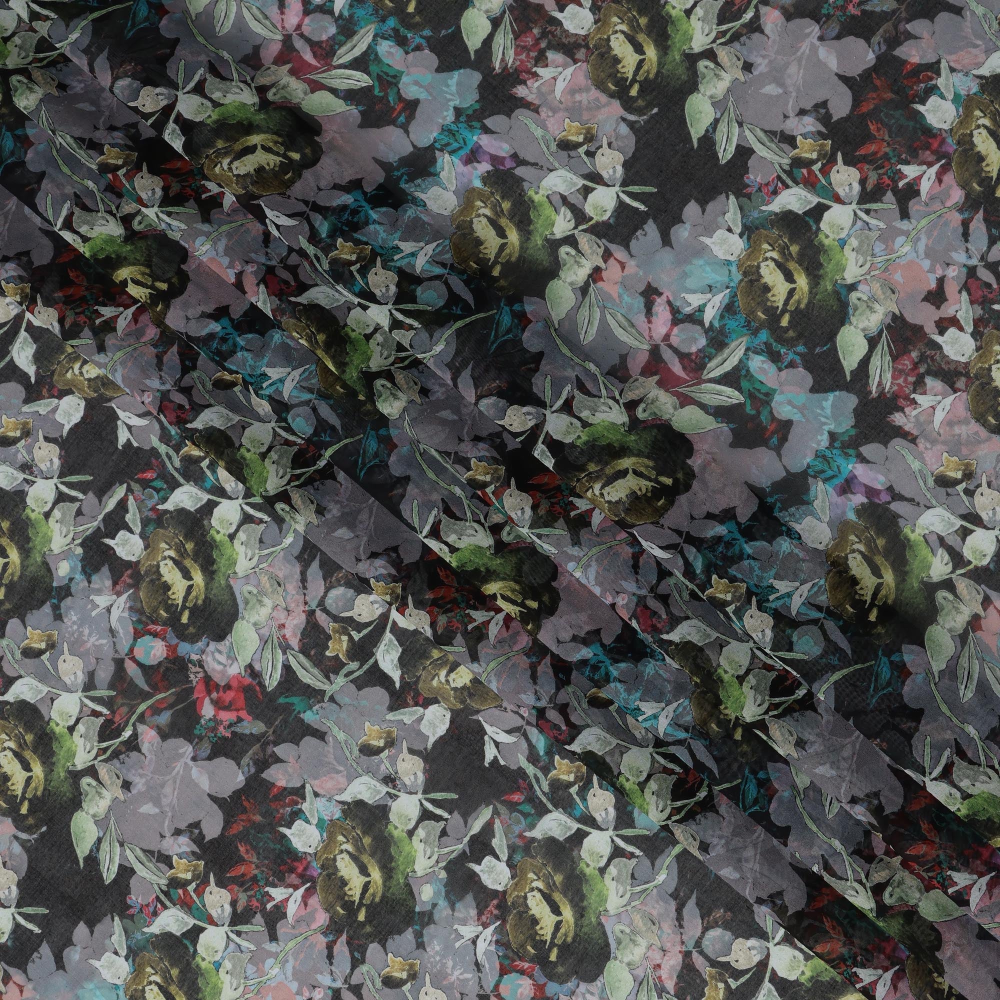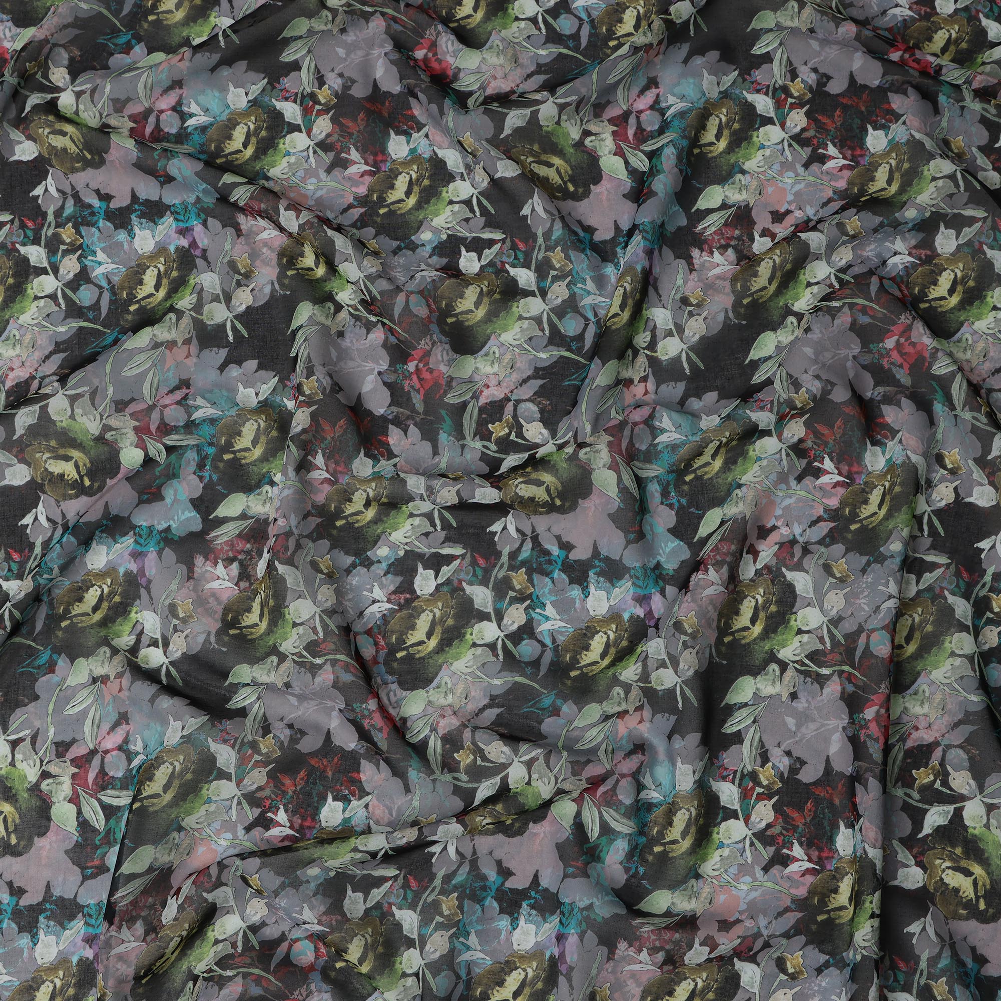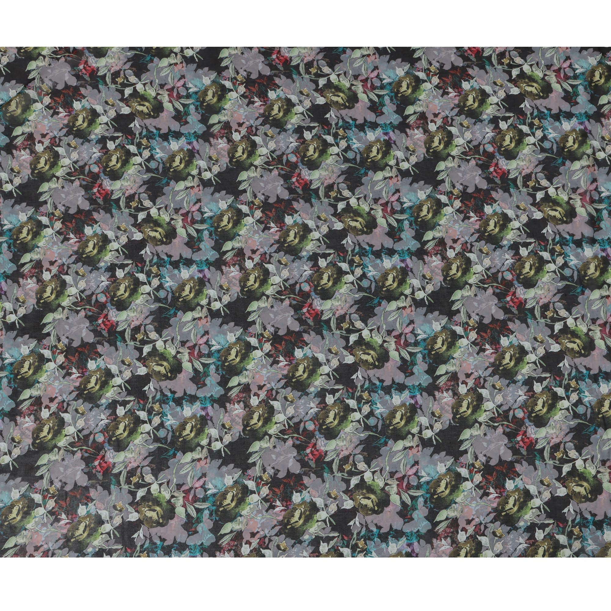 Charcoal black base enriched with floral prints in olive, lavender, and teal.