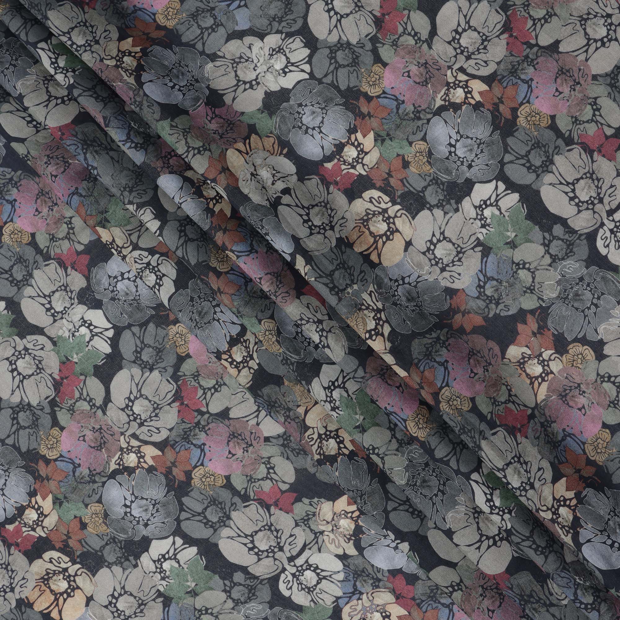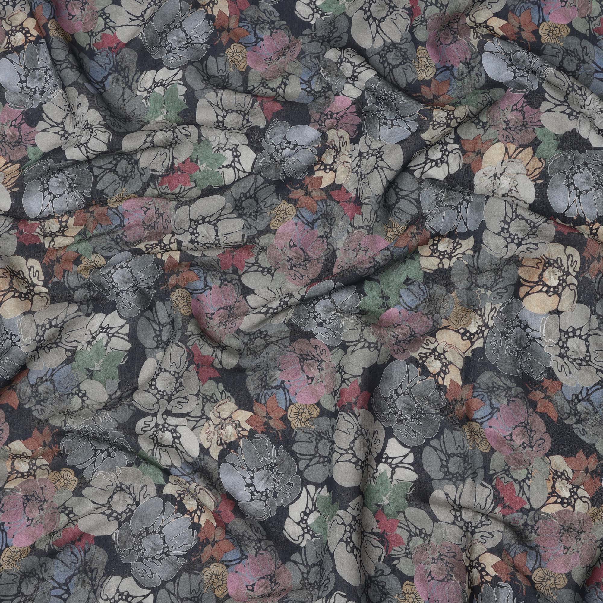 Charcoal Black Multicolor Floral Sketch Printed Viscose Crepe Fabric, Width 110 Cms, Made in India-D23916
