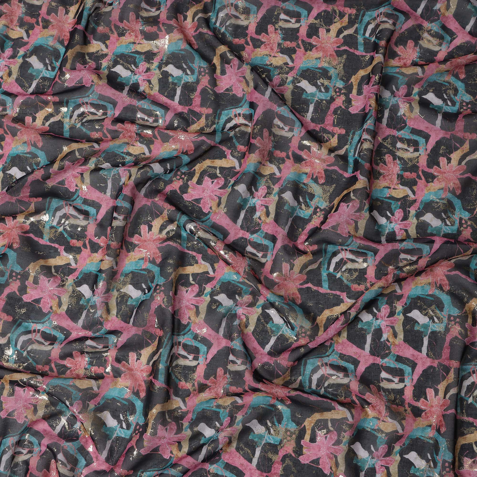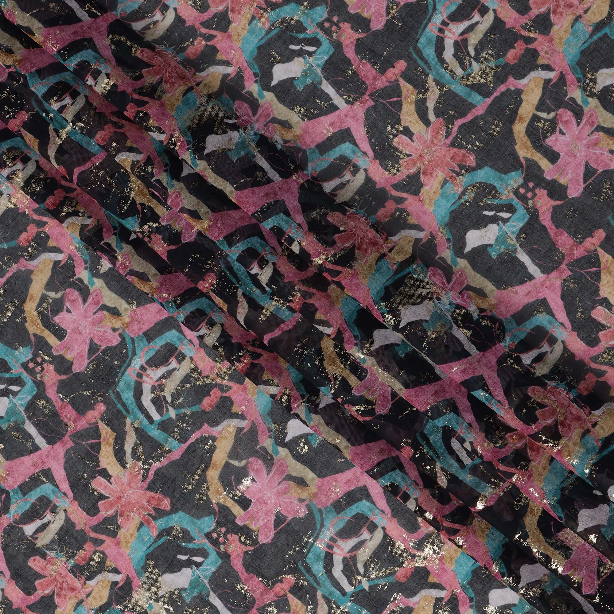 Charcoal Black with Pink and Teal Abstract Floral Traditional Sudanese Thobe in Pure Cotton Voile Fabric, 4.5 Meters Length, Width 140 cm – Made in India-D23148