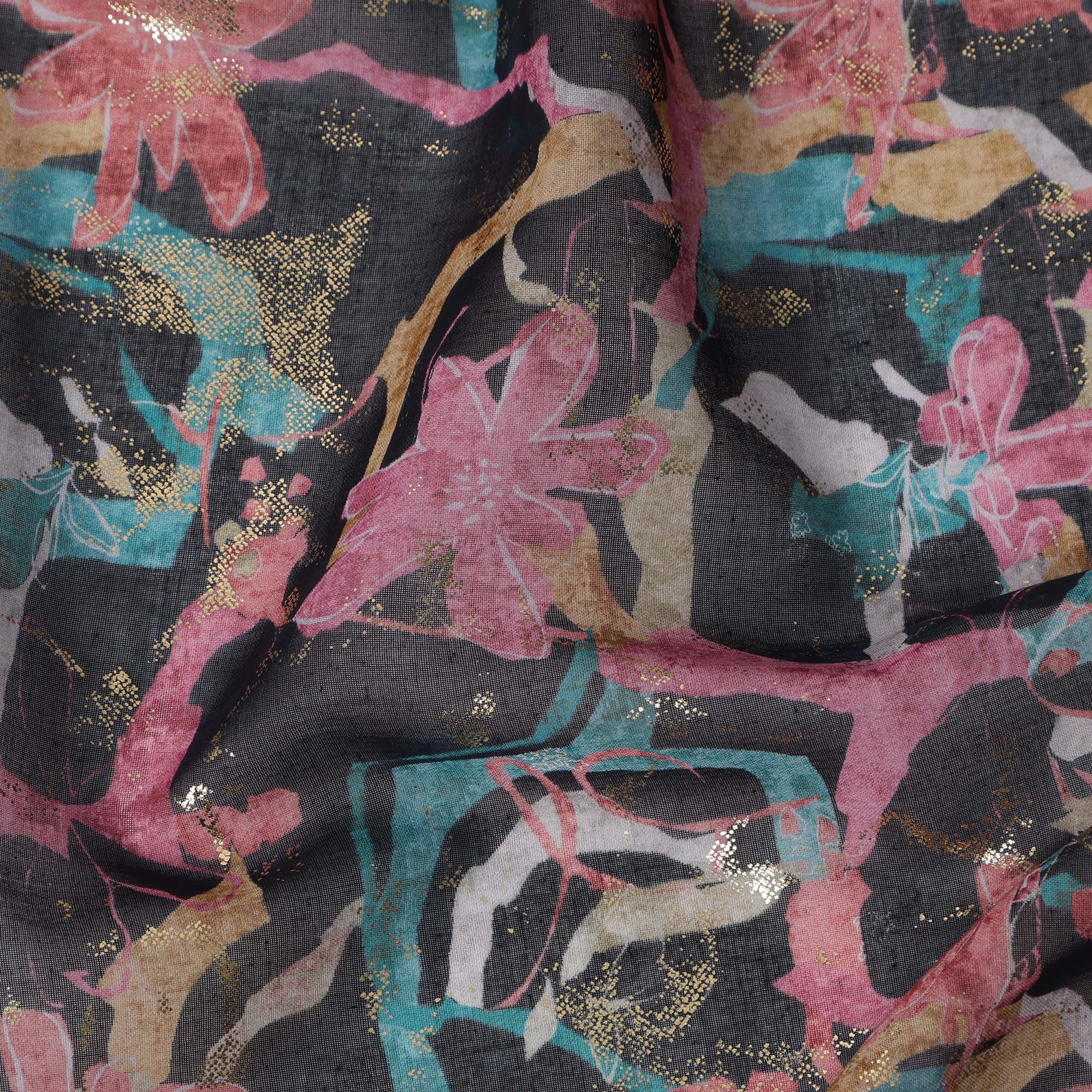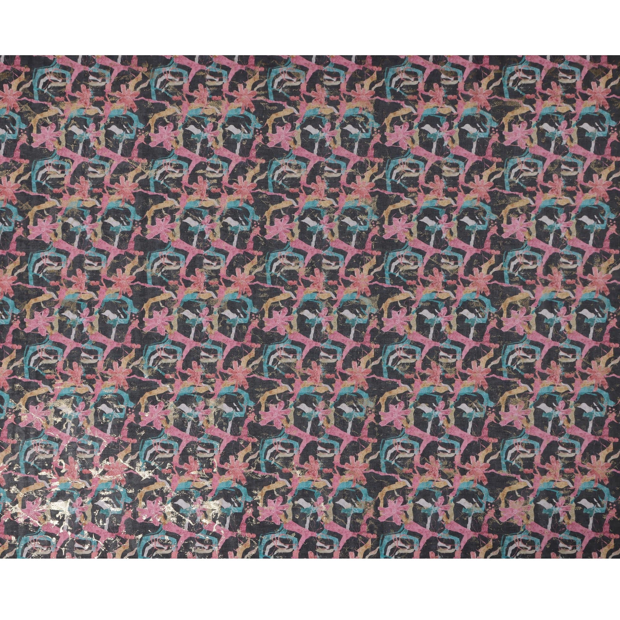 Charcoal black base accented with pink, teal, beige, and gold abstract floral motifs.