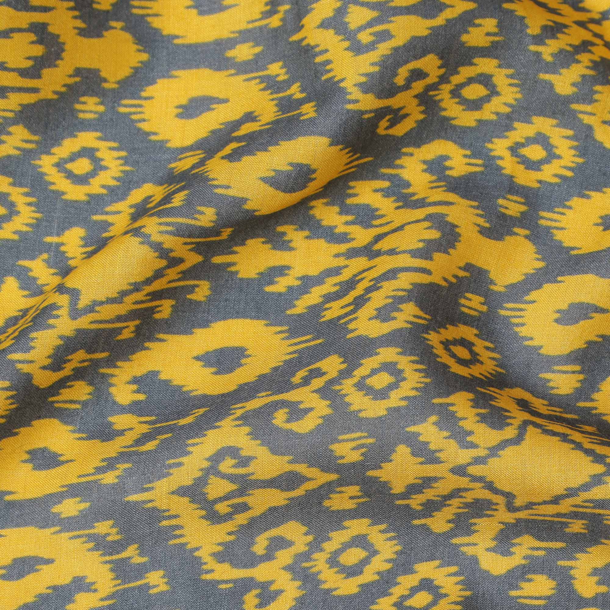 Bring a vibrant ethnic flair to your wardrobe with this charcoal grey and mustard yellow ikat-inspired geometric print cotton lawn fabric, a stunning blend of traditional artistry and modern fabric technology. The rich mustard yellow motifs intricately arranged over a charcoal grey backdrop create a high-contrast and visually arresting pattern that is ideal for ethnic fusion garments. Crafted from ultra-lightweight cotton lawn, this fabric offers an airy, breathable texture with a soft hand feel, making it perfect for crafting everyday kurtas, indo-western dresses, blouses, or stylish dupattas. The 110 cms width offers ample flexibility for versatile stitching needs, while the digital printing ensures precision in design. Proudly made in India, it merges the heritage essence of ikat art with the finesse of contemporary cotton processing for a fabric that's both visually dynamic and supremely comfortable.