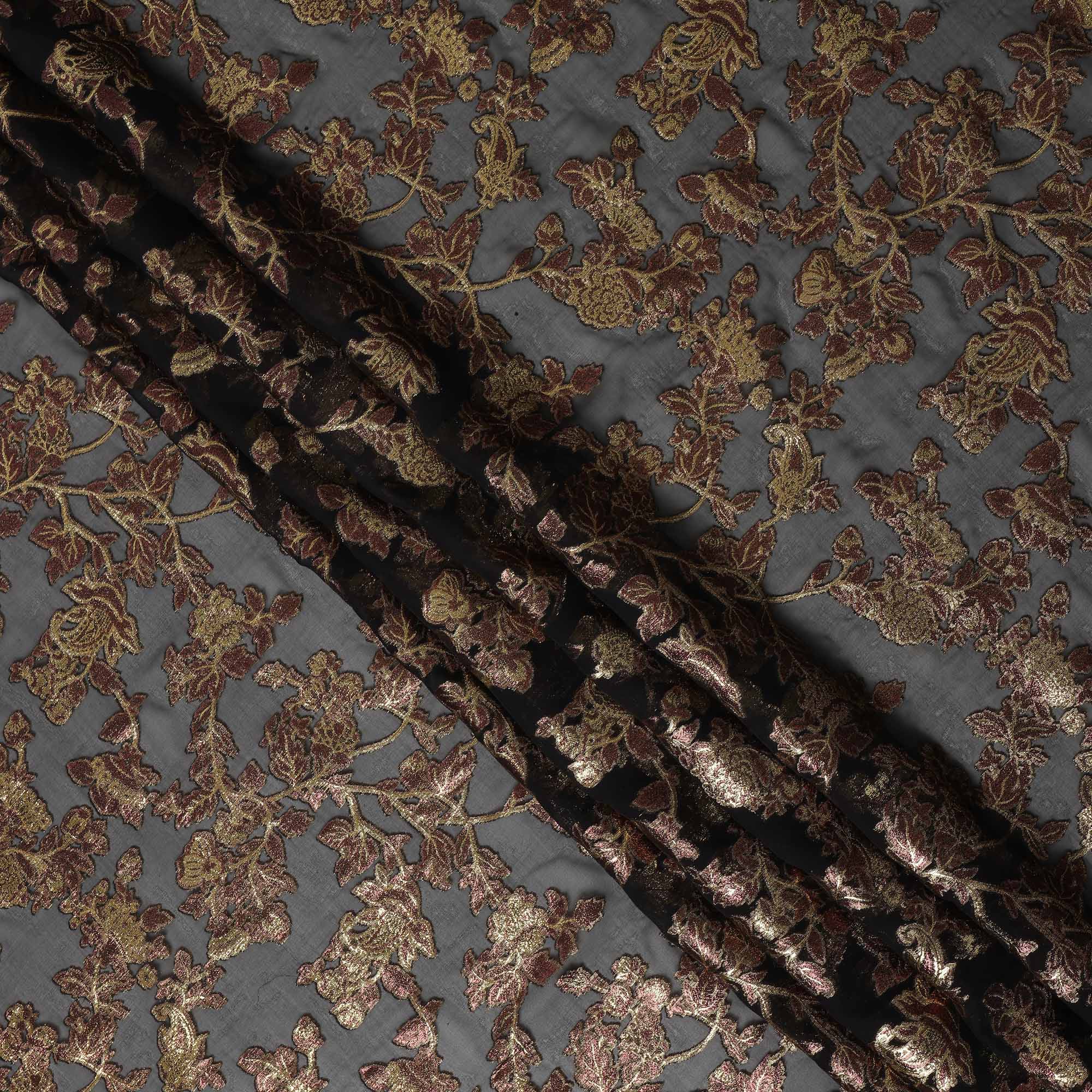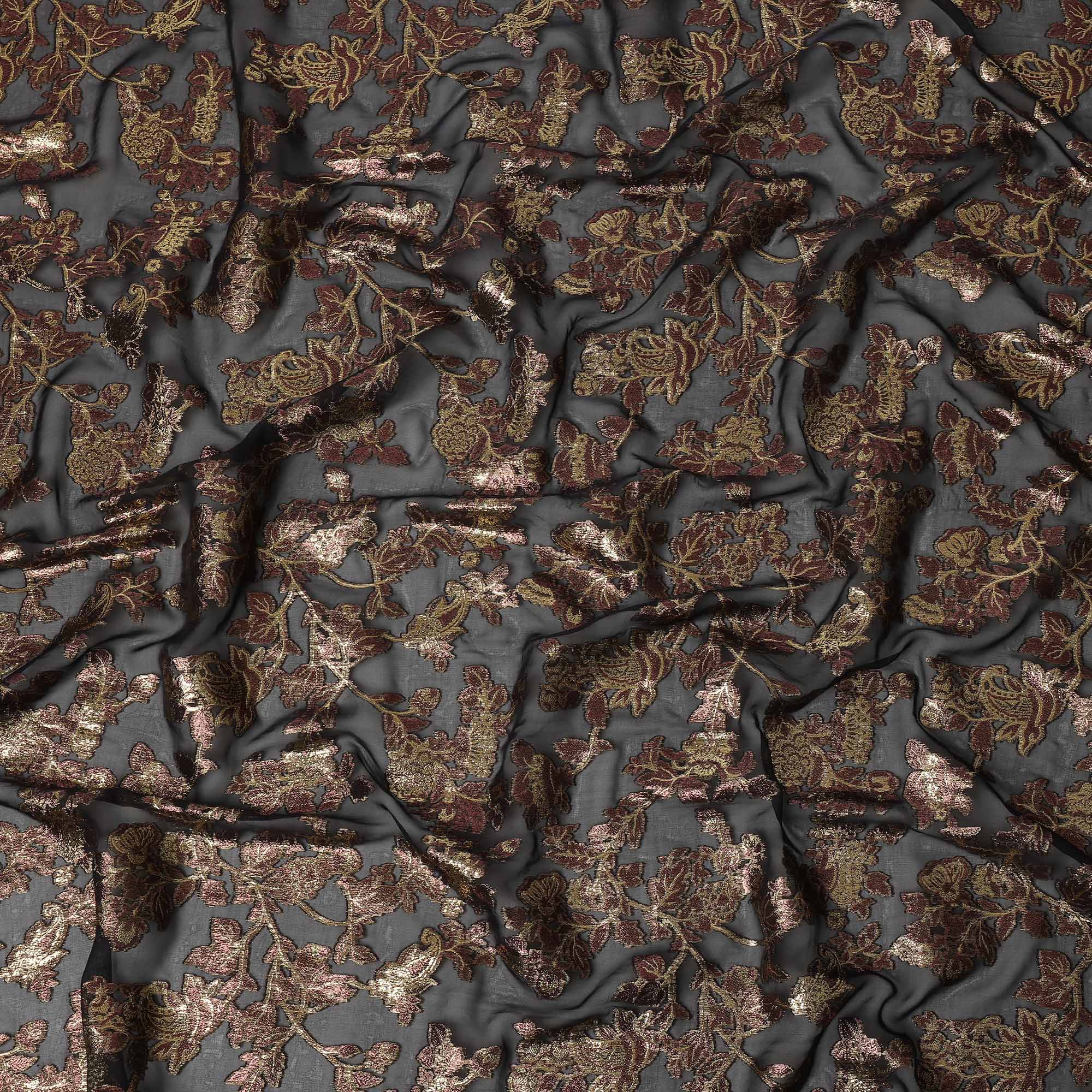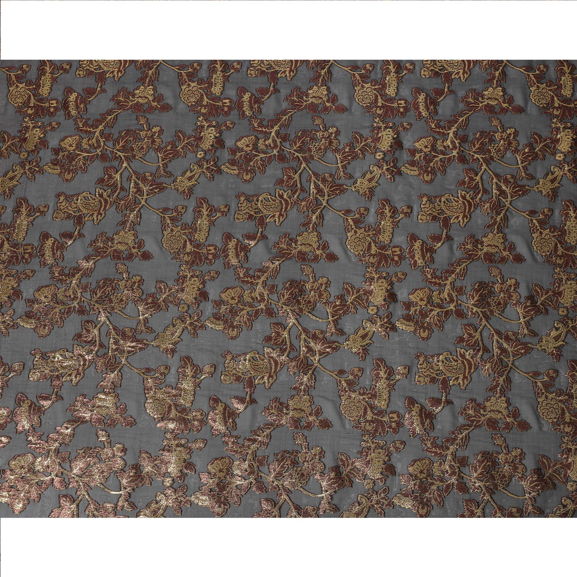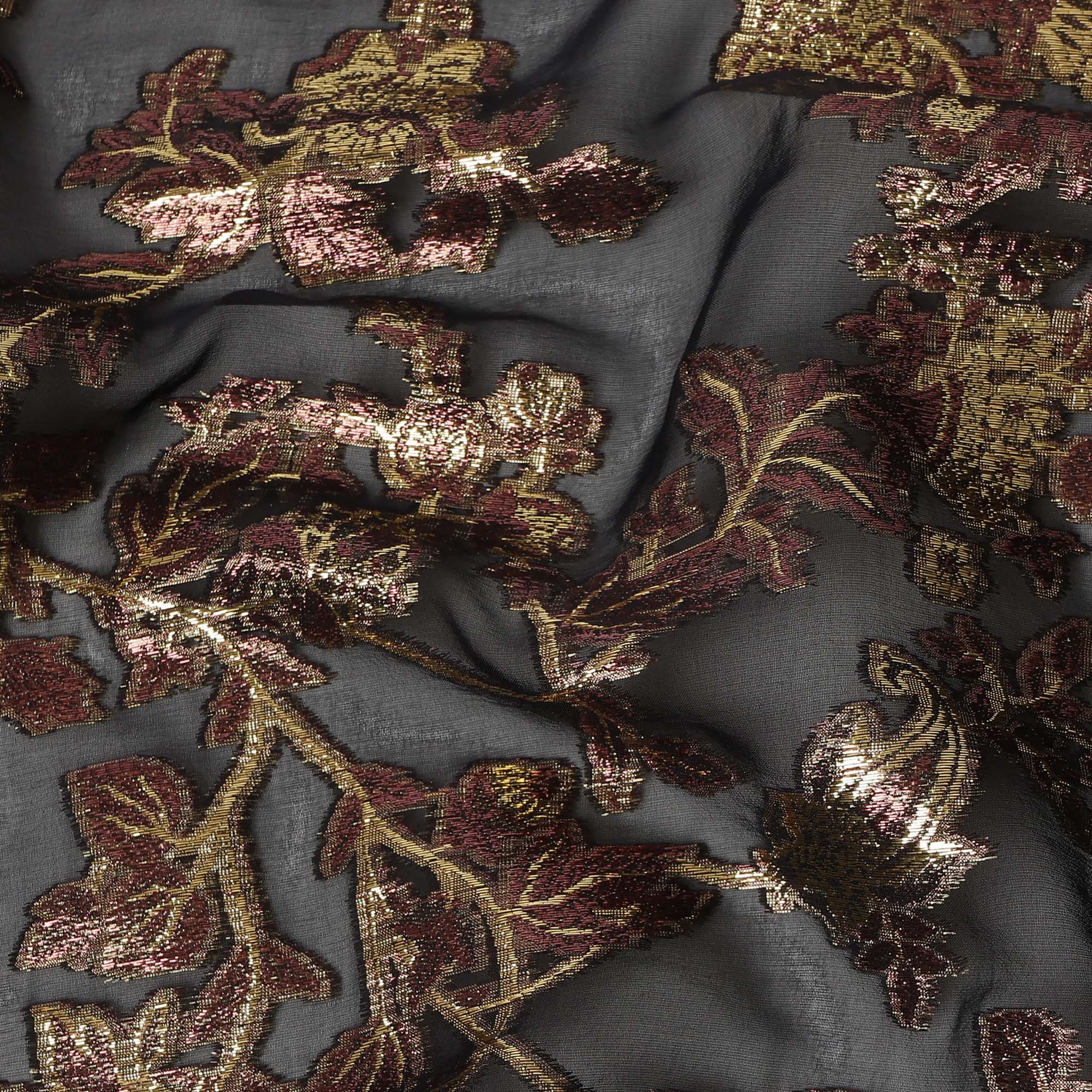 Elegant charcoal grey silk chiffon fabric with metallic floral lurex detailing