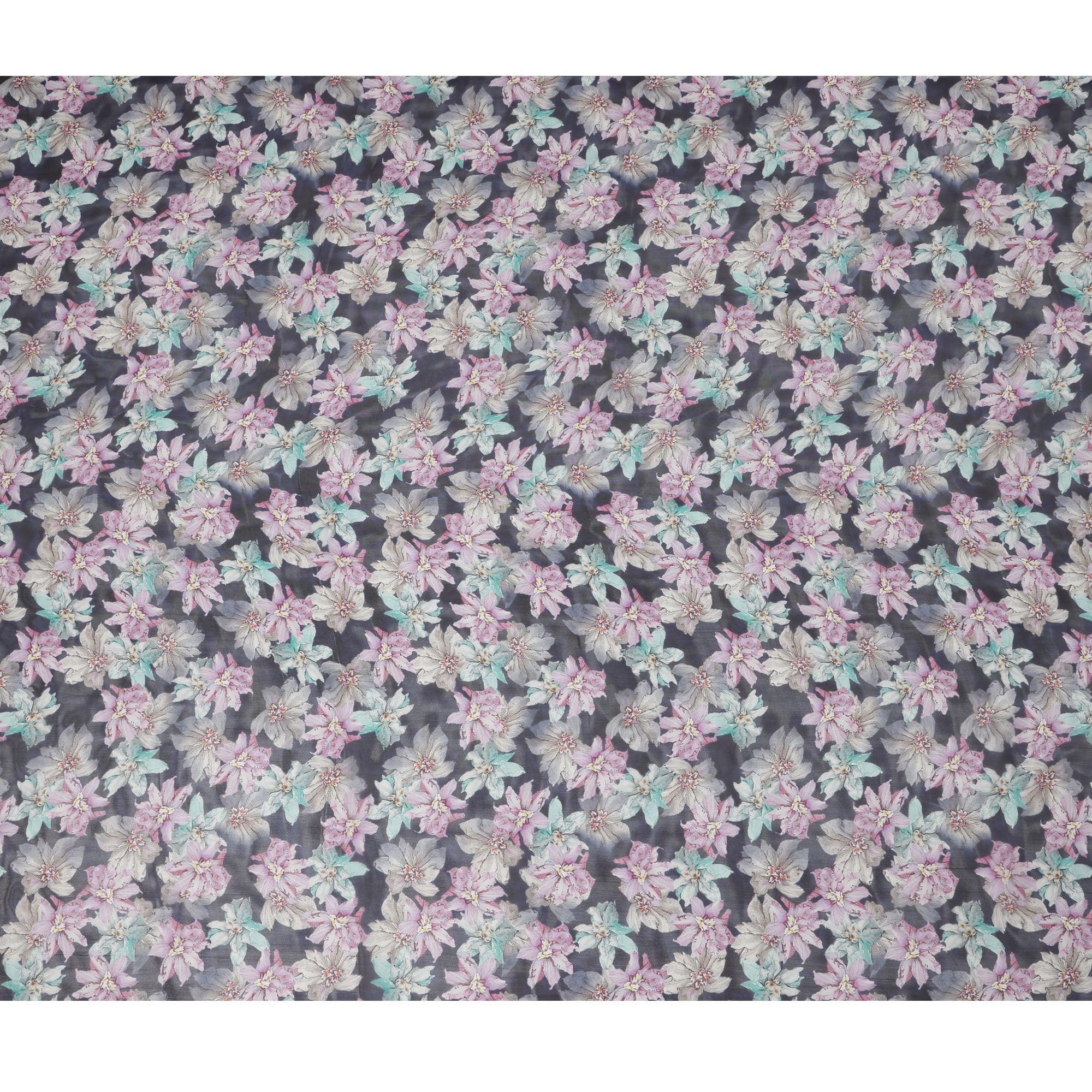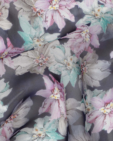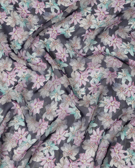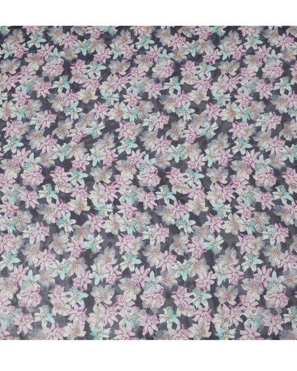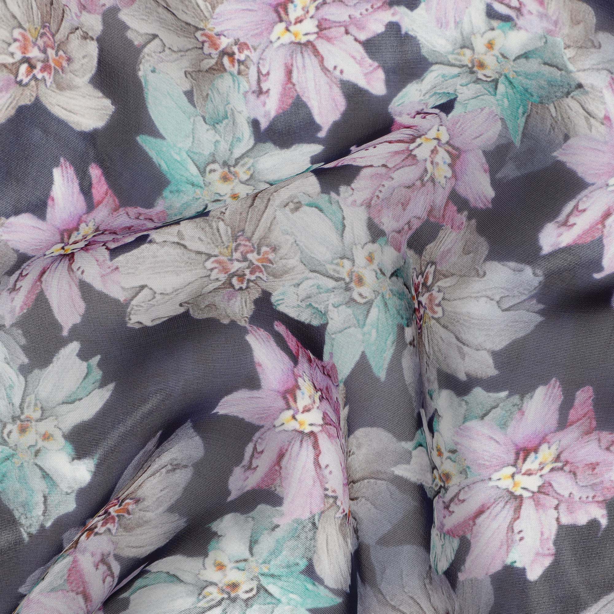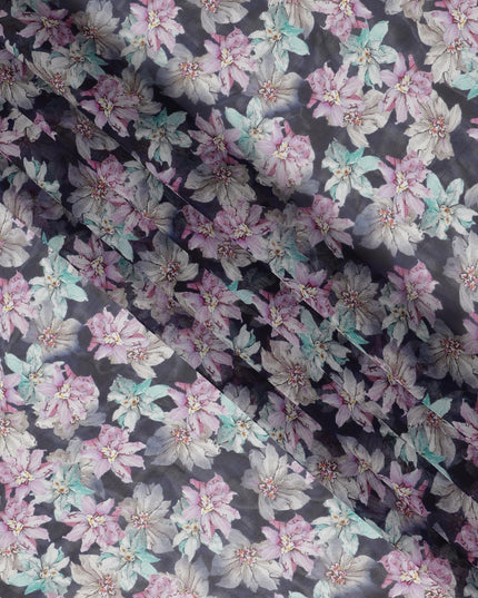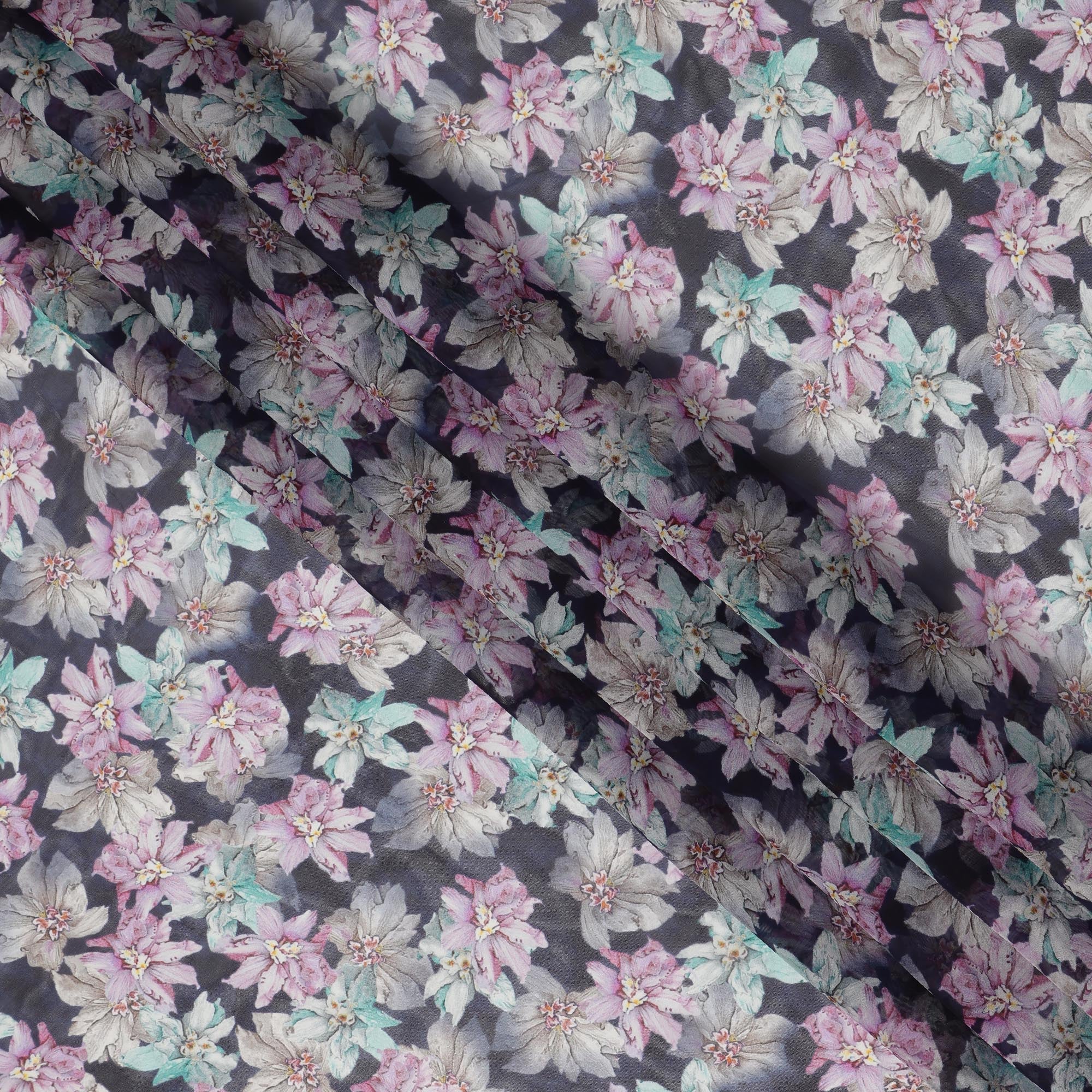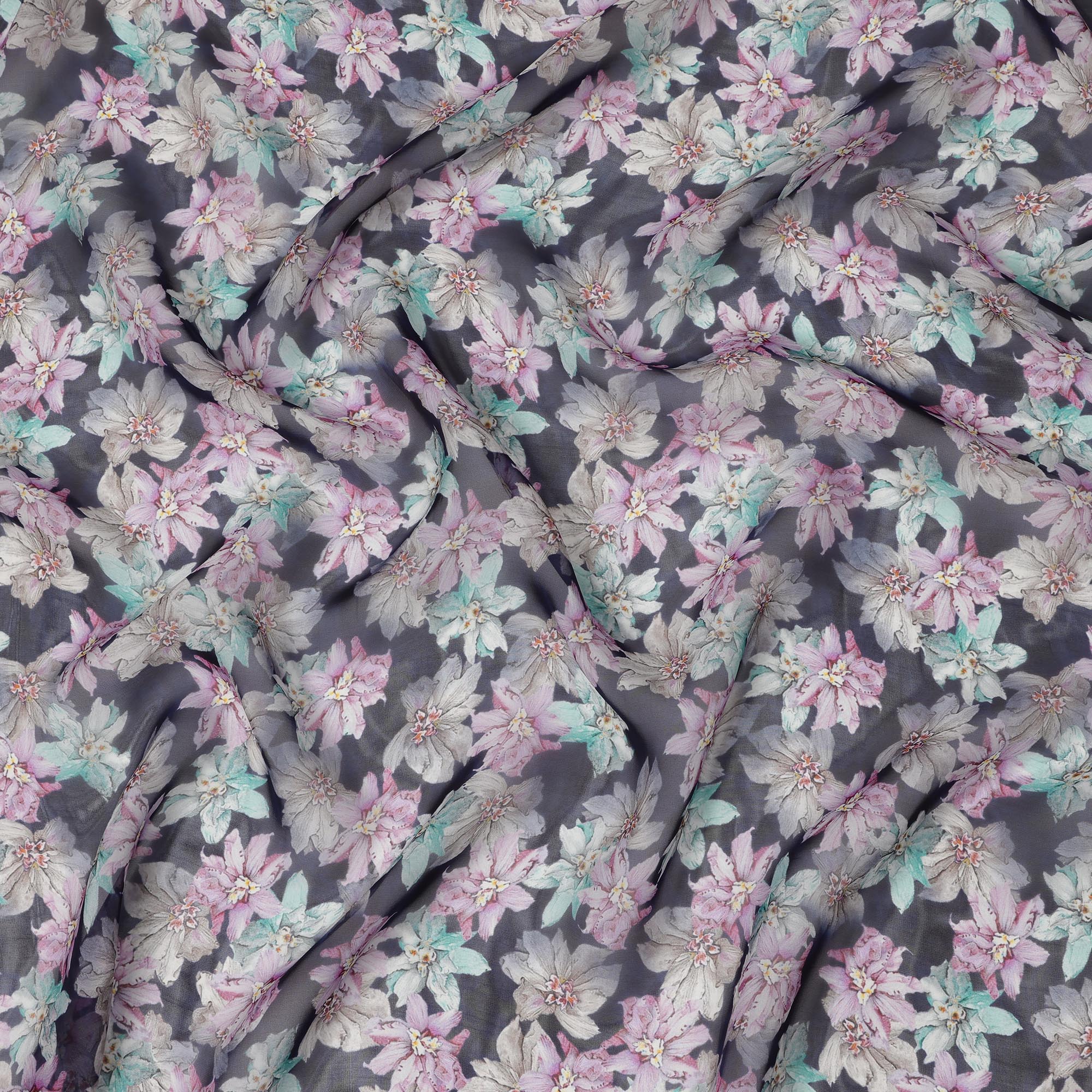 Charcoal Grey Multicolor Floral Printed Synthetic Organza Fabric with Pink, Aqua and Ivory Blooms, Width 110 Cms, Made in India-D23338