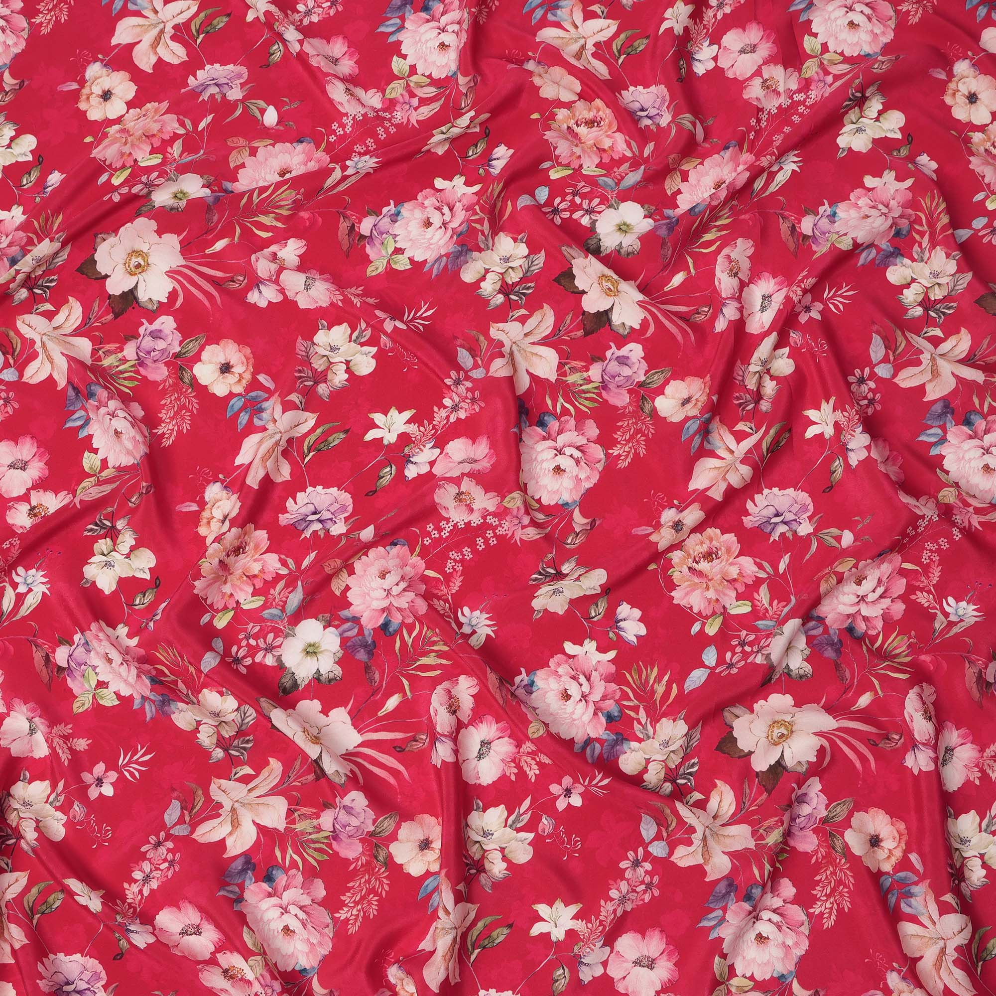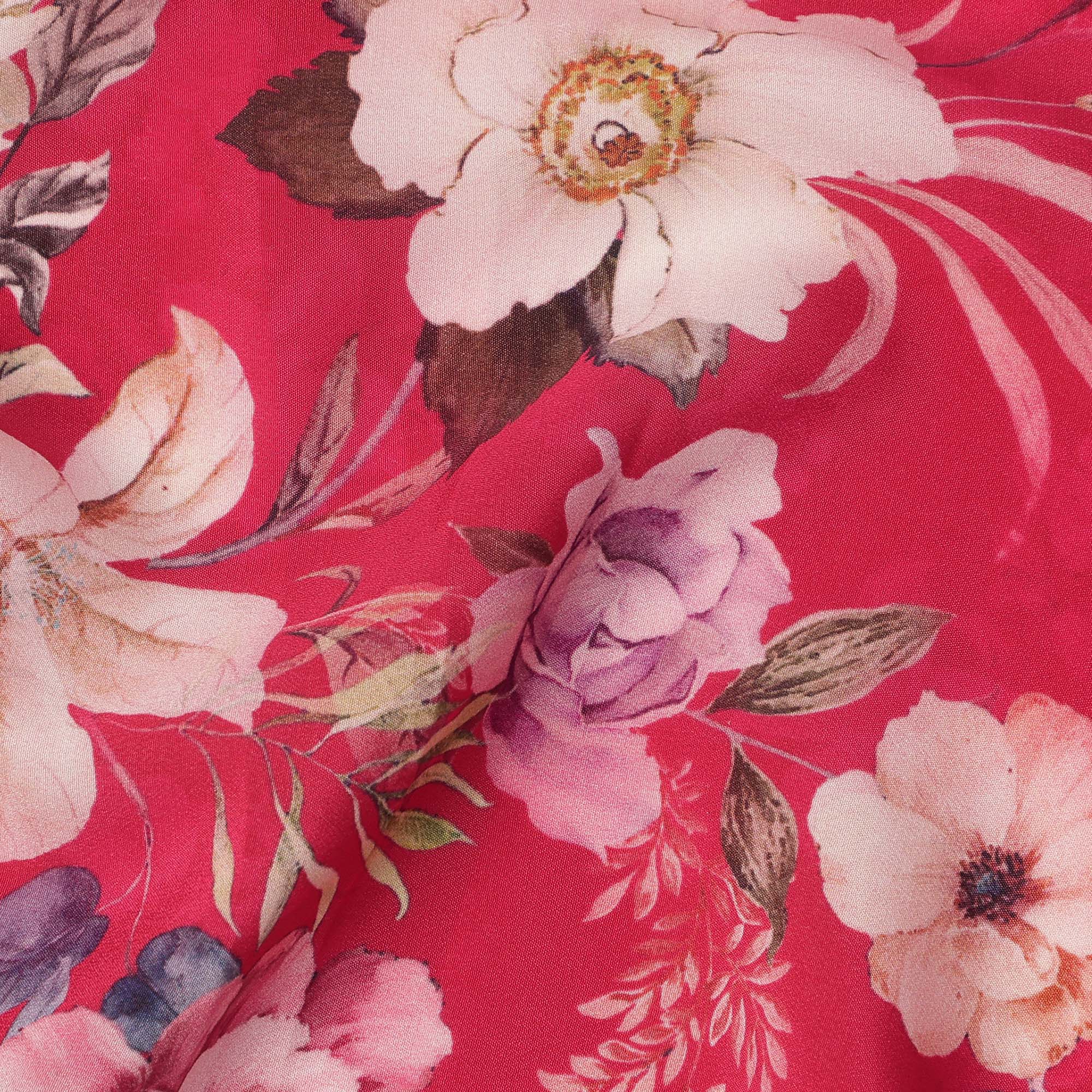 Cherry Red Base Multicolor Botanical Garden Floral Printed Pure Silk Crepe Fabric, 110 Cms Width, Made in India-D23971