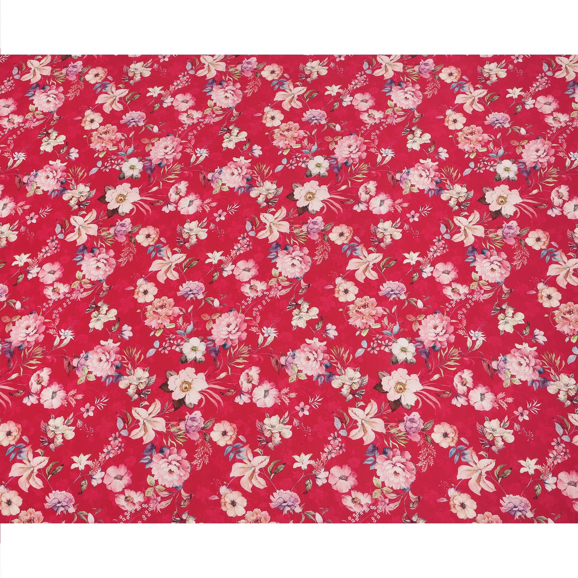 Cherry red base with digitally printed garden-style floral design in soft multicolor tones