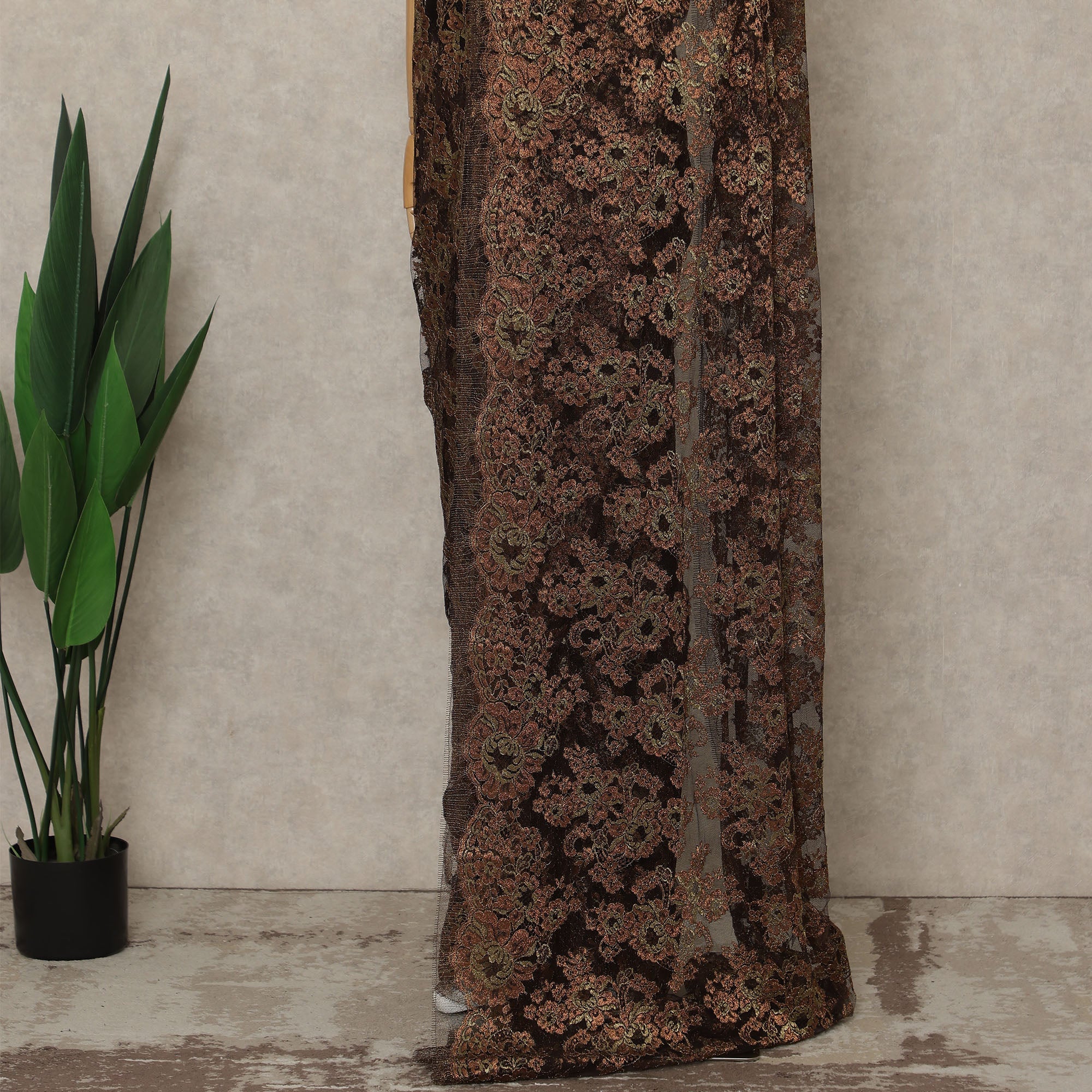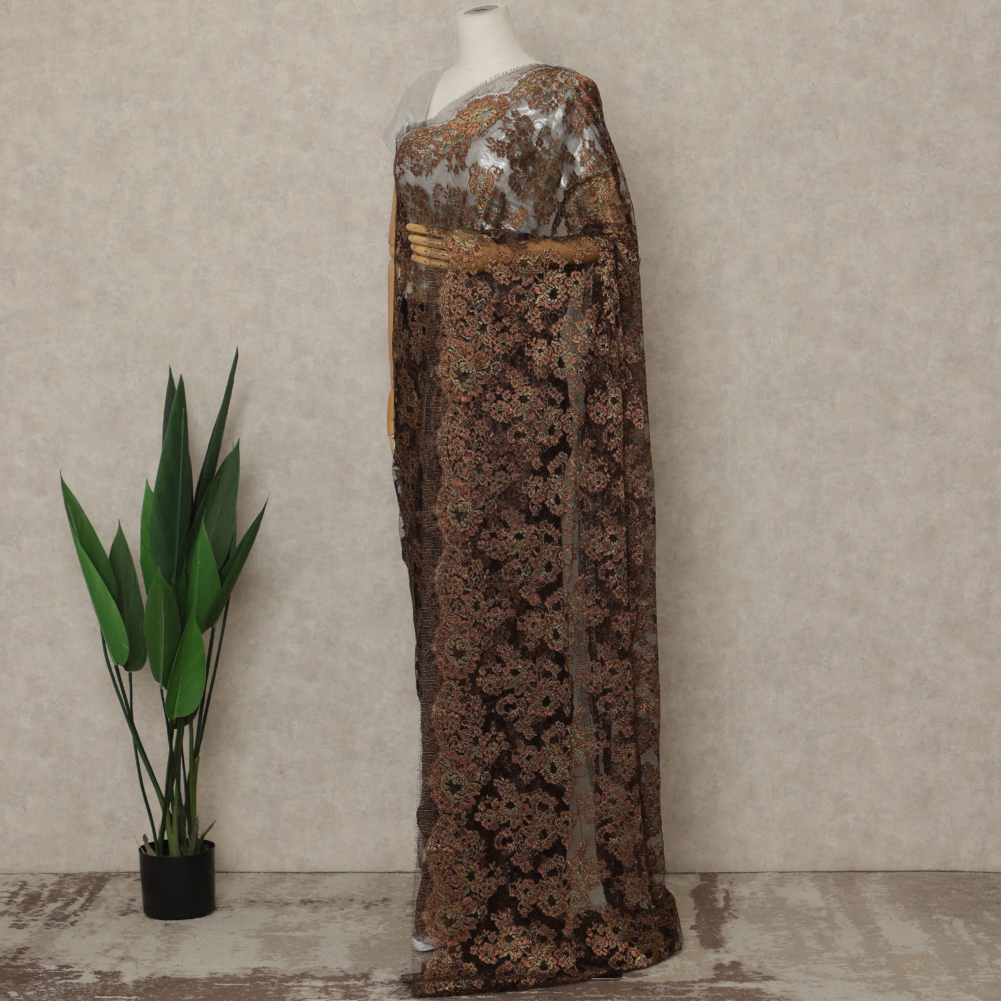Chocolate Brown Premium French Metallic Chantilly Saree Lace, 5.5 Mtrs Length, 110 Cms Width, Crafted in France -Blouse Not Included-D26732
