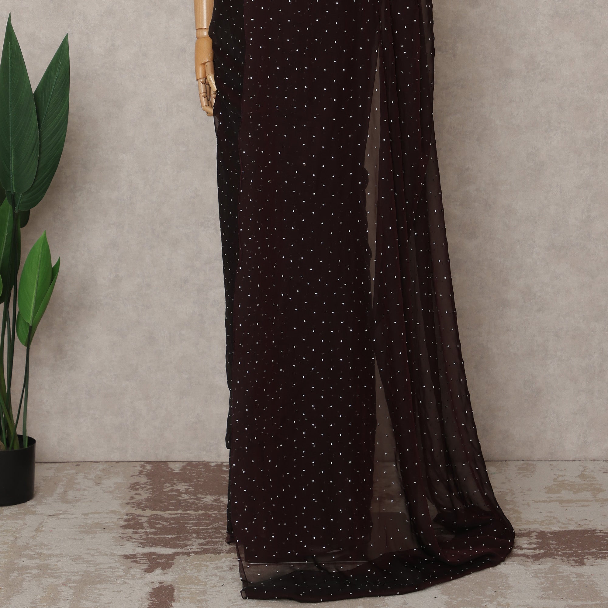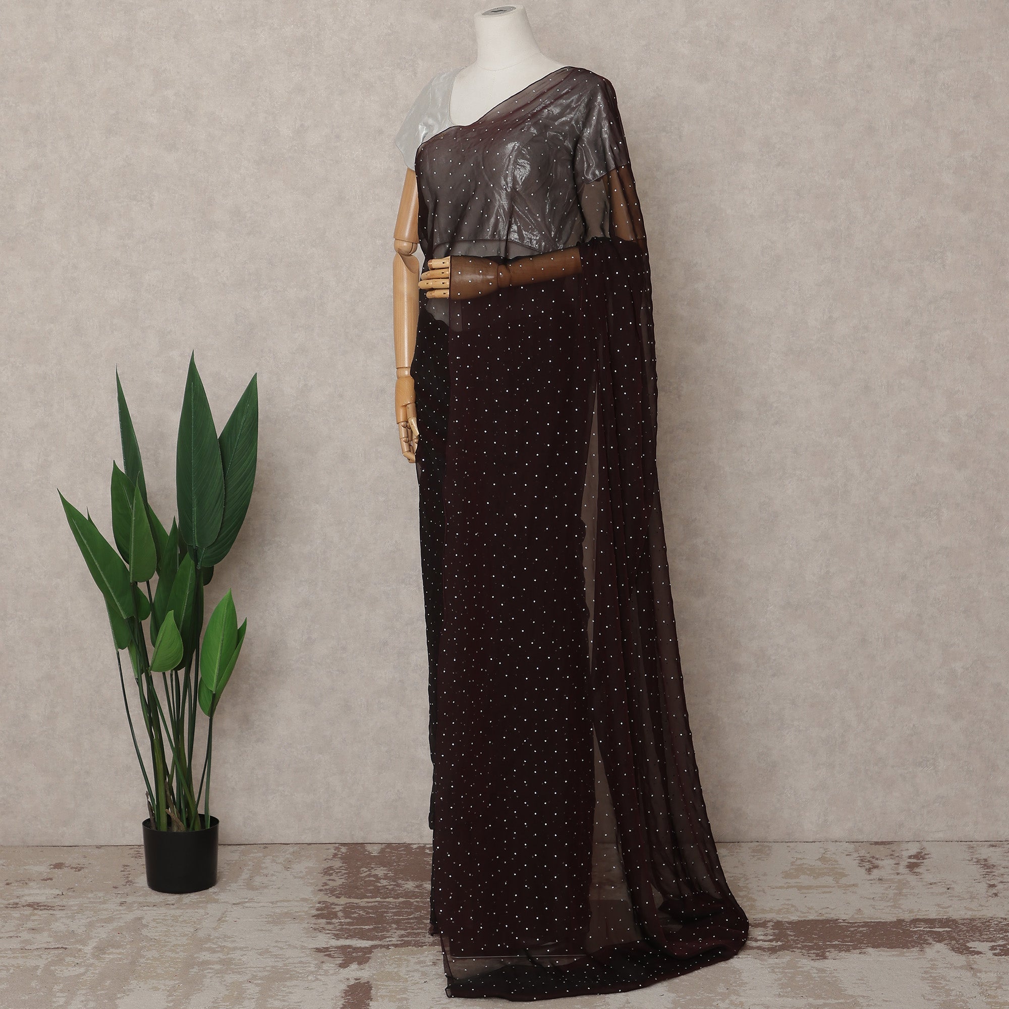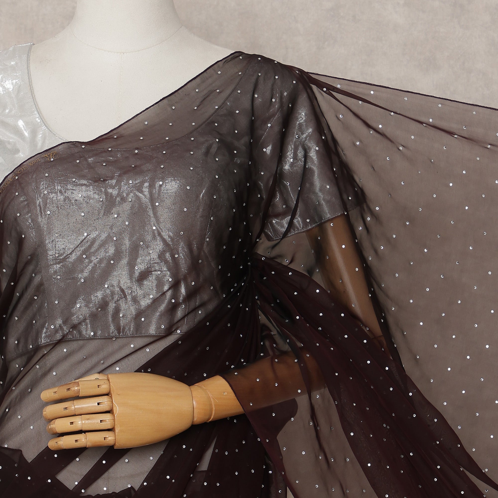 Chocolate Brown Premium Pure Silk Chiffon Saree with Stone Work, 5.5 Mtrs with 110 Cms Width, Imported from South Korea-D25440