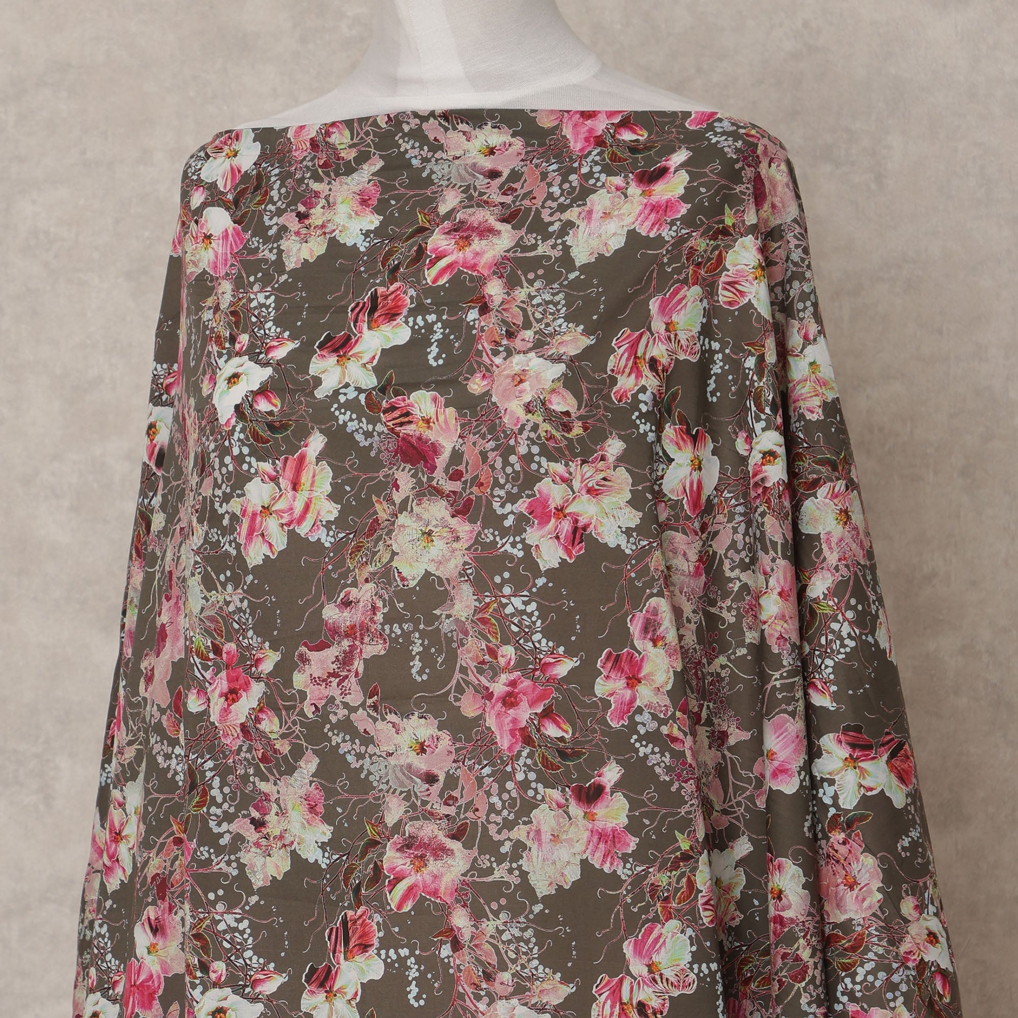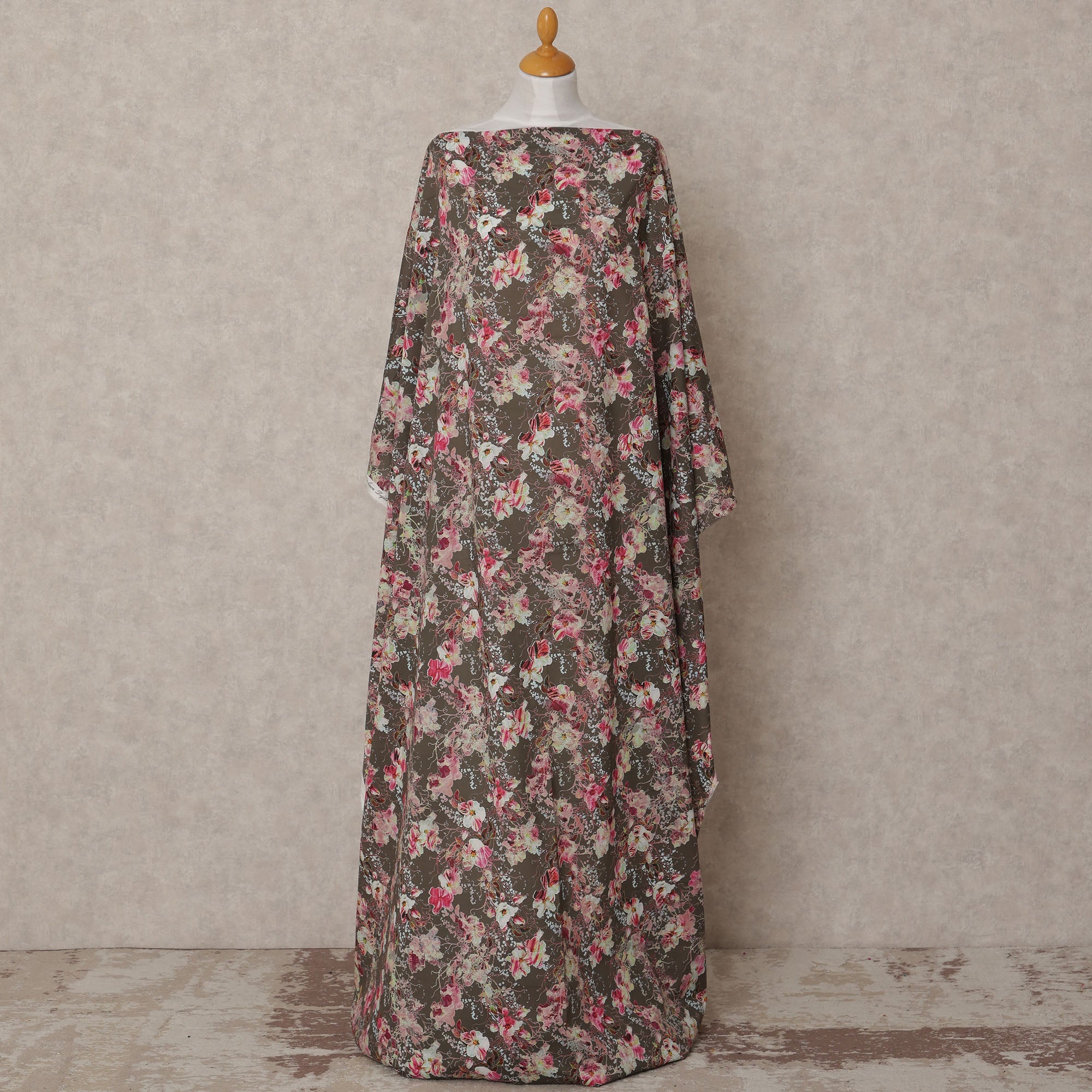 Chocolate Brown Somali Cotton Voile Printed Dirac Fabric with Pink Floral Pattern, 3.5 Mtrs, Width 140 Cms, Made in India-D24059