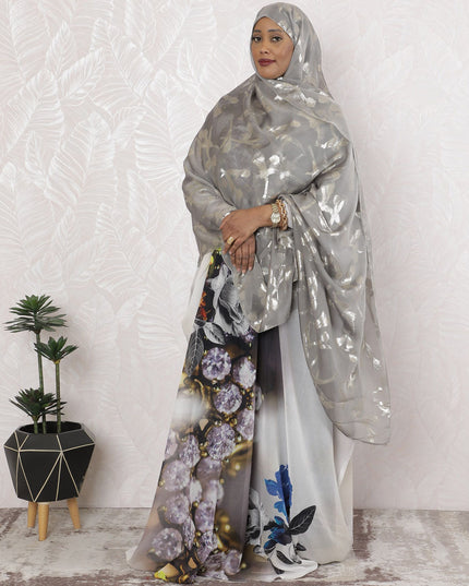 Embrace timeless elegance with our classic silver pure silk chiffon Garbasaar, exquisitely crafted in the textile mills of South Korea. Measuring 110cm in width and available in a 2-meter piece, this fabric is a vision of refined beauty. It features a serene silver base enriched with golden motifs, offering a perfect balance of subtlety and splendor. The motifs catch the light to give a soft shimmer with every movement, adding depth and character to the fabric. Designed with the discerning tailor in mind, this silk chiffon is impeccable for creating flowing dresses, stately abayas, or traditional Somali Garbasaar. Its sumptuous feel and graceful fall ensure it drapes beautifully, creating a silhouette that is both striking and sophisticated.