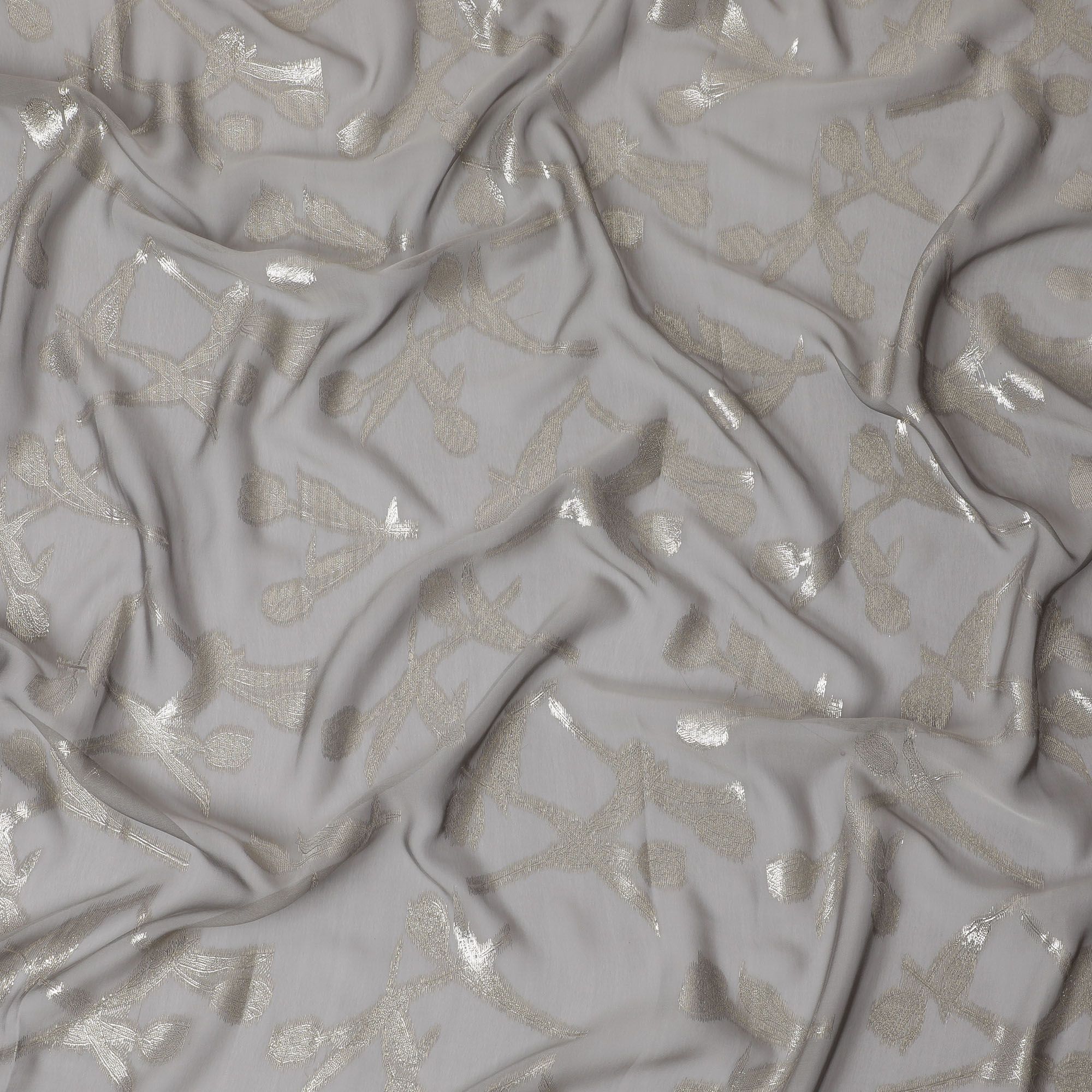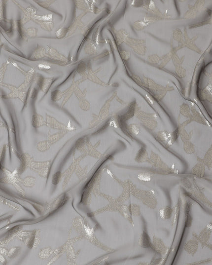 • Sale -25% Classic Silver Pure Silk Chiffon Fabric with Golden Motifs, 110cm Width - Traditional Garbasaar, Piece of 2.0 Mtrs-D18615