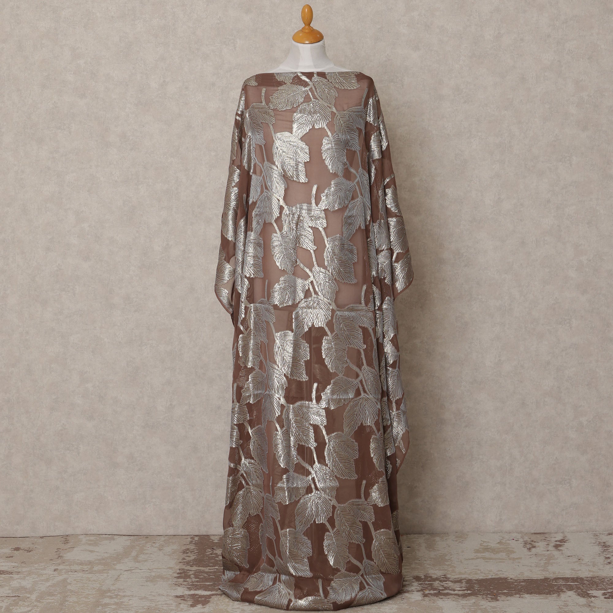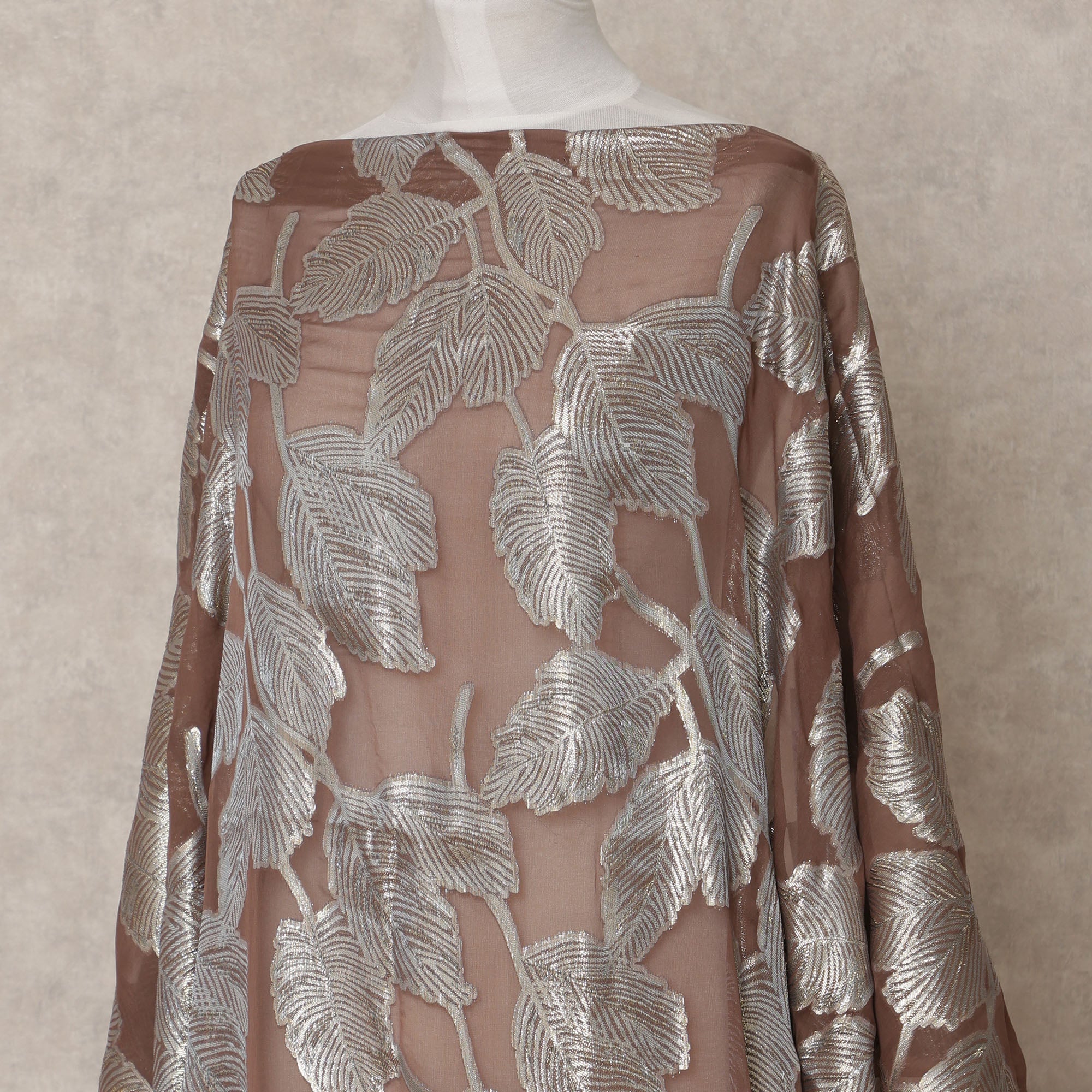 Rich coffee brown chiffon base enhanced with silver metallic leaf motifs