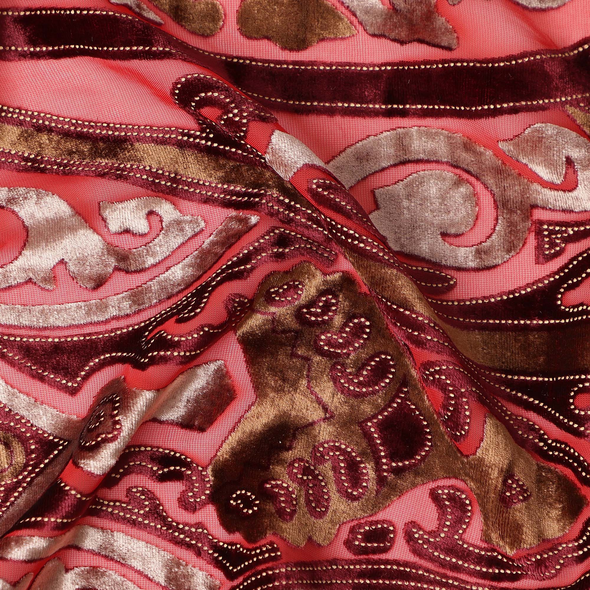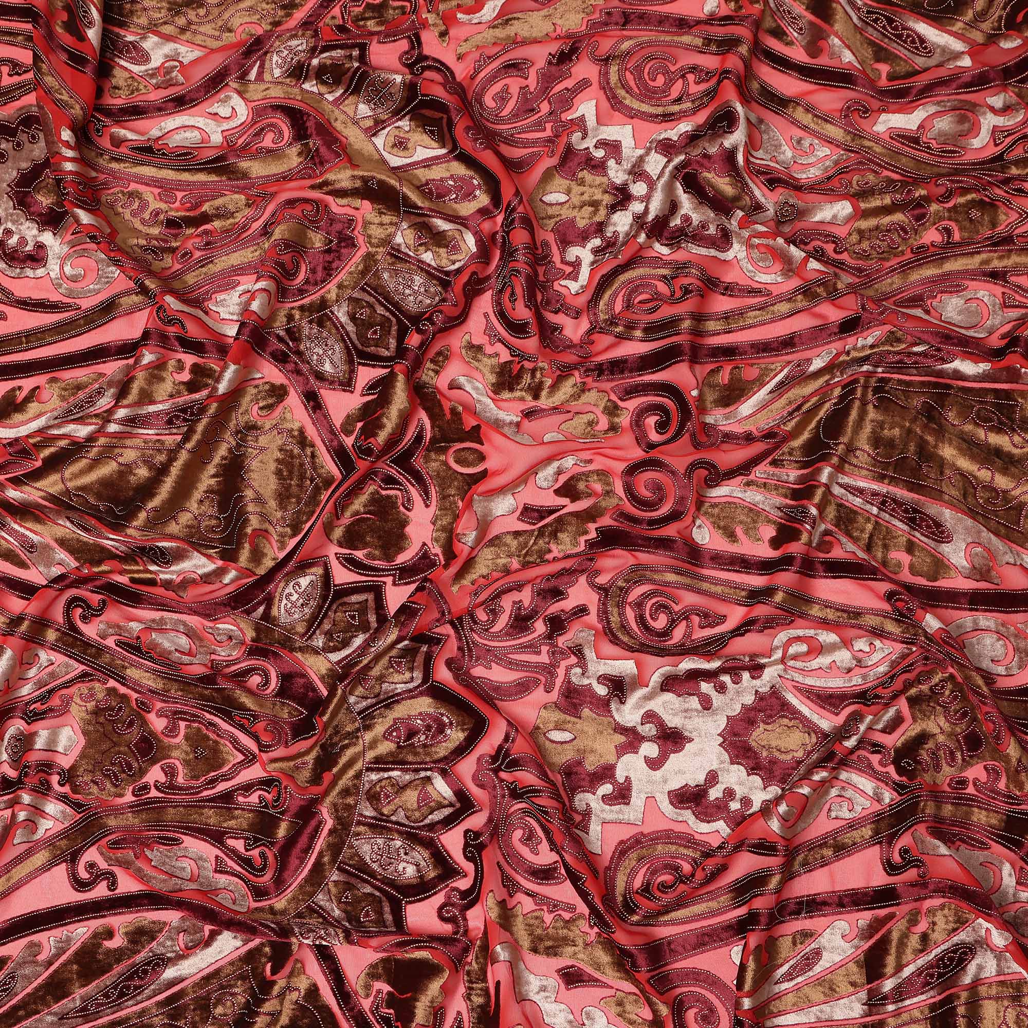 This coral pink and brown ornamental paisley printed synthetic burnout chiffon velvet fabric blends vibrant color with intricate detailing for... Read more Read more