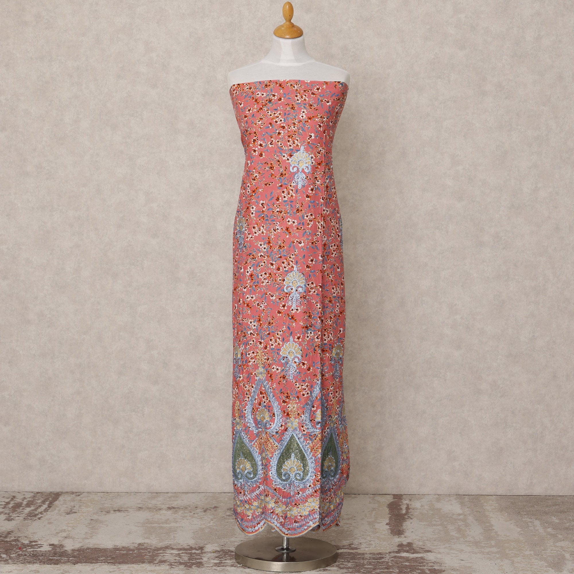 • Coral Red Printed Blended Cotton Fabric with Blue & Green Embroidered Paisley Border, 130 Cms Width, 3.0 Mtrs Length, Made in India-D24142