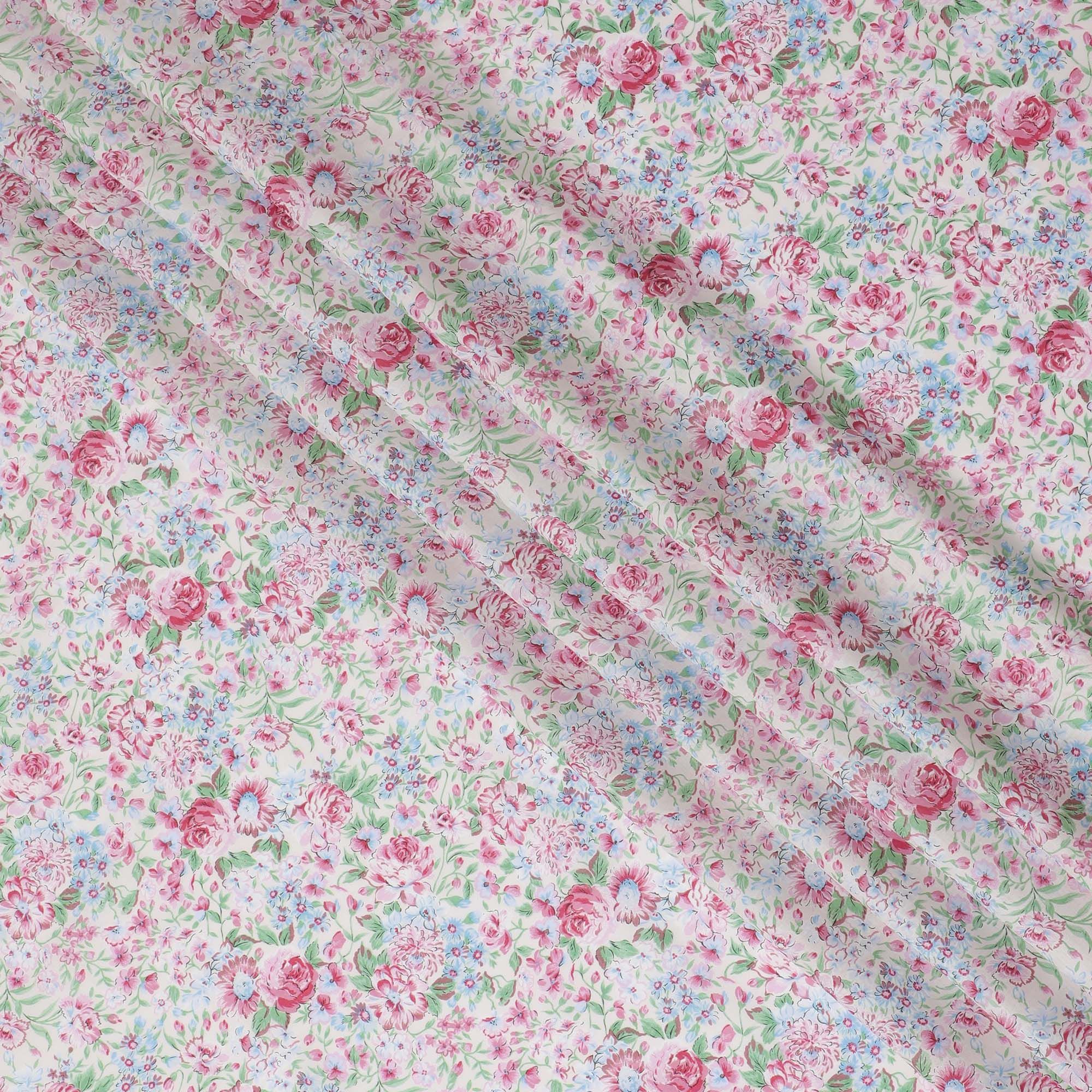Immerse yourself in the charm of the countryside with our Country Blossom Cotton Lawn Fabric. This enchanting fabric features a fresh, digital floral print with a medley of roses and wildflowers in shades of pink and blue, nestled amidst lush greenery. The high-resolution digital printing captures every detail on the feather-light cotton lawn, creating a canvas that's as delightful to the touch as it is to the eye. Originating from India's renowned textile industry, this fabric boasts a 110 cm width, offering plenty of scope for your sewing projects. Whether you're crafting a breezy summer dress, a set of quaint kitchen curtains, or a cozy quilt, this fabric is perfect for those who love a floral flourish. Available for purchase online by the meter, let the Country Blossom print add a touch of floral joy to your creations.