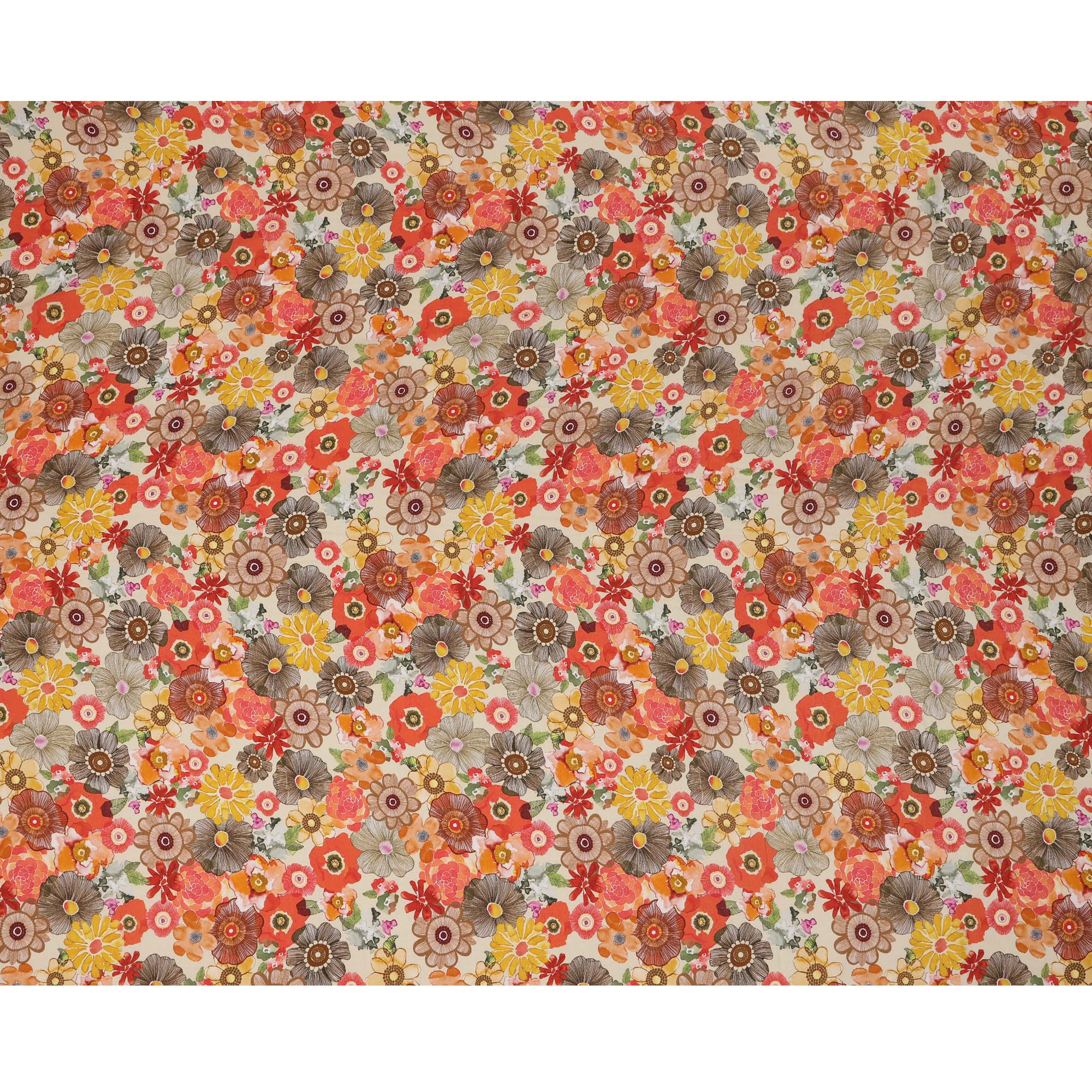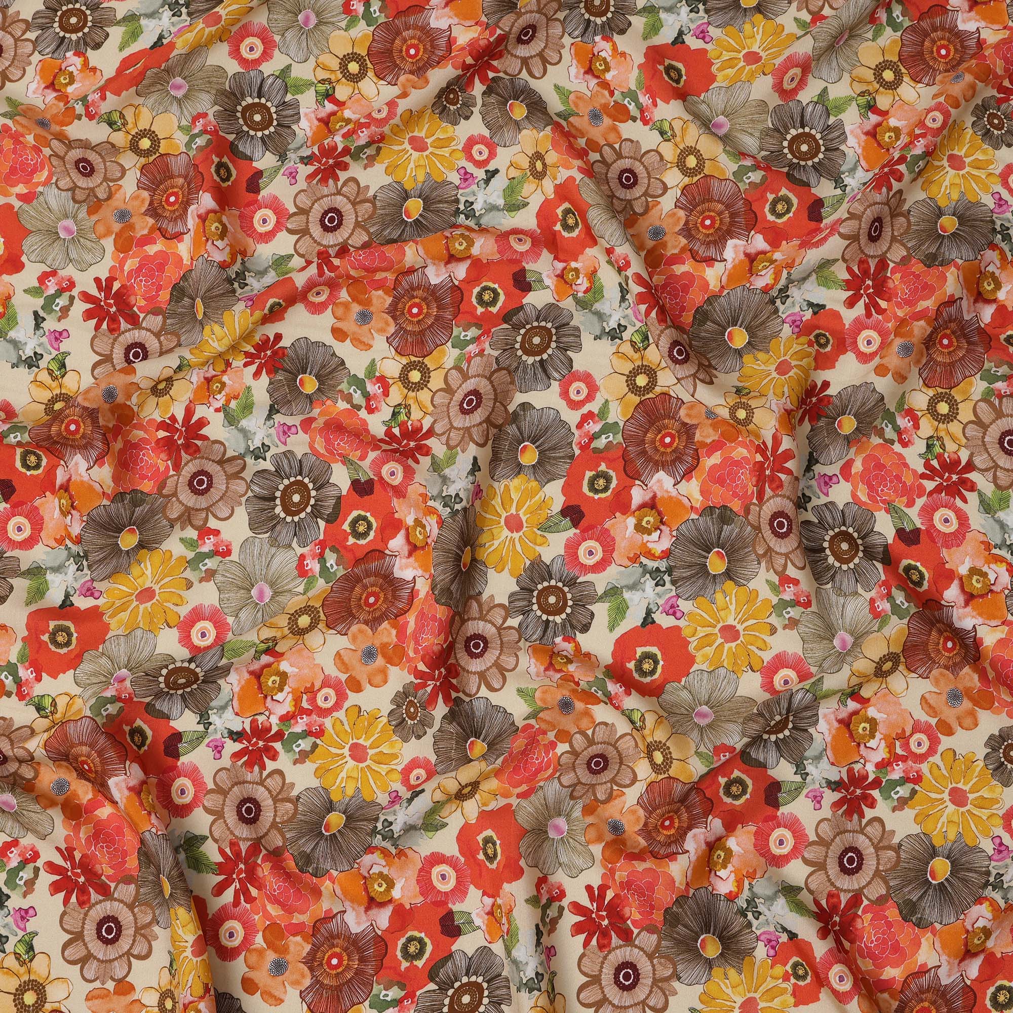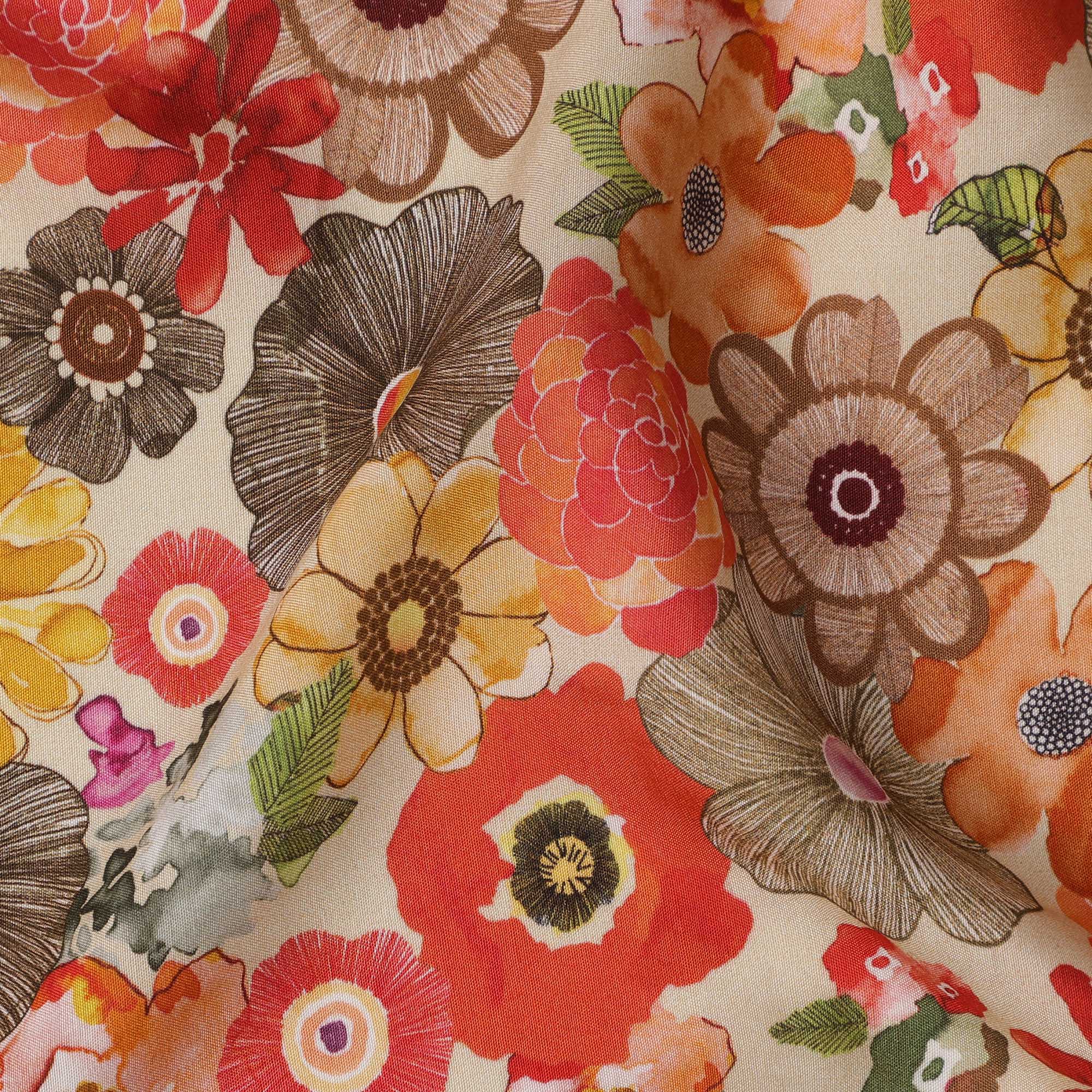 Cream viscose crepe fabric with bold retro floral print in orange, yellow, and brown tones
