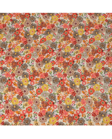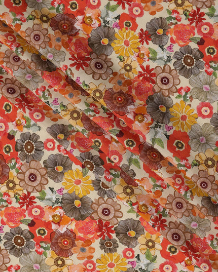 Cream Base with Orange, Yellow & Brown Retro Floral Print Viscose Crepe Fabric, 110 Cms Width, Made in India-D23002