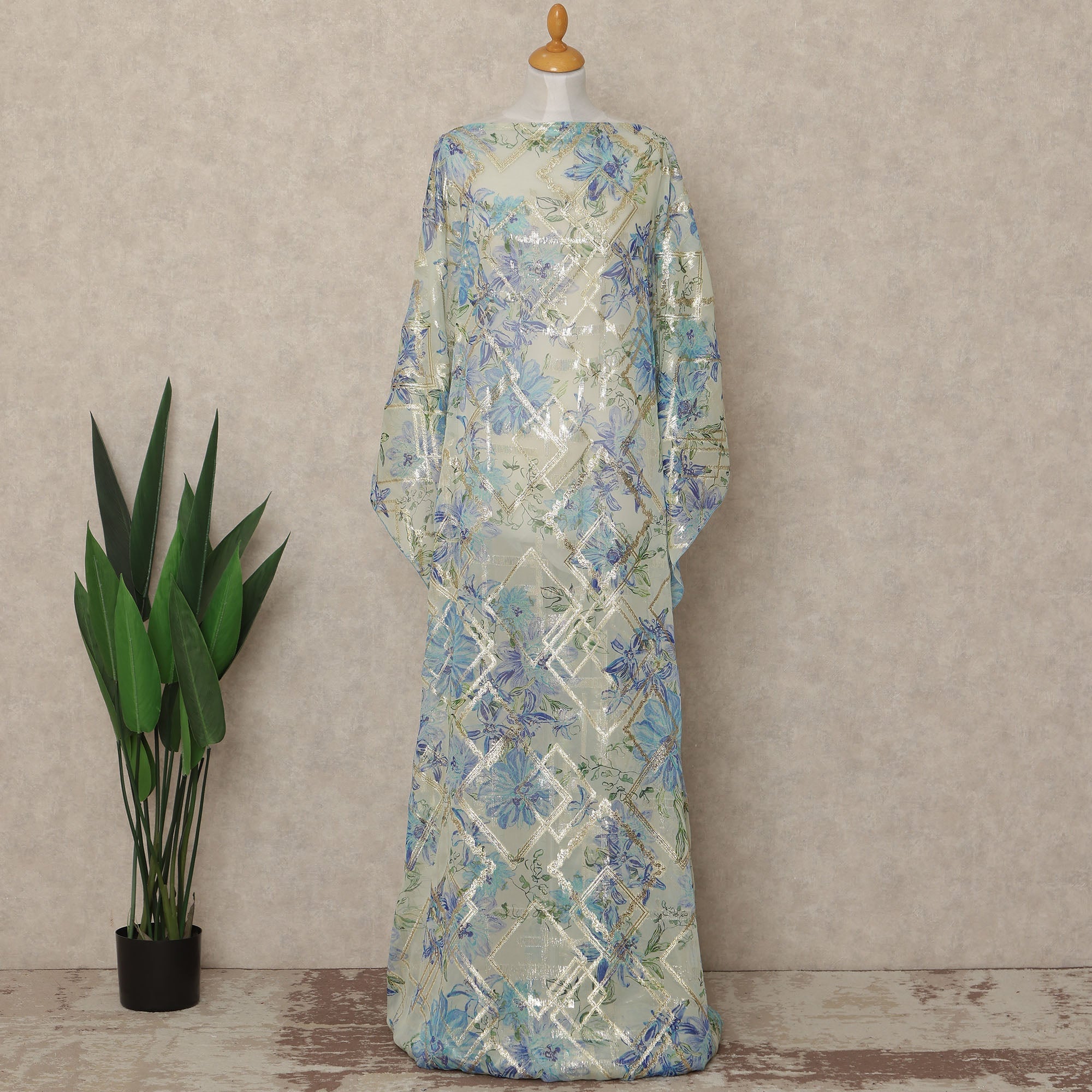 • Sale -10% Cream Blue Floral Traditional Somali Silk Chiffon Dirac Fabric With Metallic Lurex 3.5 Meters, 140 Cms Width, South Korea-D27716