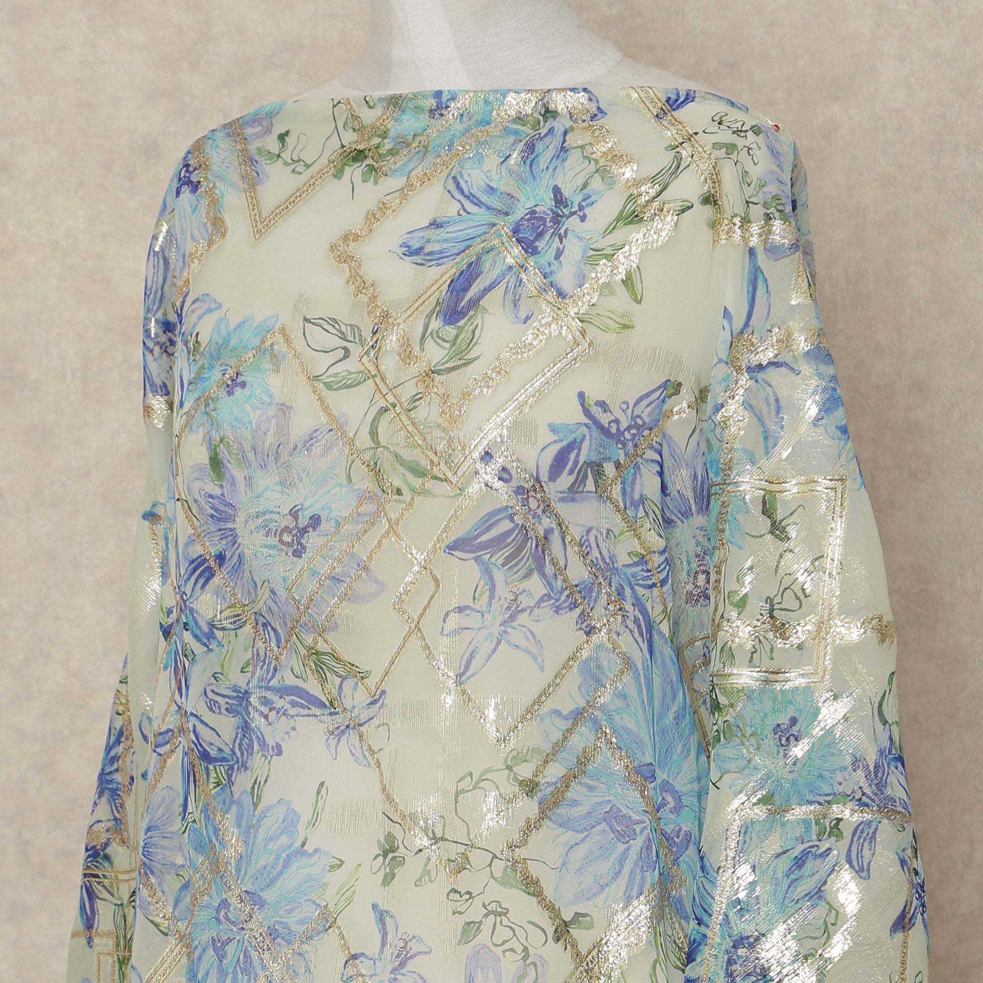 • Cream Blue Floral Traditional Somali Silk Chiffon Dirac Fabric With Metallic Lurex 3.5 Meters, 140 Cms Width, South Korea-D27716