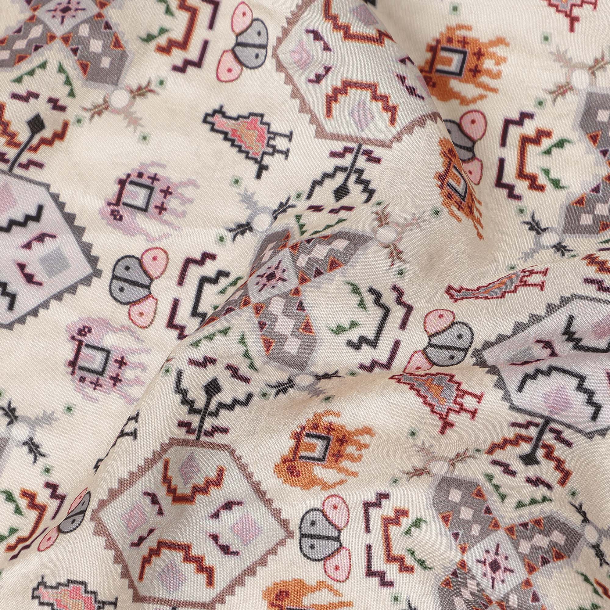 Cream Ethnic Geometric Printed Viscose Fabric 110 Cms Made In India-D27381
