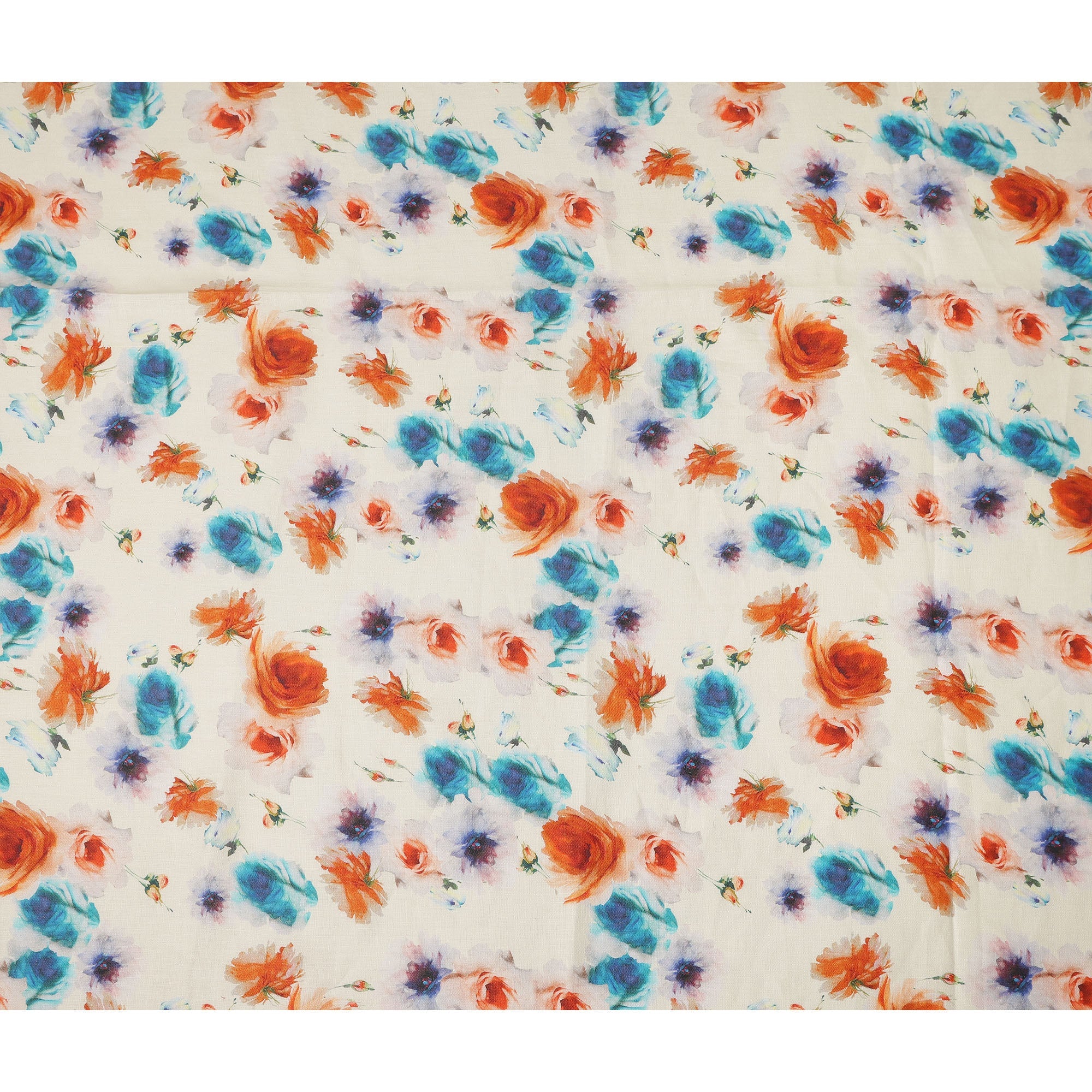 This cream premium Pure Pure Linen printed fabric showcases a graceful multicolor floral design featuring vibrant orange blossoms, soothing teal accents, and subtle violet highlights delicately scattered across a soft neutral base. Crafted in India, the fabric offers the natural breathability and textured elegance that Pure Pure Linen is known for, making it a perfect choice for both stylish apparel and refined home décor accents. The light cream background enhances the watercolor inspired floral print, giving it a fresh, airy appeal suitable for dresses, tunics, shirts, skirts, and statement furnishings. With its smooth finish and structured yet fluid drape, this 140 cms wide Pure Pure Linen fabric ensures comfort, durability, and versatility for contemporary and classic creations alike.