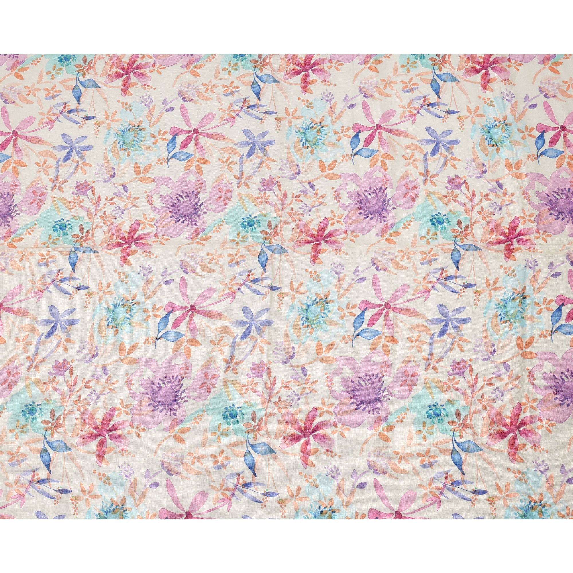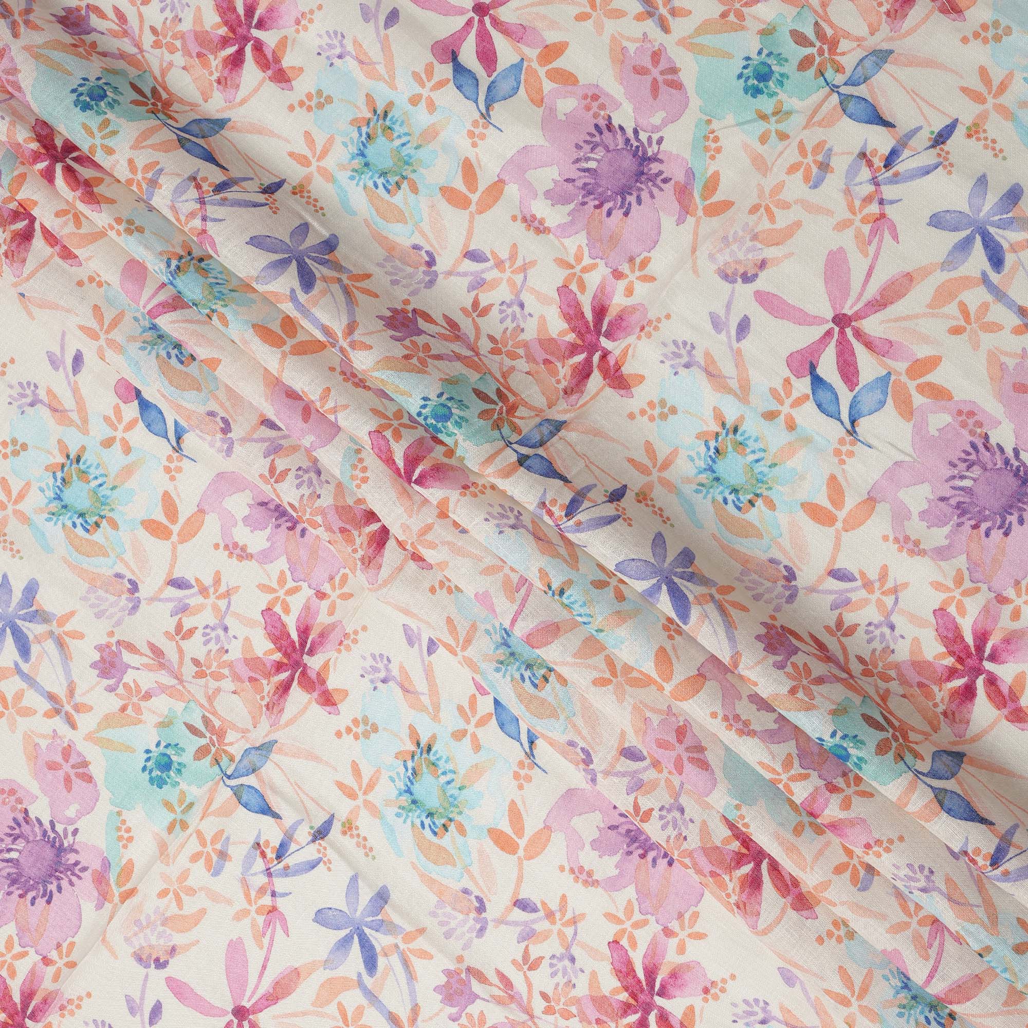 Cream Multicolor Floral Watercolor Print Blended Linen Fabric, 110 Cms Width, Made in India-D26190
